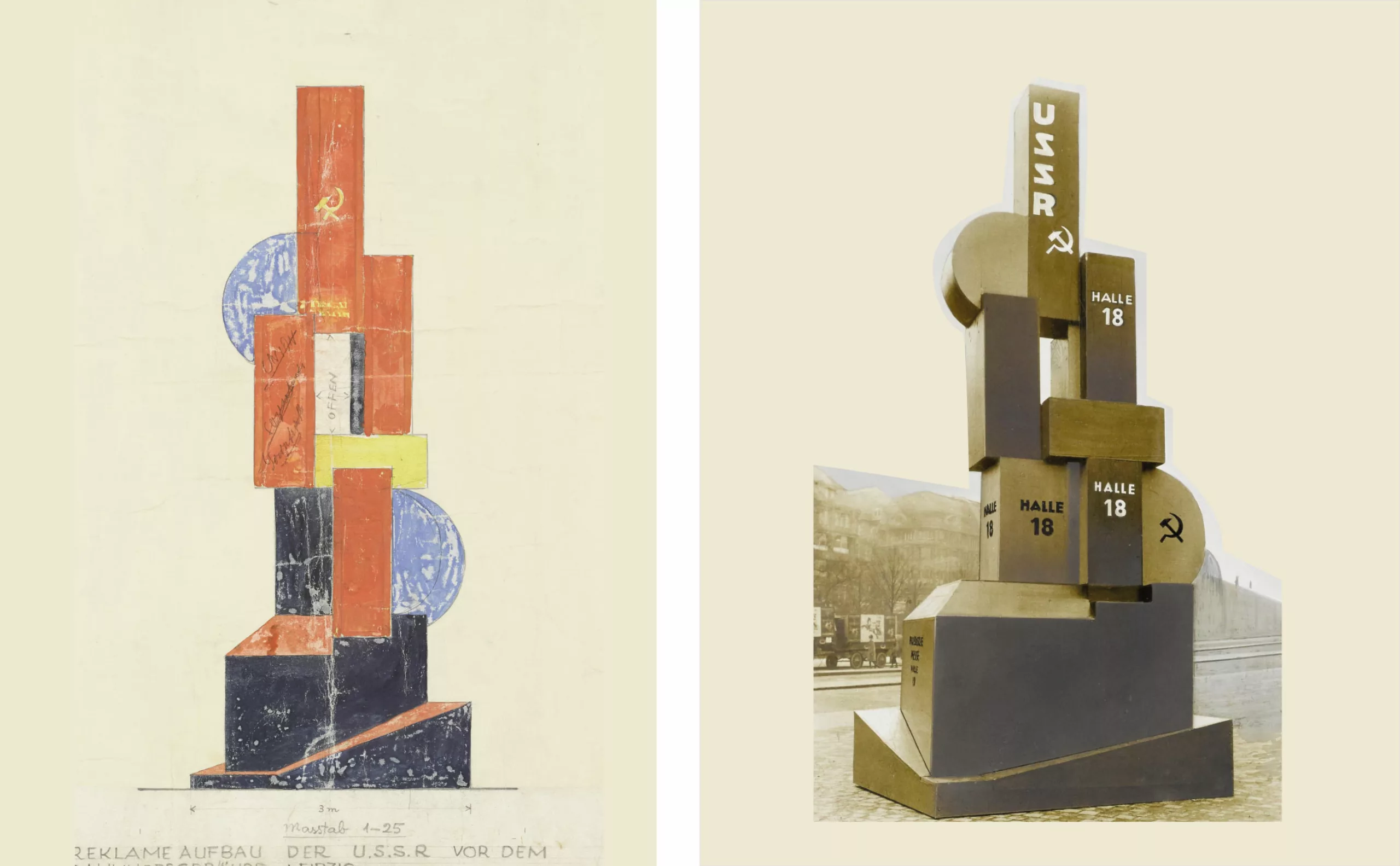 John Heartfield ne se contente pas d’exprimer son art en 2D, dans sa longue carrière il réalisera également quelques monuments ou scénographies. Comme-ci dessus un monument pour l’Union Soviétique à la foire de Leipzig en 1927. Un inspiration qui n’aurait déplue à la signalétique modulaire que l’on a pu concevoir pour la ville de Rethel.