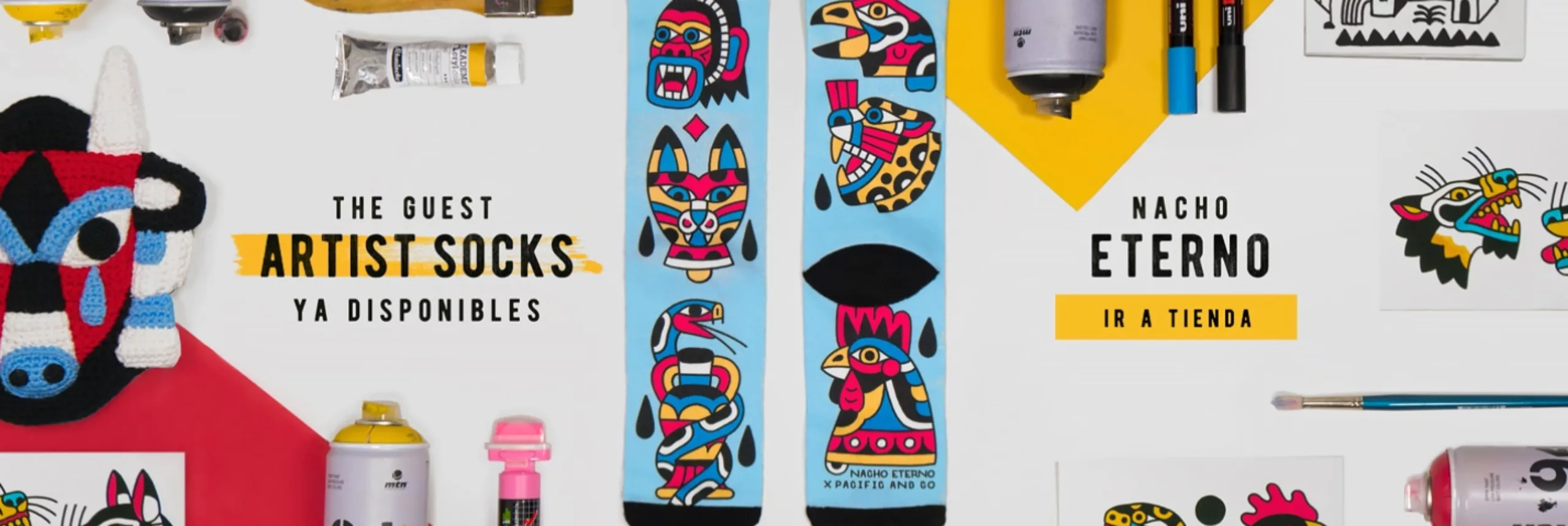 “All my socks are dope” (toutes mes chaussettes claquent). Conçues à Barcelone, les chaussettes Pacificandco allient design et qualité, avec des matières techniques ou bio. Elles sont designées en interne et font parfois l’objet de collaborations avec des artistes ou designers, comme avec Nacho Eterno, illustrateur et artiste tatoueur.