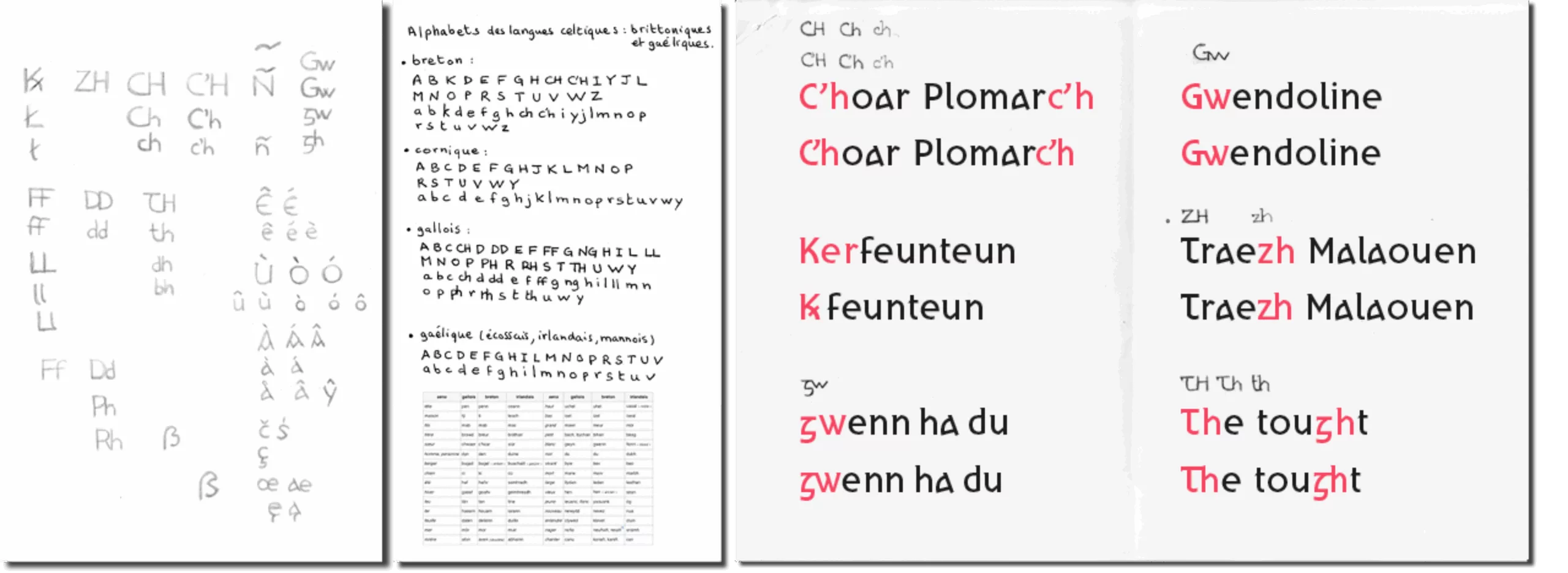« Il y a par exemple le “c’h”, le “gw” ou le “zh” pour qui j’ai créé des glyphes dédiés. Et puis, il existait cet autre signe sur lequel je me questionnais beaucoup : le fameux K barré. J’avais cette envie d’en faire un caractère spécifique car il revenait de façon récurrente dans différents documents que j’avais pu observer, retrace celui qui souhaitait, par là même, tordre le cou à certaines idées reçues. On a souvent présenté le breton comme une langue de tradition orale, qu’elle n’était pas vraiment écrite. Cela est inexact. L’écrit le plus ancien en breton est antérieur au premier écrit en français : il s’agit du manuscrit de Leyde, conservé à l’Université de Leiden aux Pays-Bas. Il date de la fin du 8e siècle, plus âgé de quelques dizaines d’années que le premier écrit français. »