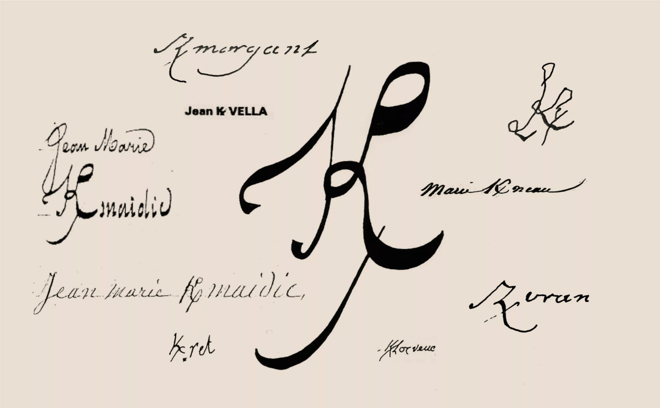 La lettre K suivie d’un slash, soit la forme détournée d’une lettre de l’alphabet breton aujourd’hui oubliée : le Ꝃ« Il s’agit d’un signe diacritique, éclaire le Finistérien Yann Riou, ethnolinguiste et auteur d’une étude sur le sujet. C’est une lettre de l’alphabet français sur laquelle il y a un signe ajouté, à savoir une barre sur le jambage. Avant 1900, ce “K barré” était utilisé pour orthographier les noms commençant par Ker. C’est ainsi que, par exemple, le nom de famille Kergall s’écrivait KGall dans les registres de naissance, mariage, décès ou baptême. »