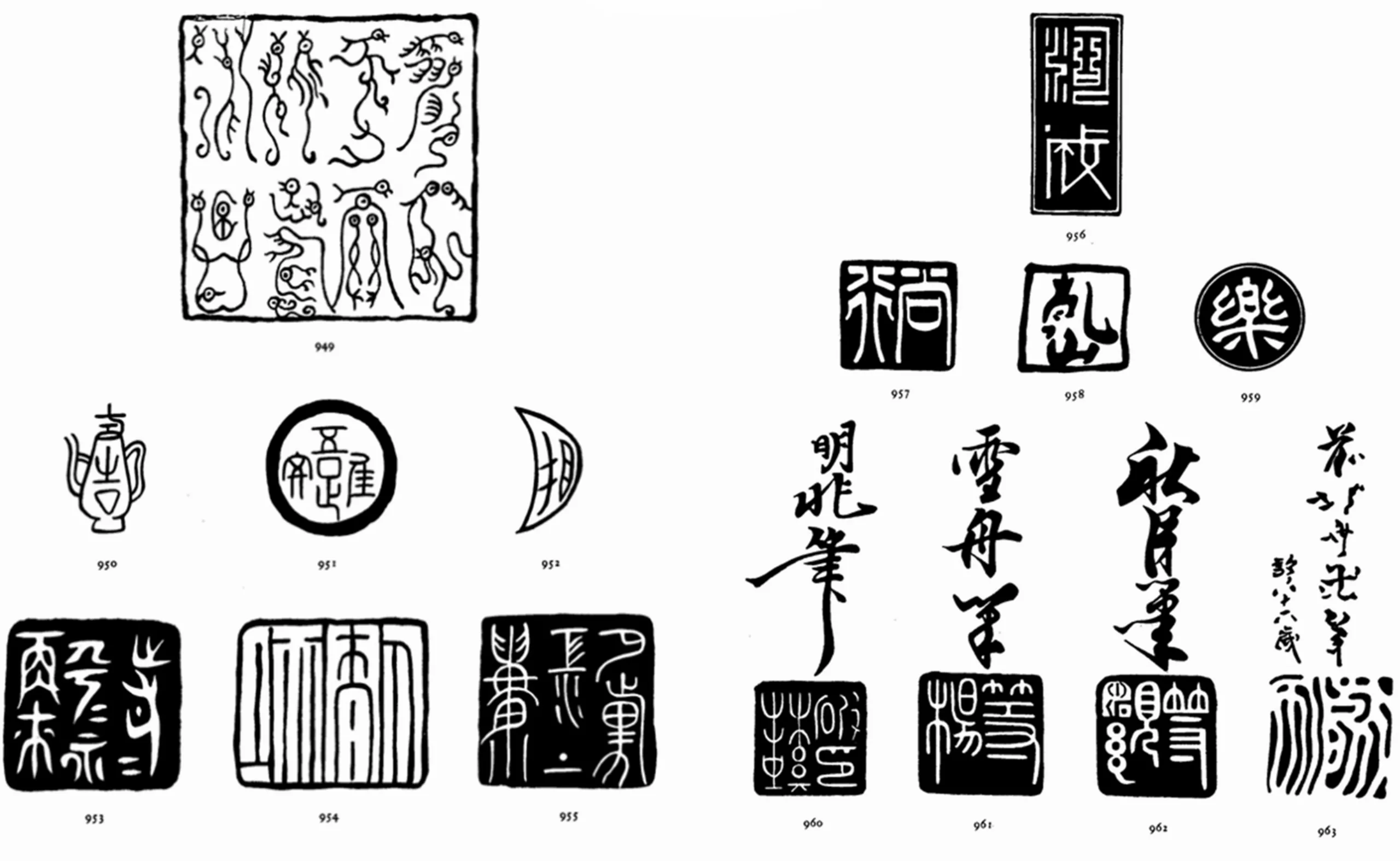 On voit que suivant la culture (comme sur cette dernière planche : des sceaux chinois sur la gauche, -215 avant JC pour le 949, et japonais autour du 15e siècle, à droite) les marques ne s’expriment pas visuellement de la même manière, ce qui est dû aussi à leur support. Le “logo” d’un peintre ou celui d’un sculpteur ne pourra pas être pensé ni réalisé de la même façon à cause des exigences techniques du support. Le papier laisse bien plus de liberté et de facilités que la pierre.
