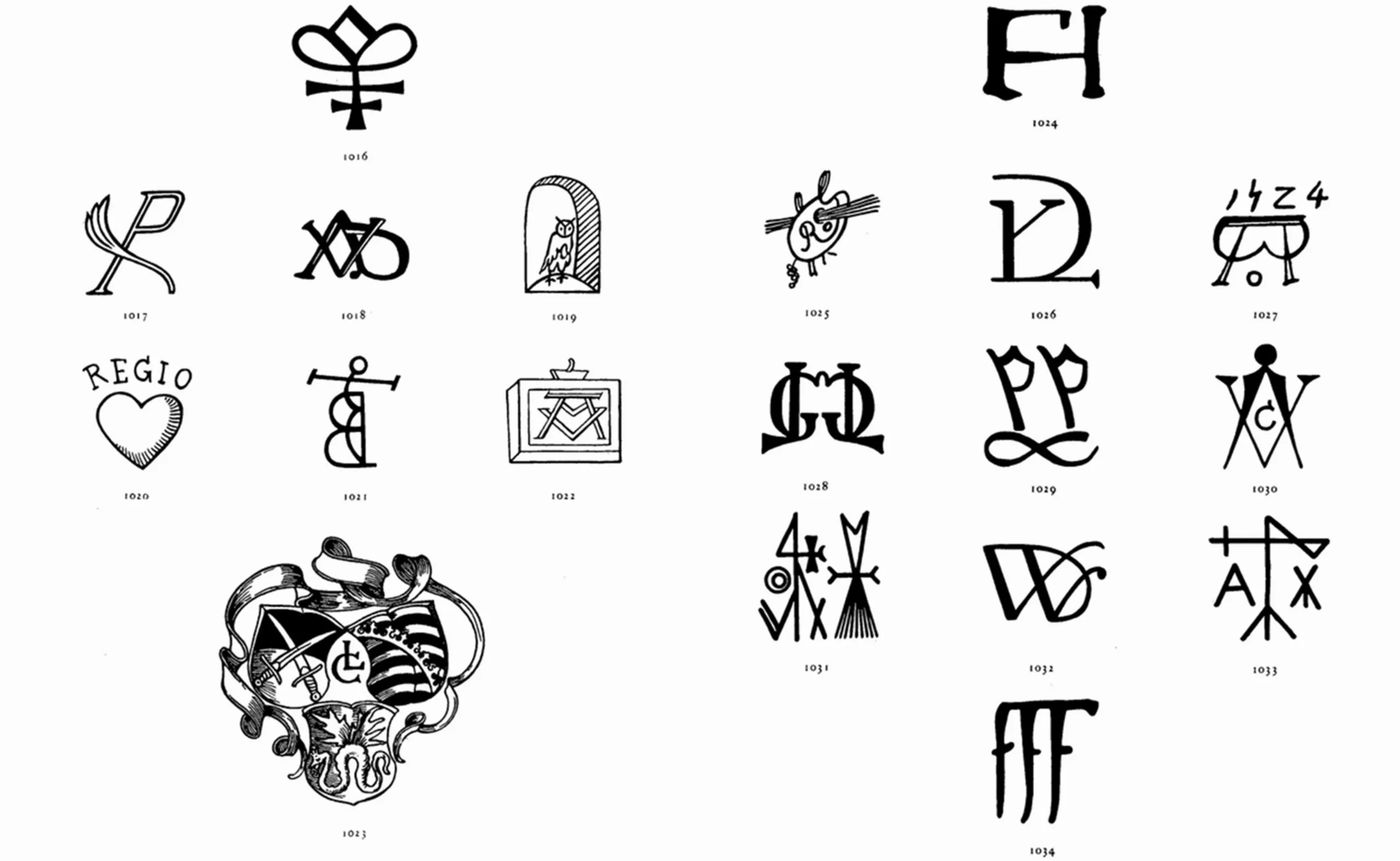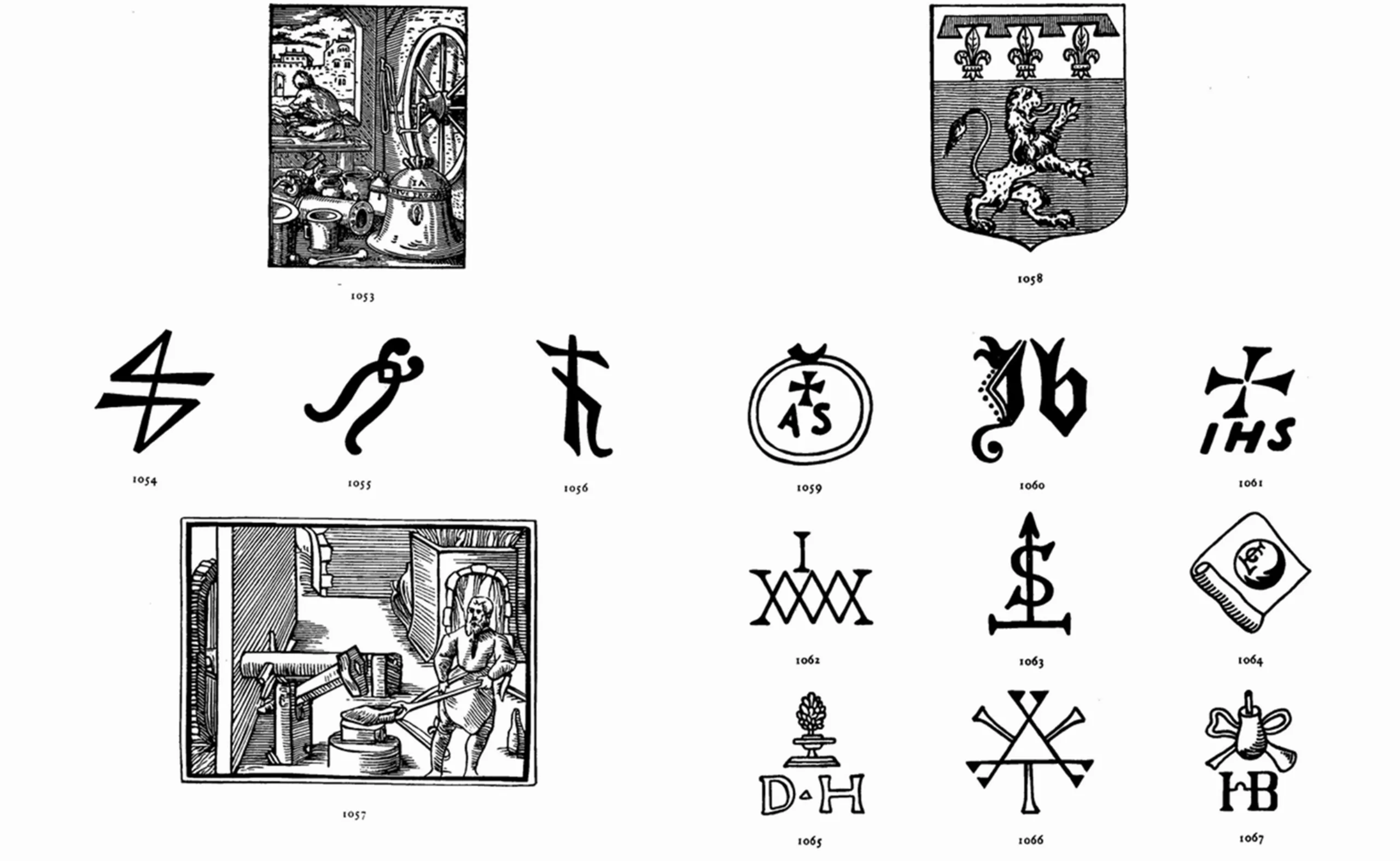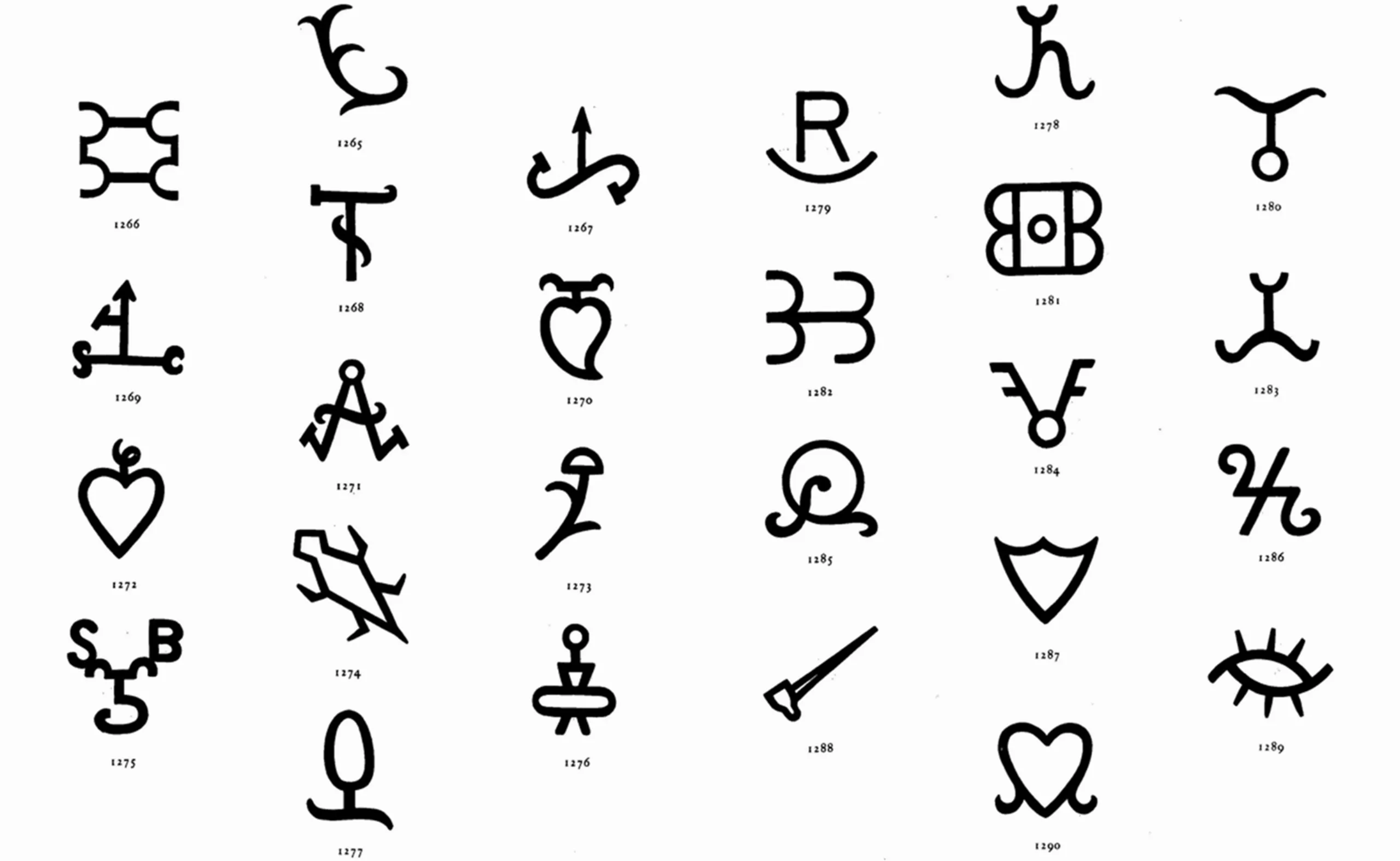 Ces visuels, extraits du livre Symbols, Signs & Signets de Ernst Lehner, 1950 (passionnant !), témoignent de la richesse de l’esthétisme et de la variété des monogrammes et marques des forgerons, peintres, tailleurs de pierres, marchants, éleveurs de chevaux (1096 à 1105) ou potiers, partout dans le monde. Ces sigles font parfois penser à de l’écriture cunéiforme ou à des motifs d’alchimie.
