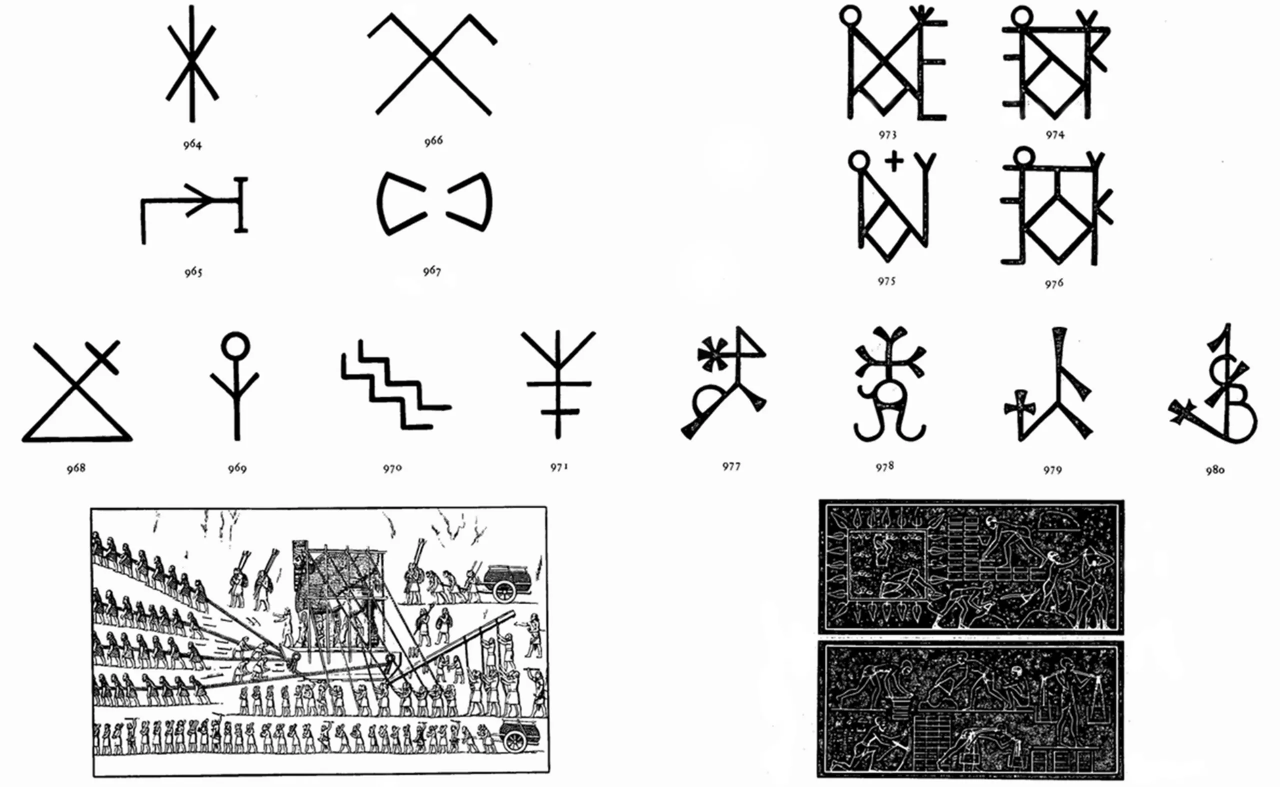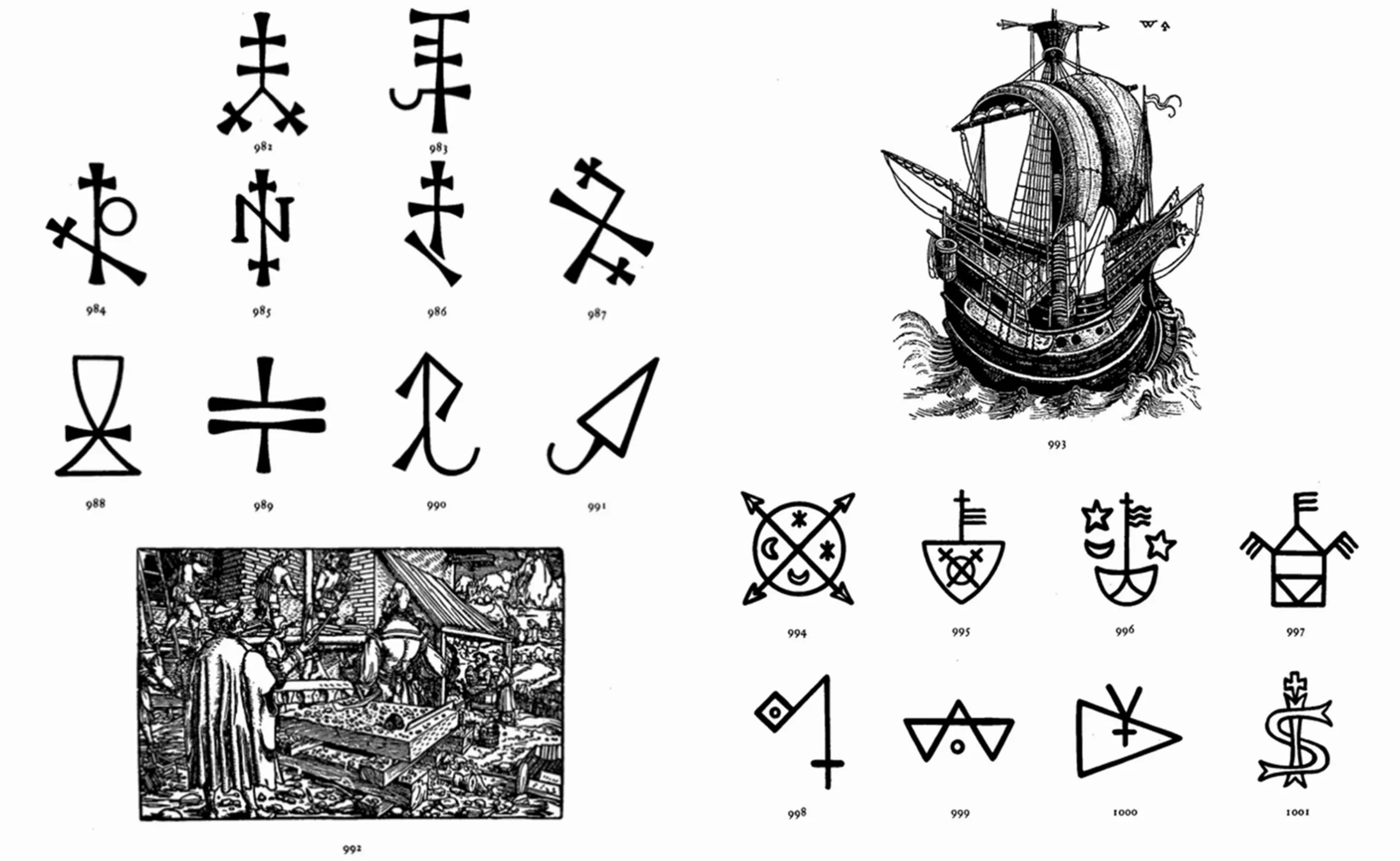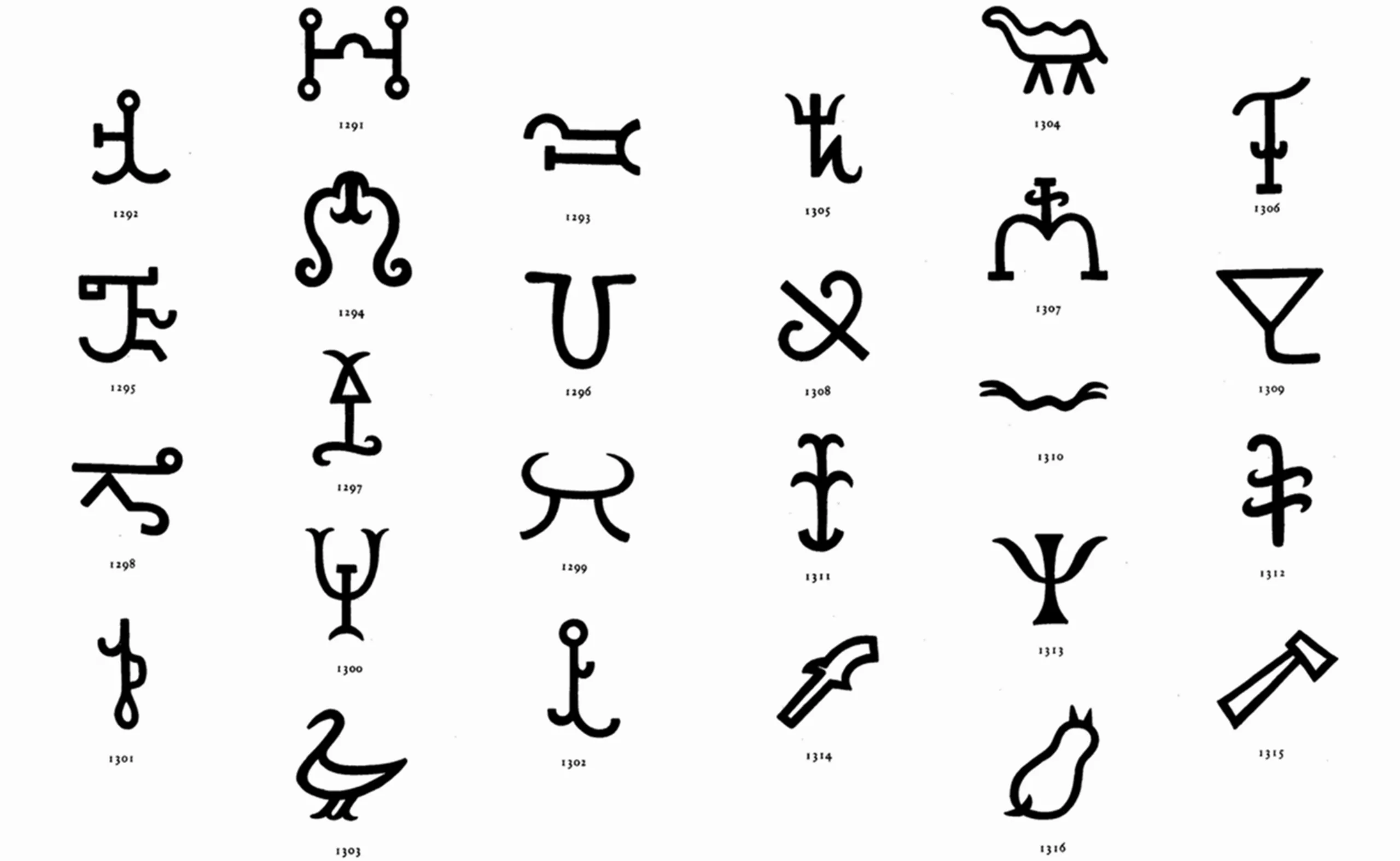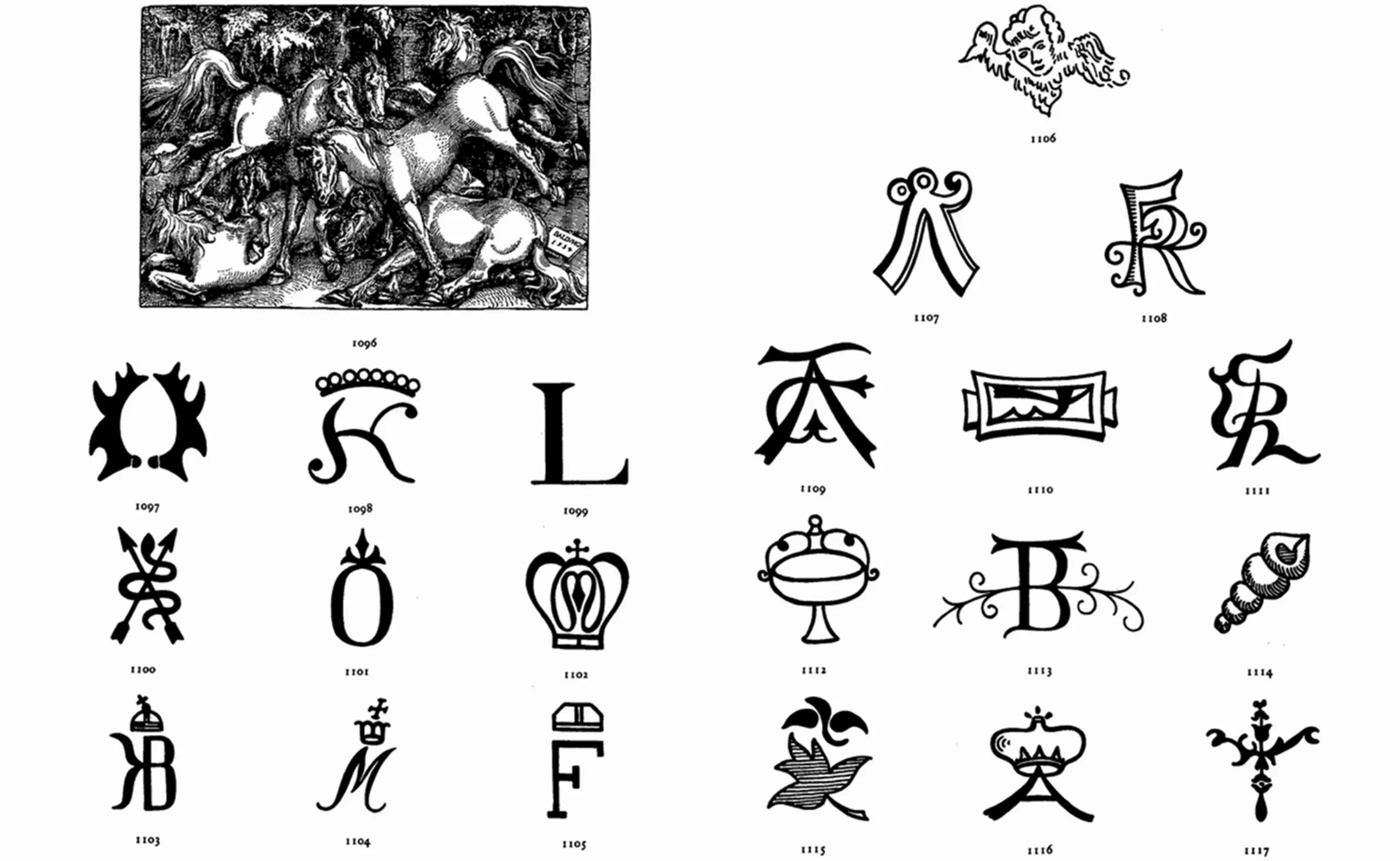 Ces visuels, extraits du livre Symbols, Signs & Signets de Ernst Lehner, 1950 (passionnant !), témoignent de la richesse de l’esthétisme et de la variété des monogrammes et marques des forgerons, peintres, tailleurs de pierres, marchants, éleveurs de chevaux (1096 à 1105) ou potiers, partout dans le monde. Ces sigles font parfois penser à de l’écriture cunéiforme ou à des motifs d’alchimie.
