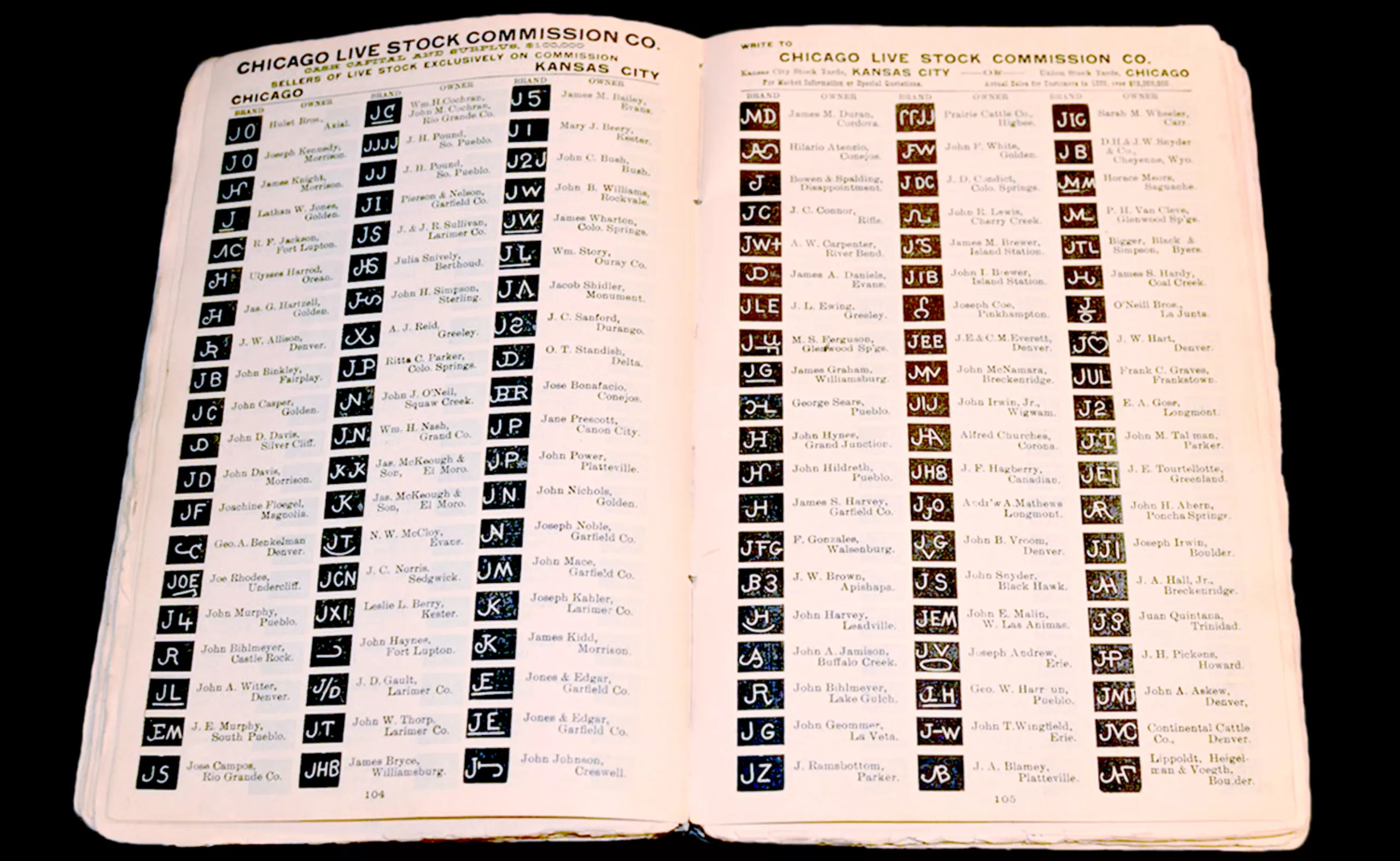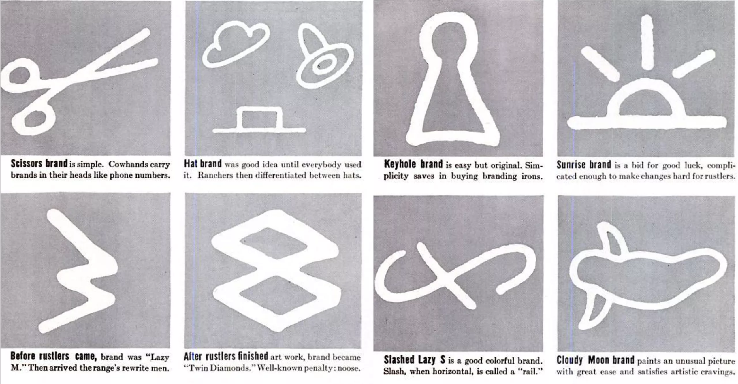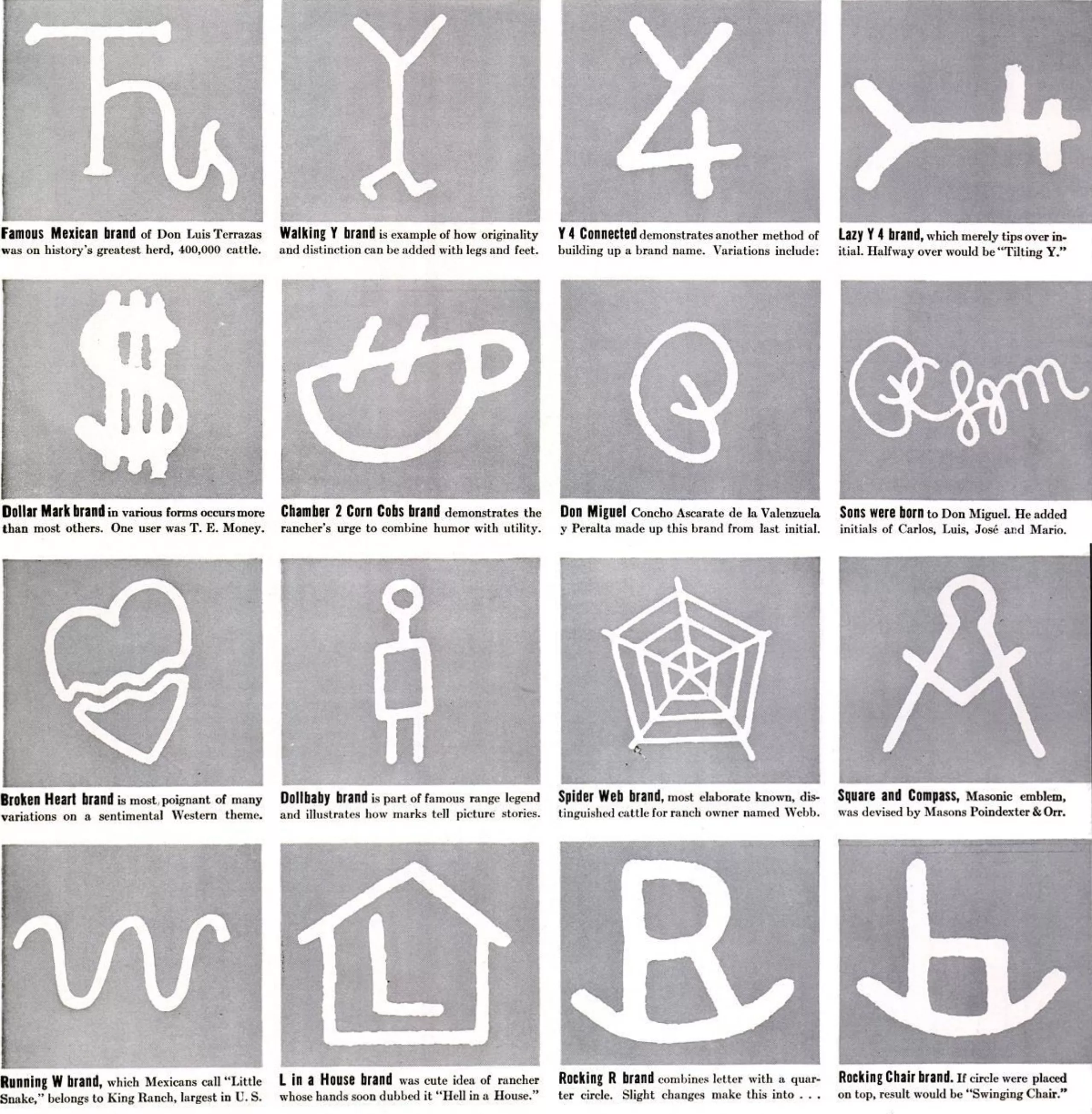 Avec cette augmentation, il faut les enregistrer dans un registre. Leur but principal étant d’éviter le vol, chaque sigle doit être connu des autorités. On parle alors vraiment de branding avec un cahier des charges, une charte graphique et un dépôt de nom et de logo. Ci-dessous, des marques de bétail tirées du livre Hot Irons : Heraldry of the Range, Oren Arnold, 1940 parus dans Life magazine du 10 juin 1940.