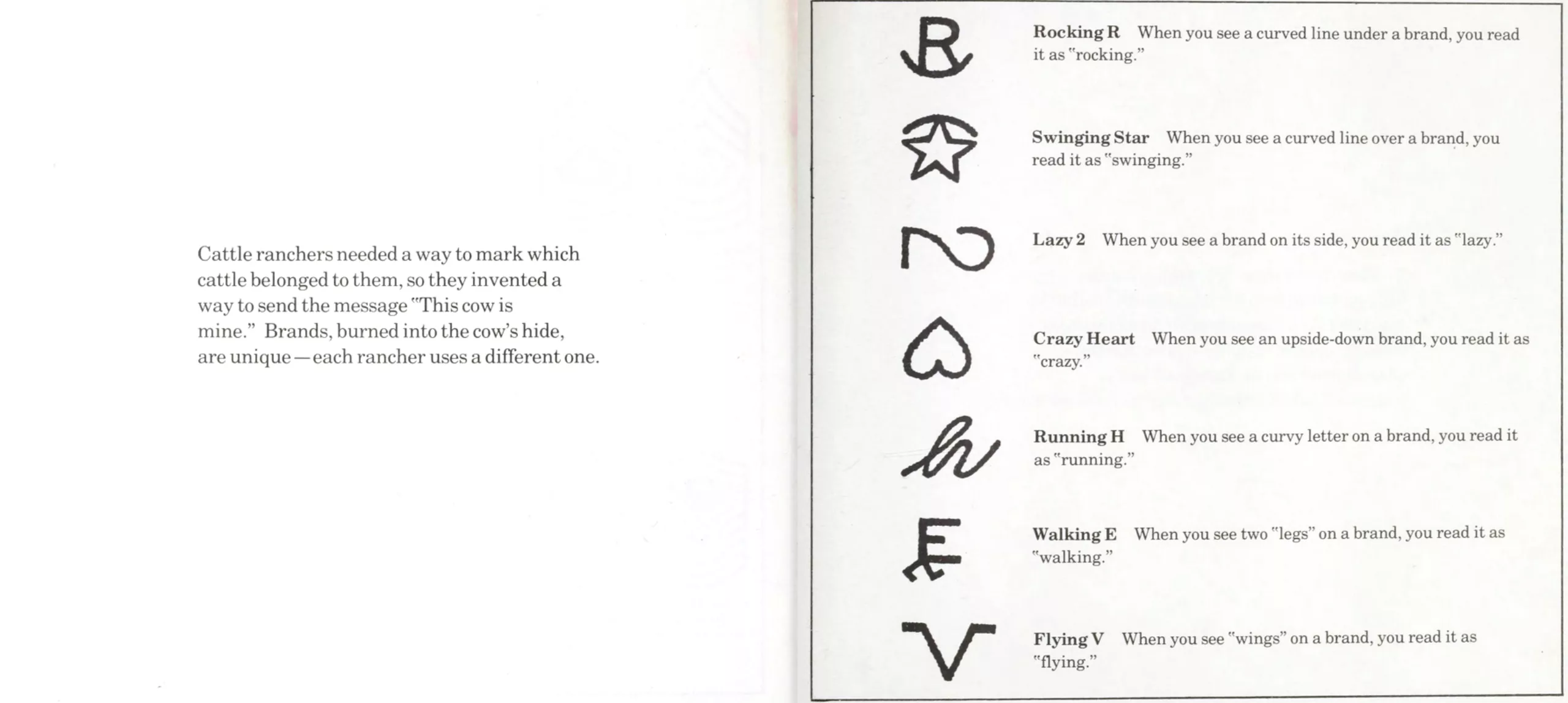 Contrairement aux monogrammes qui étaient purement esthétiques et visuels, le branding de bétail est lisible à voix haute, et peut créer des jeux de mots par exemple “walking Y brand” (la marque du Y qui marche) ou ” too lazy to pee ” (22P, trop flemmard pour pisser) suivant les symboles utilisés. Les marques se lisent de gauche à droite, de haut en bas et de l’extérieur vers l’intérieur (quand les lettres sont encerclées ou encadrées), ce qui est unique dans le monde des marques.