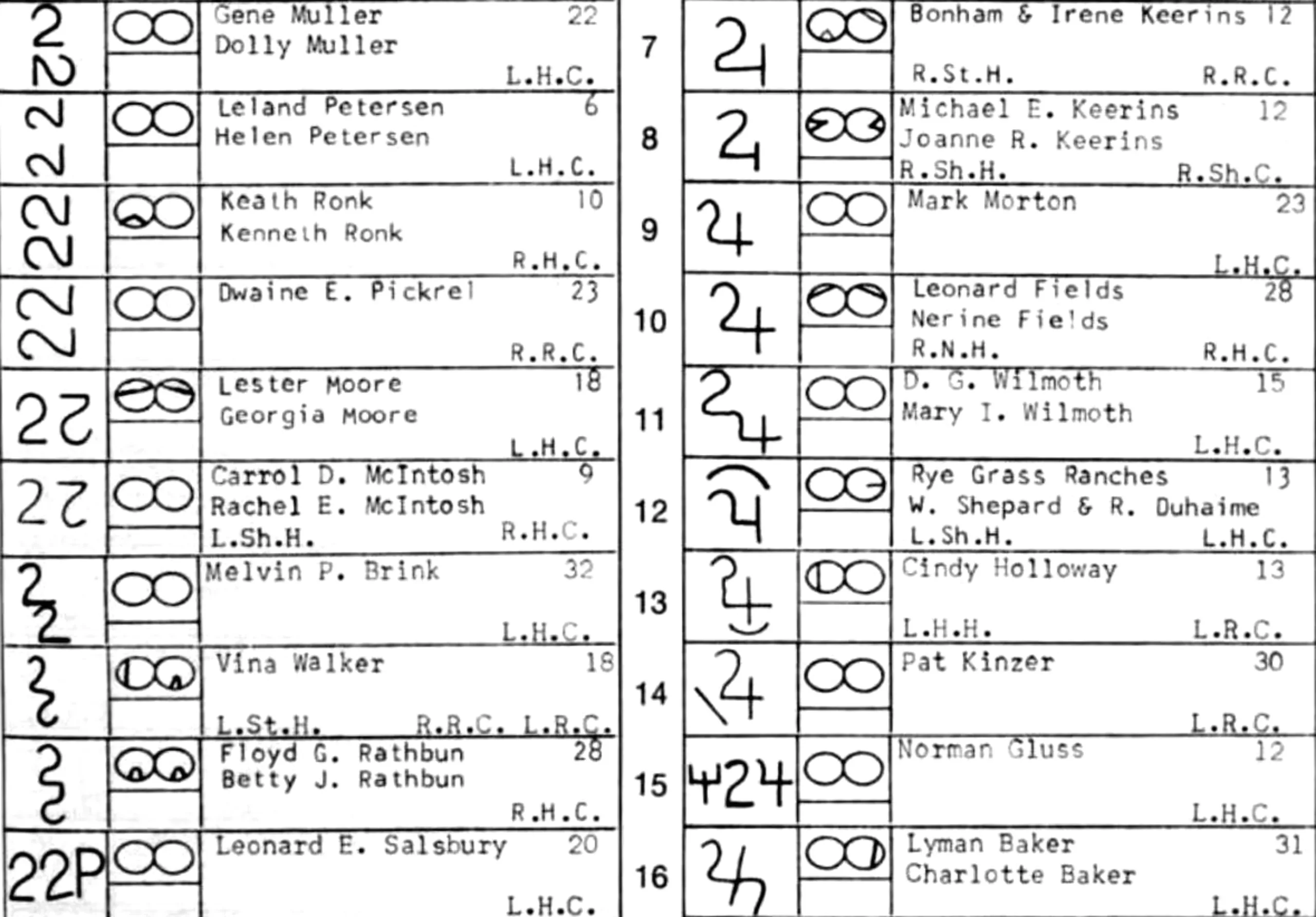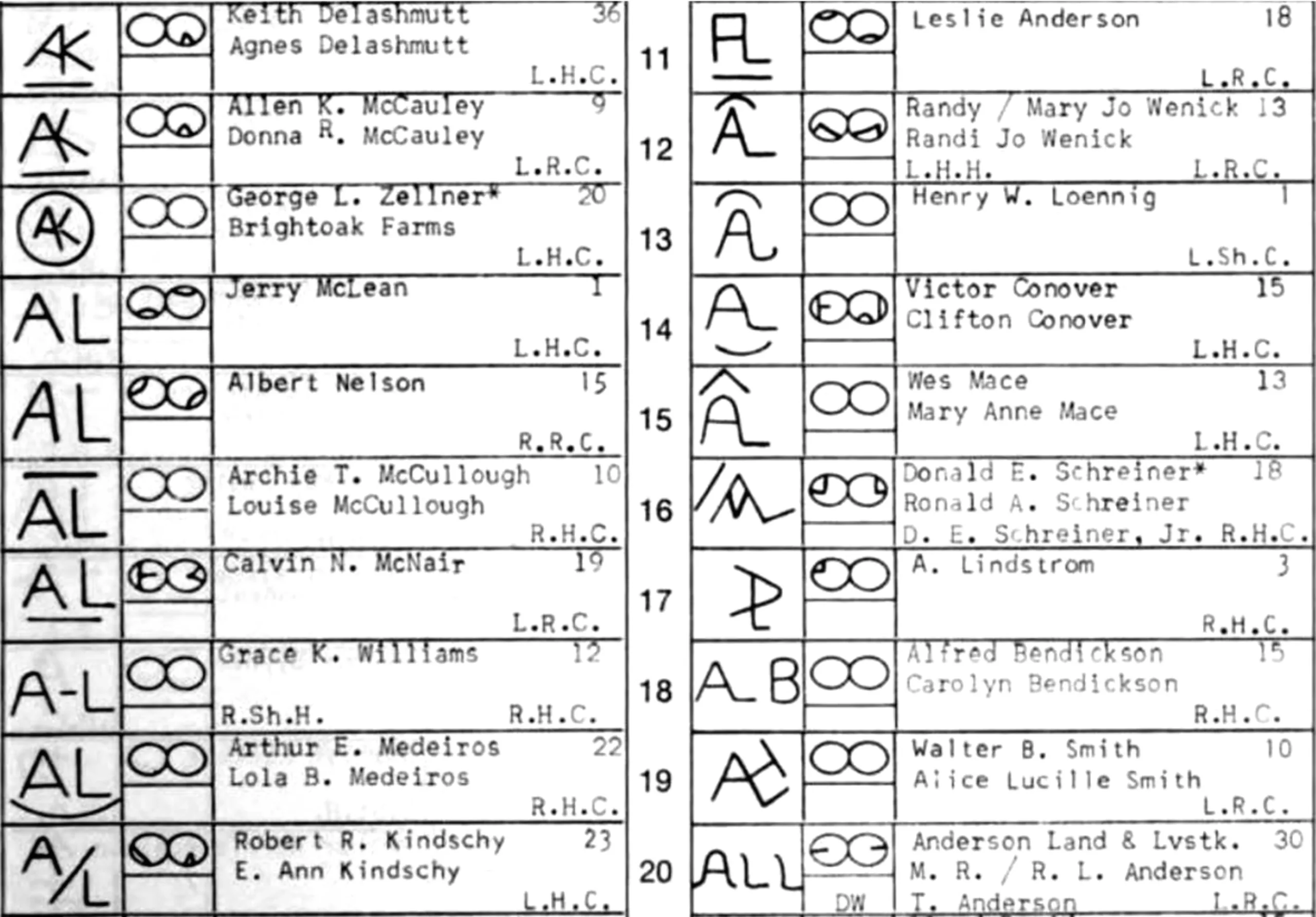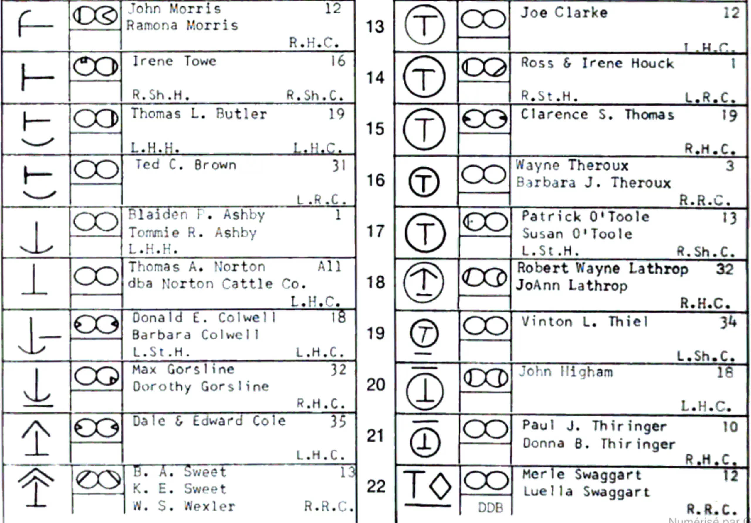 Voici par exemple quelques insignes recensés dans un catalogue de marques de bétail en Oregon, 1975. Le symbole est à gauche, les 2 ronds indiquent ensuite si la marque est sur les oreilles, puis sont notés les noms des propriétaires, le lieu et le côté d’apposition de la marque, puis si c’est un cheval (H, horse) ou un bovin (C, cattle).