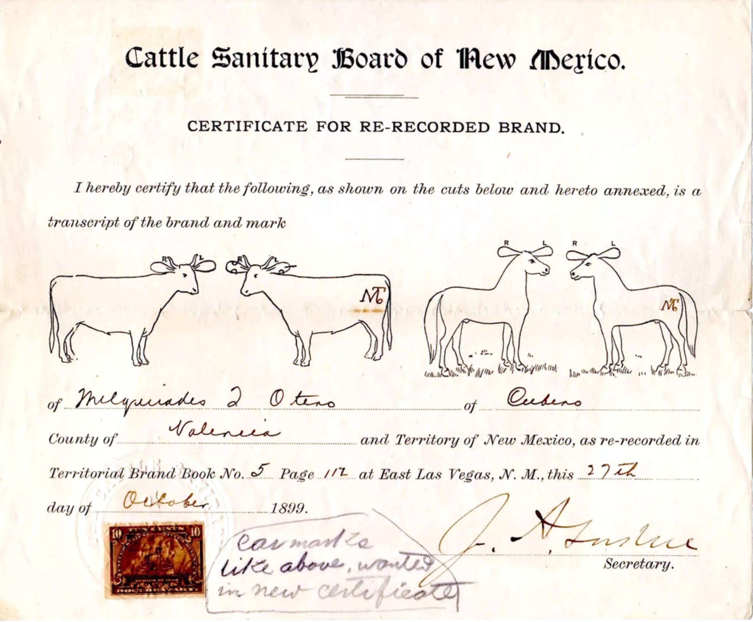 Ci-dessous, les illustrations des marques des éleveurs de bétail hispano-américains à l’origine des grands ranchs (comme Don José Tomas Talamantes, 1268, Maria Francisco Cordova, 1295, le ranch 7U7, 1296) autour de 1845 et 1890 en Californie, au Texas et dans l’Oregon.