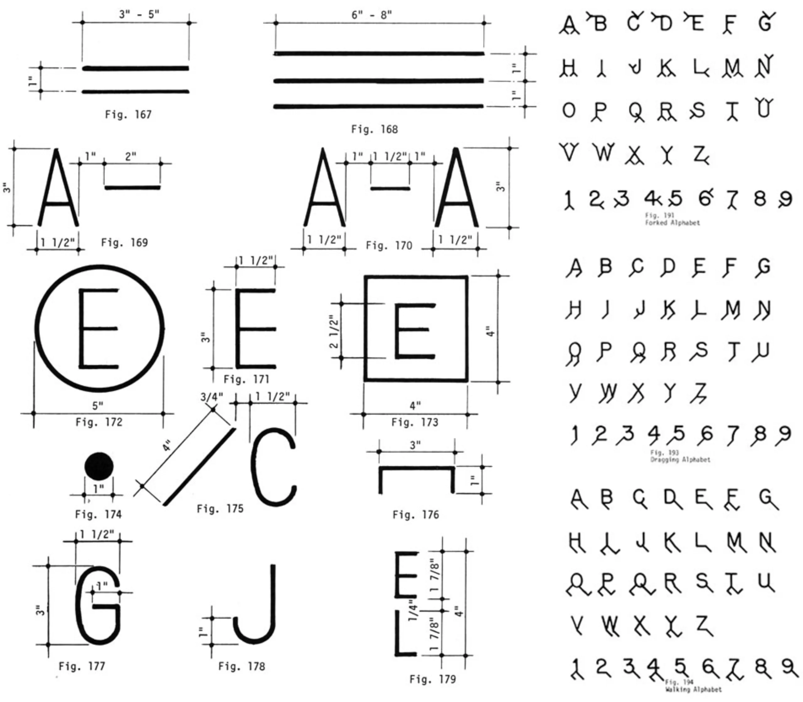 Dans un soucis de simplicité, ces marques perdent peu à peu leur côté artistique pour se concentrer sur la fonction de branding, pure et minimaliste. Elles doivent avant tout marquer une appartenance. On utilise alors des chiffres et des lettres, auxquelles on rajoute de la syntaxe : des “pieds”, des “ailes” ou des degrés d’inclinaison, en plus de motifs comme des arcs de cercle, des étoiles, des cœurs etc. Il y a peu de sigles mais un nombre illimité de combinaisons possibles : chaque éleveur doit avoir un code qui lui est propre, et unique. The Manual of Brands and Marks (le manuel des marques et marquages) de Manfred R Wolfenstine (1970) rassemble des alphabets créés spécialement pour cet usage, que l’on peut voir sur le site wemadethis. Ici, les alphabets des ailes et des jambes.