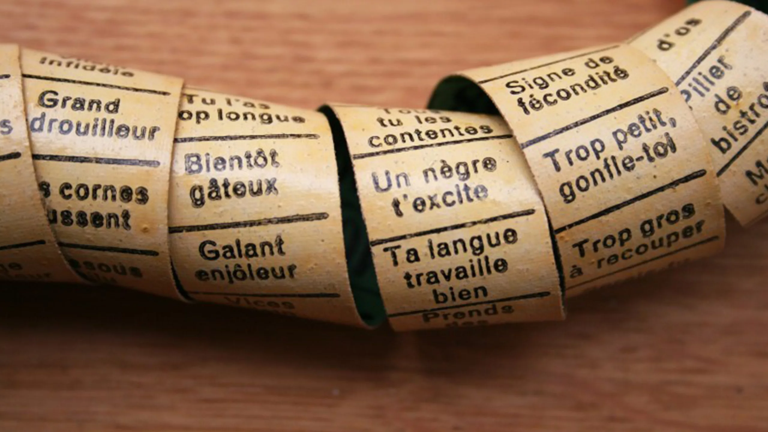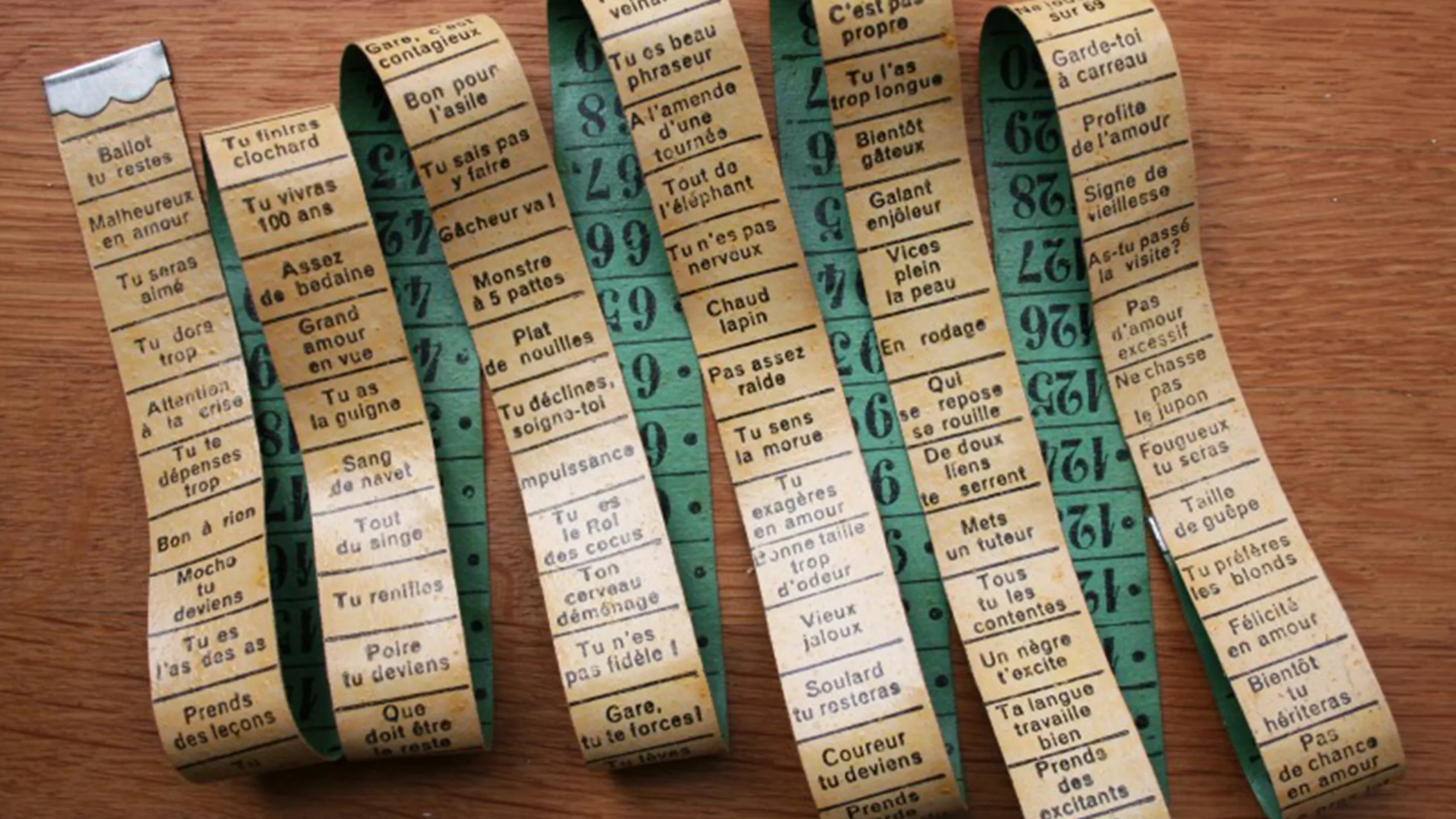 Il s’agit d’un mètre de couturière, datant approximativement des années 1930 et ayant dû appartenir à la mère de la grand-mère de la couturière qui jouxte mon bureau de comptable du dimanche… Au recto, cent cinquante centimètres harmonieusement répartis par ordre croissant… au verso, “on se tord, on rit ! », blagues et allusions vaseuses sont de mise … “Ta langue travaille bien… trop petit gonfle-toi… trop gros à recouper… signe de fécondité”… Voir même grossièrement colonialiste et raciste “un nègre t’excite”…