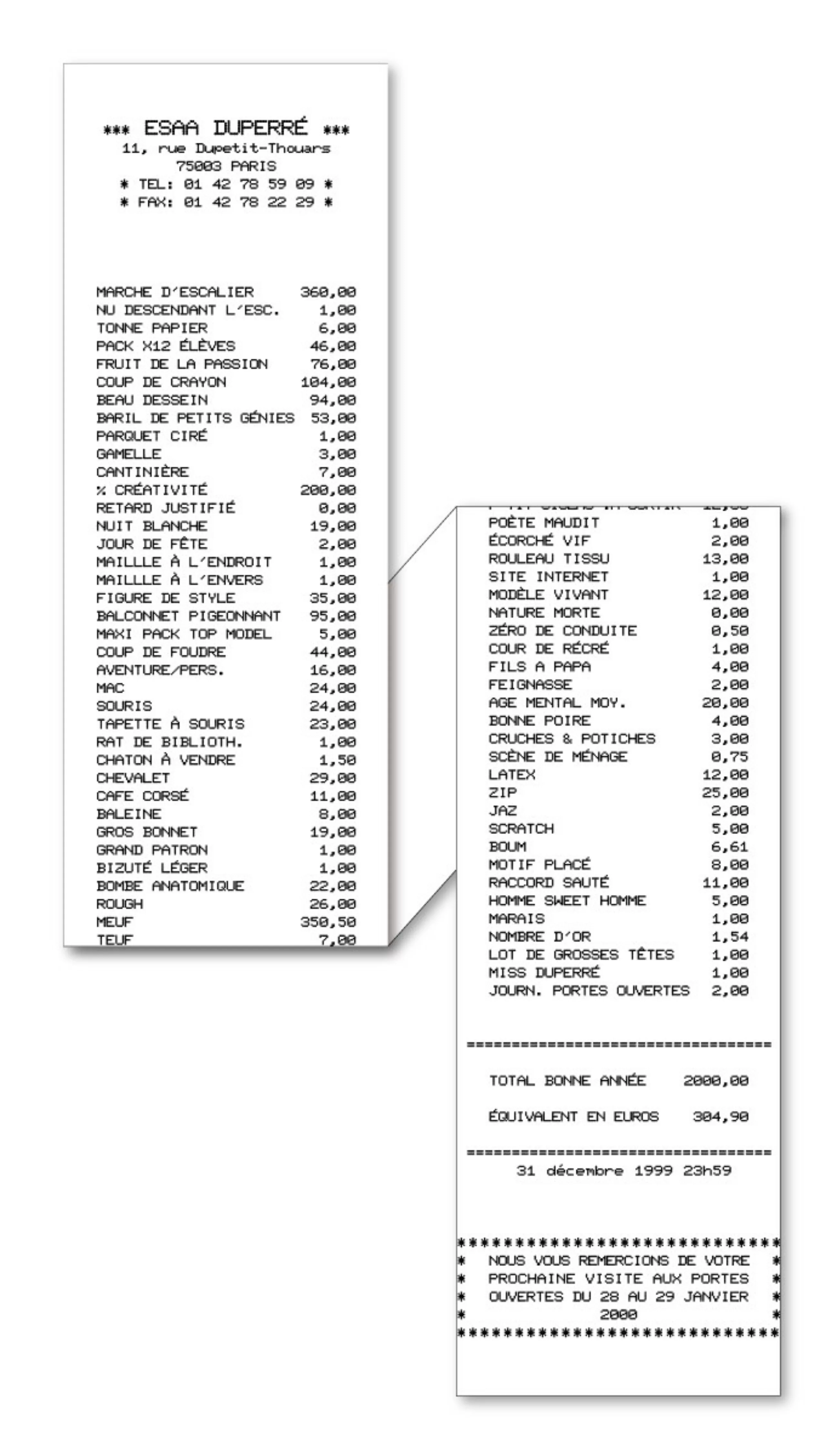 Nous avions proposé un ticket de caisse avec un inventaire à la Prévert… le total faisant “bonne année 2000”.