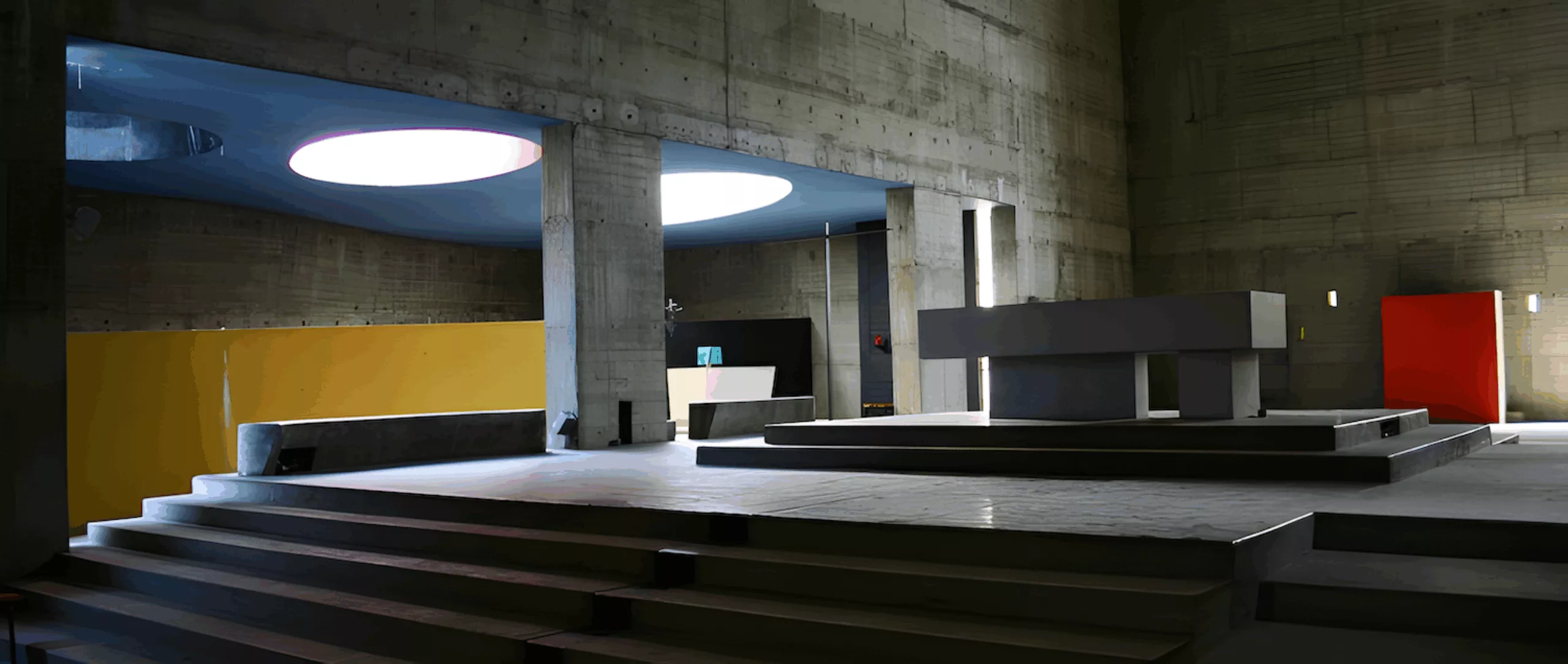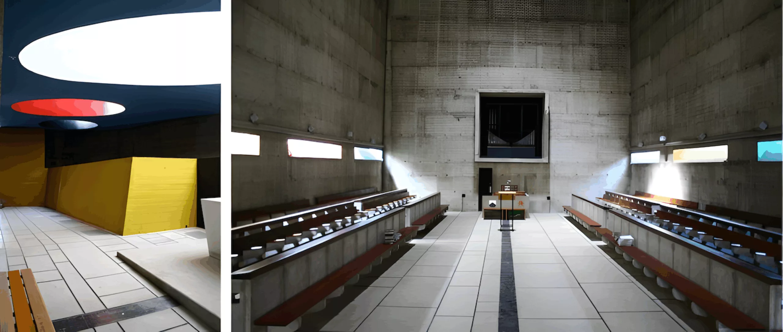 Le Corbusier déclara : « Ce couvent de rude béton est une œuvre d’amour. Il ne se parle pas. C’est de l’intérieur qu’il se vit. C’est à l’intérieur que se passe l’essentiel »… et je confirme… en particulier son église… l’éclairage est réalisé au moyen d’un dispositif constitué de multiples puits de lumière conçus comme des cheminées, métaphoriquement appelés « canons à lumière » car produisant l’effet de taches lumineuses concentrées et projetées sur le sol.