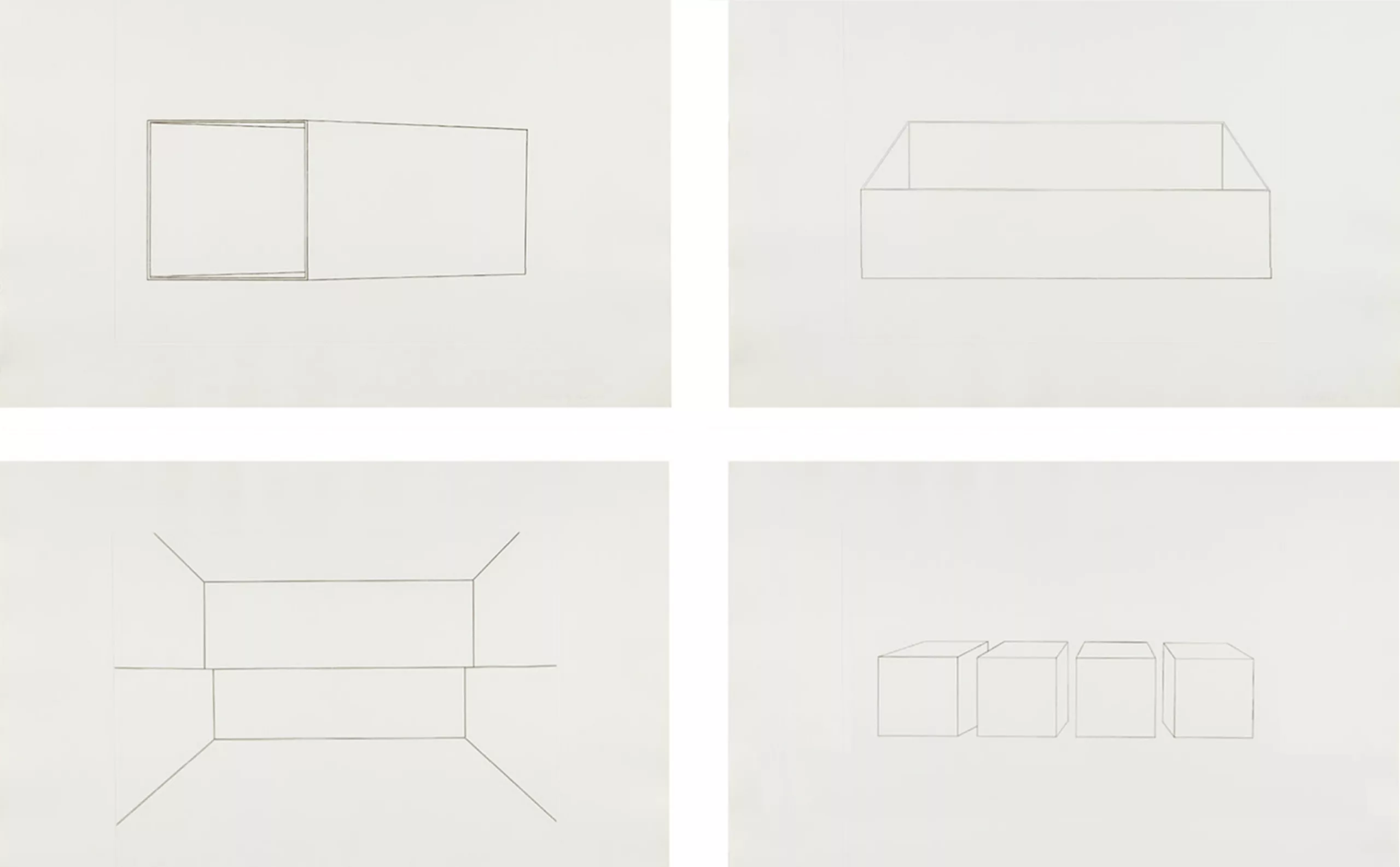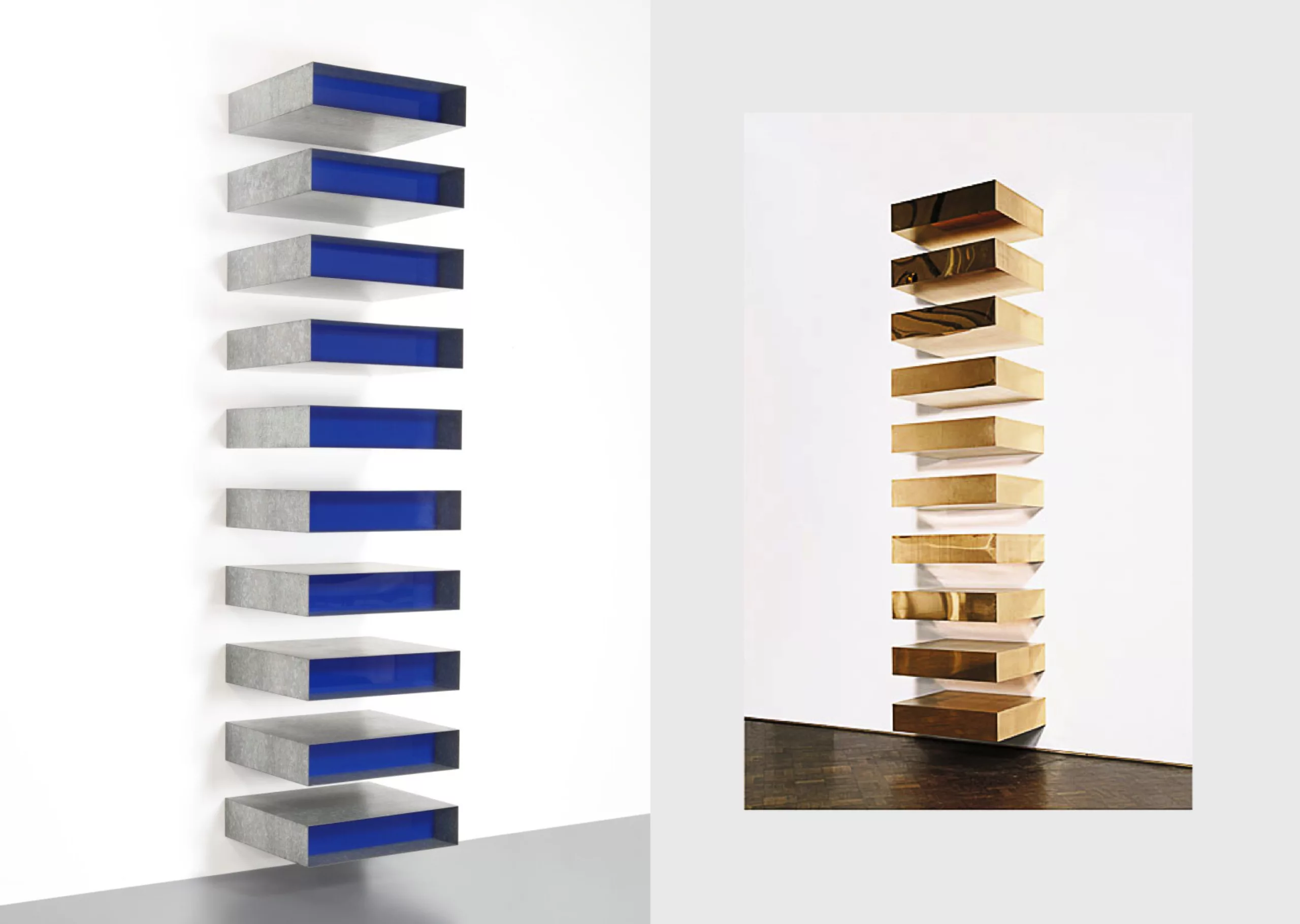 Toutes deux se rejoignent en un point : le respect de ce que Lester Beall appelle un “système d’usage”. Pour le graphiste, c’est la mesure objective entre plusieurs éléments tels que l’espace ou le vide entre les lettres et les lignes, les bords de page, les grilles et les courbes… qui permettent de créer “une marque qui soit le signe de l’individualité, et qui ait en même temps les qualités pour une utilisation généralisée.” Chez Donald Judd (ci-dessous), leader artistique du mouvement minimaliste, les mesures indiquent précisément la taille de chaque boîte installée, l’intervalle à respecter entre chacune d’elle, et la distance avec les murs, permettant ainsi de reproduire l’œuvre à l’identique à partir d’éléments indépendants agencés suivant cet ordre précis.