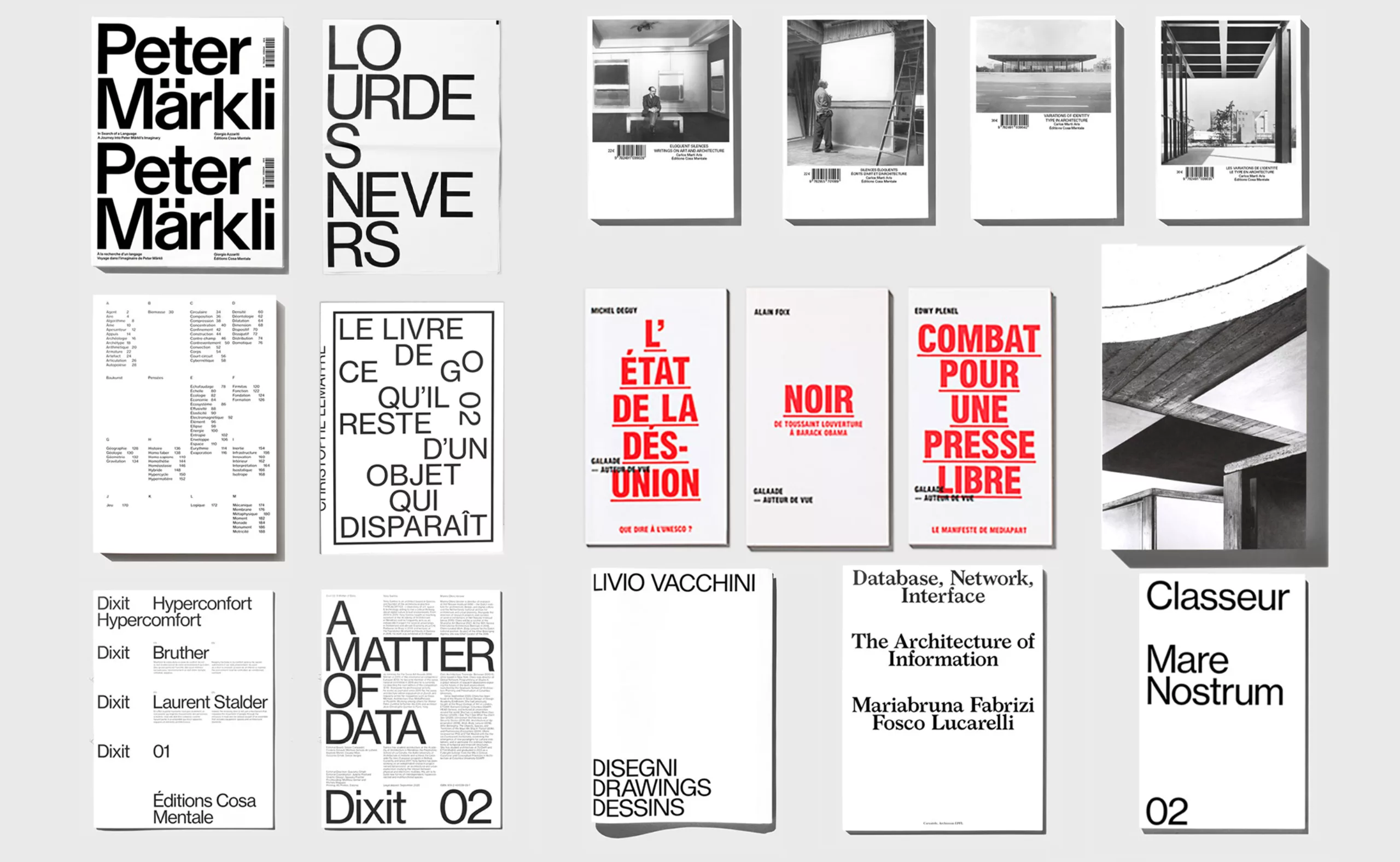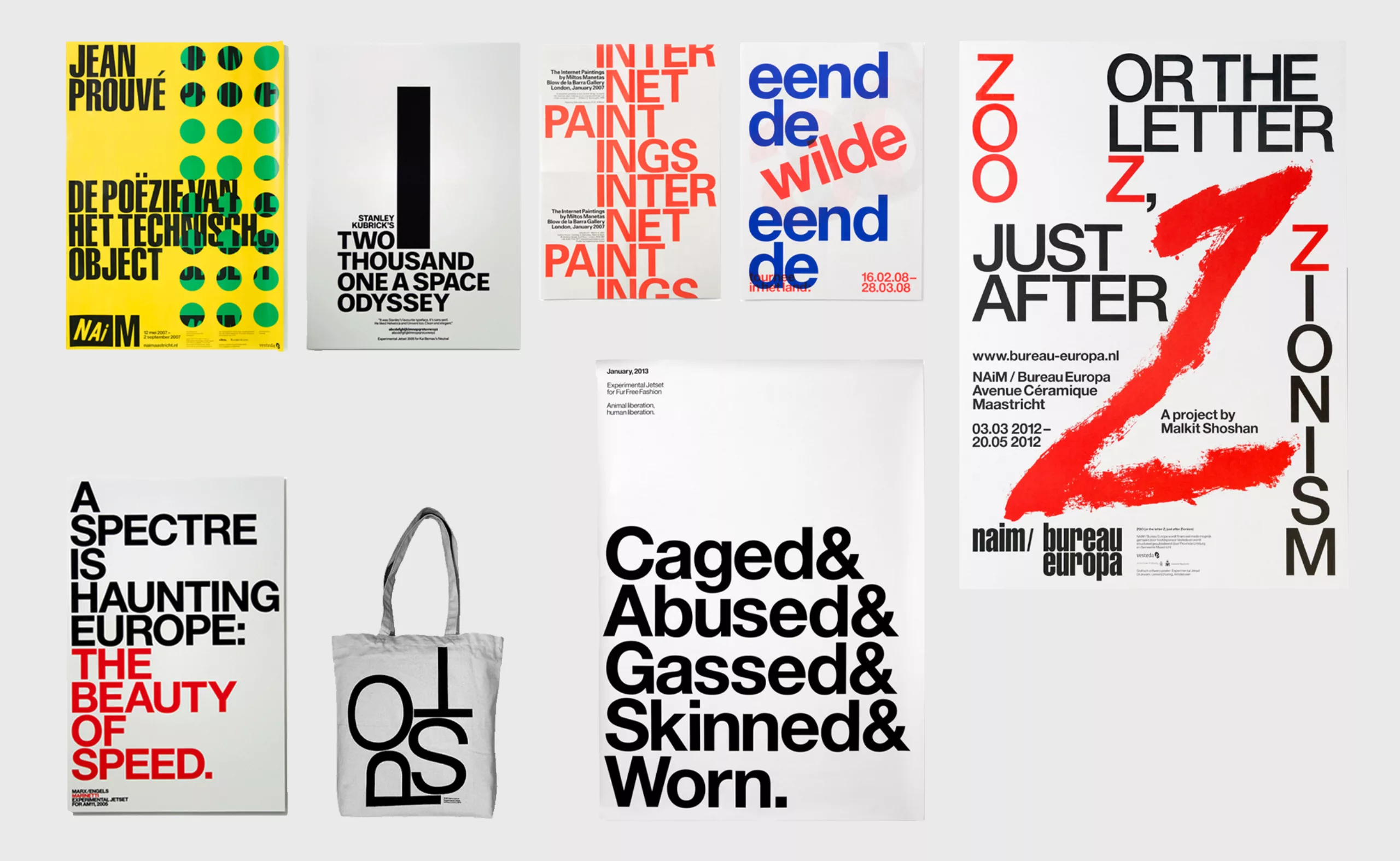 Les studios Experimental Jetset (ci-dessus) ou Spassky Fischer (ci-dessous) appliquent à toutes leurs réalisations des contraintes esthétiques de construction graphique à partir d’une grille, avec seulement une ou deux familles de caractères typographiques, pour un esthétisme très Suisse. Si leur travail reste très créatif malgré ces contraintes, la signature graphique de ces studios semble prendre le dessus sur l’identité des projets. Dans l’image ci-dessus on voit le poster typographique de 2001 a Space Odyssey (2001 l’Odyssée de l’espace) avec la gigantesque lettre I en Futura (dont Kubrick était un fan absolu parce qu’elle était linéale, “propre et élégante”), qui dessine le monolithe du film. Cette affiche réalise visuellement et de manière la plus minimaliste possible le lien entre l’univers de Kubrick et son film culte.