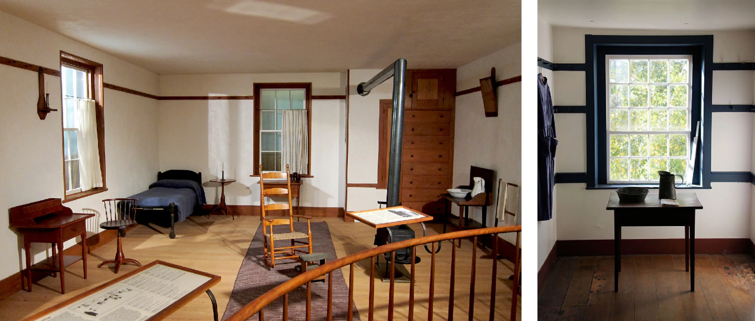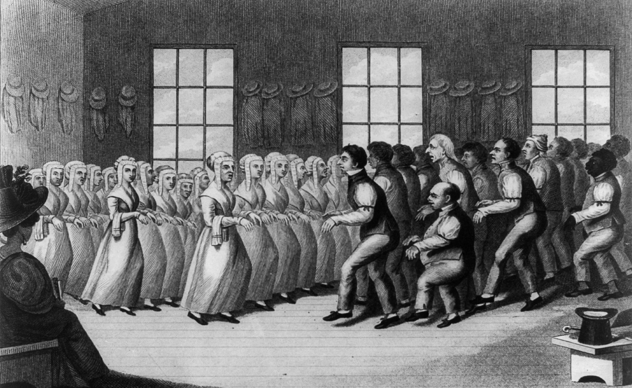 Voici ce à quoi ressemblaient les intérieurs des Shakers, et ci-dessous une gravure représentant la communauté performant l’une de leurs “danse secouée” qui nous fait étrangement penser au clip de Thriller… (mais pas sûr qu’ils s’amusaient autant).