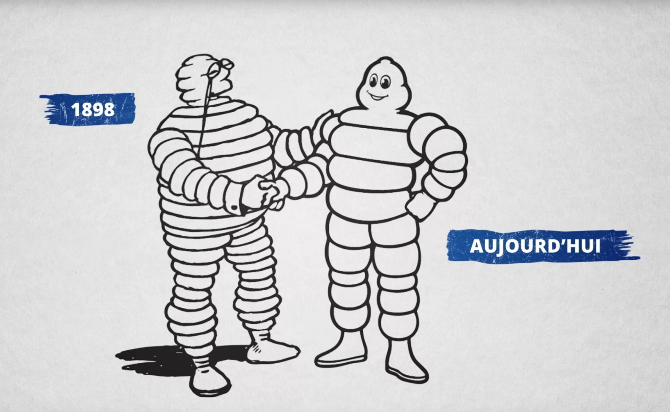 À son origine, Bibendum se rapproche de sa cible aisée et porte les traits d’un bourgeois avec un cigare à la bouche, des boutons de manchette et des binocles. Ses pneus sont fins, à l’image de ce qui se fait à l’époque. Peu à peu, à mesure qu’il devient populaire, il prendra les traits d’un gros bonhomme rassurant aux grands yeux ronds vivant tout un tas d’aventures, et ses pneus deviendront de plus en plus épais.