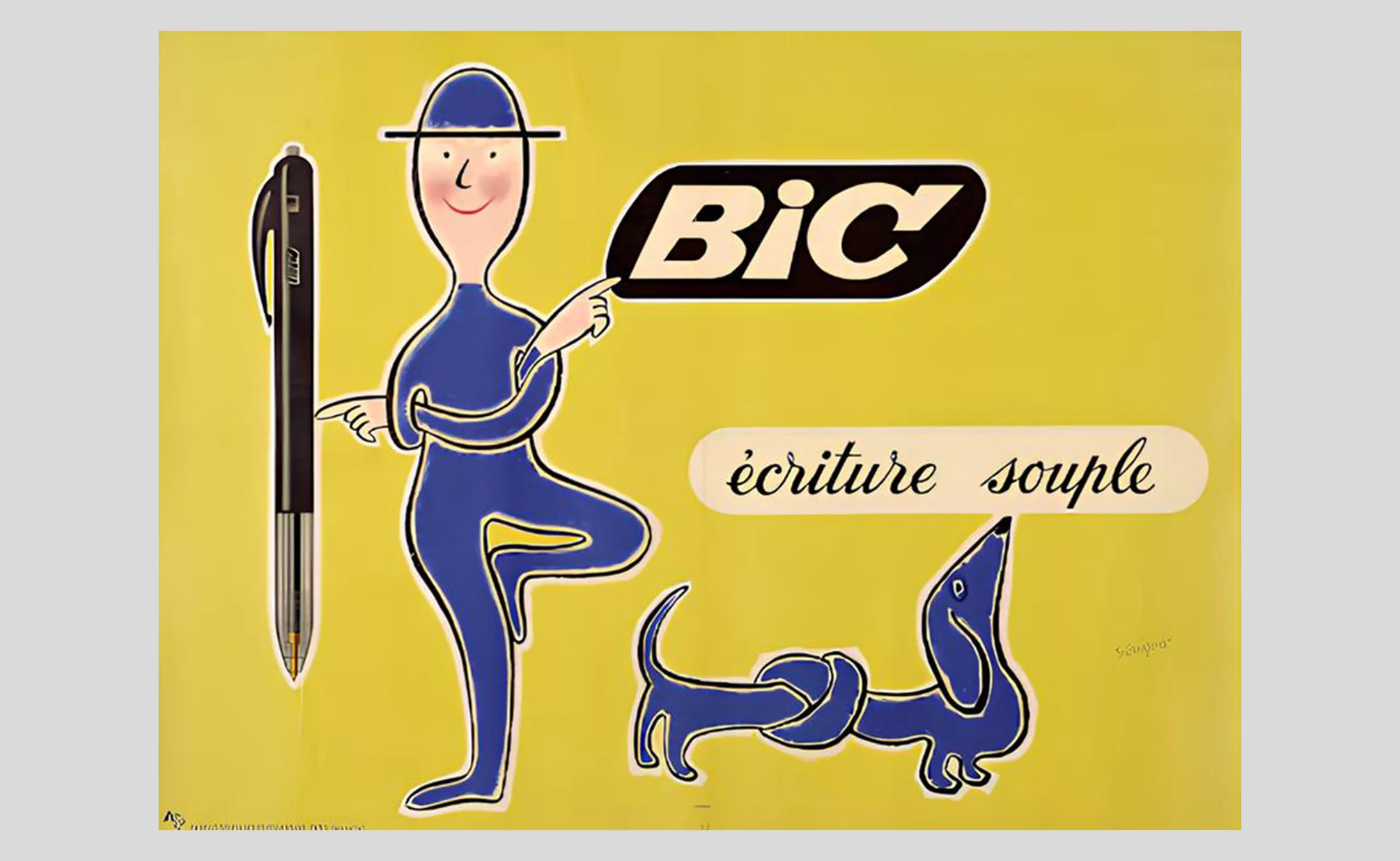 Dans un autre registre, mais qui roule toujours, on doit la mascotte de BiC à l’illustrateur Raymond Savignac, qui réalisera les publicités du stylo à bille pendant plus de 20 ans. Drôles et légères, elles sont compréhensibles en un coup d’œil et à l’image de cet outil léger, simple et efficace, qui révolutionne l’usage de l’écriture en venant remplacer la plume et l’encre.
