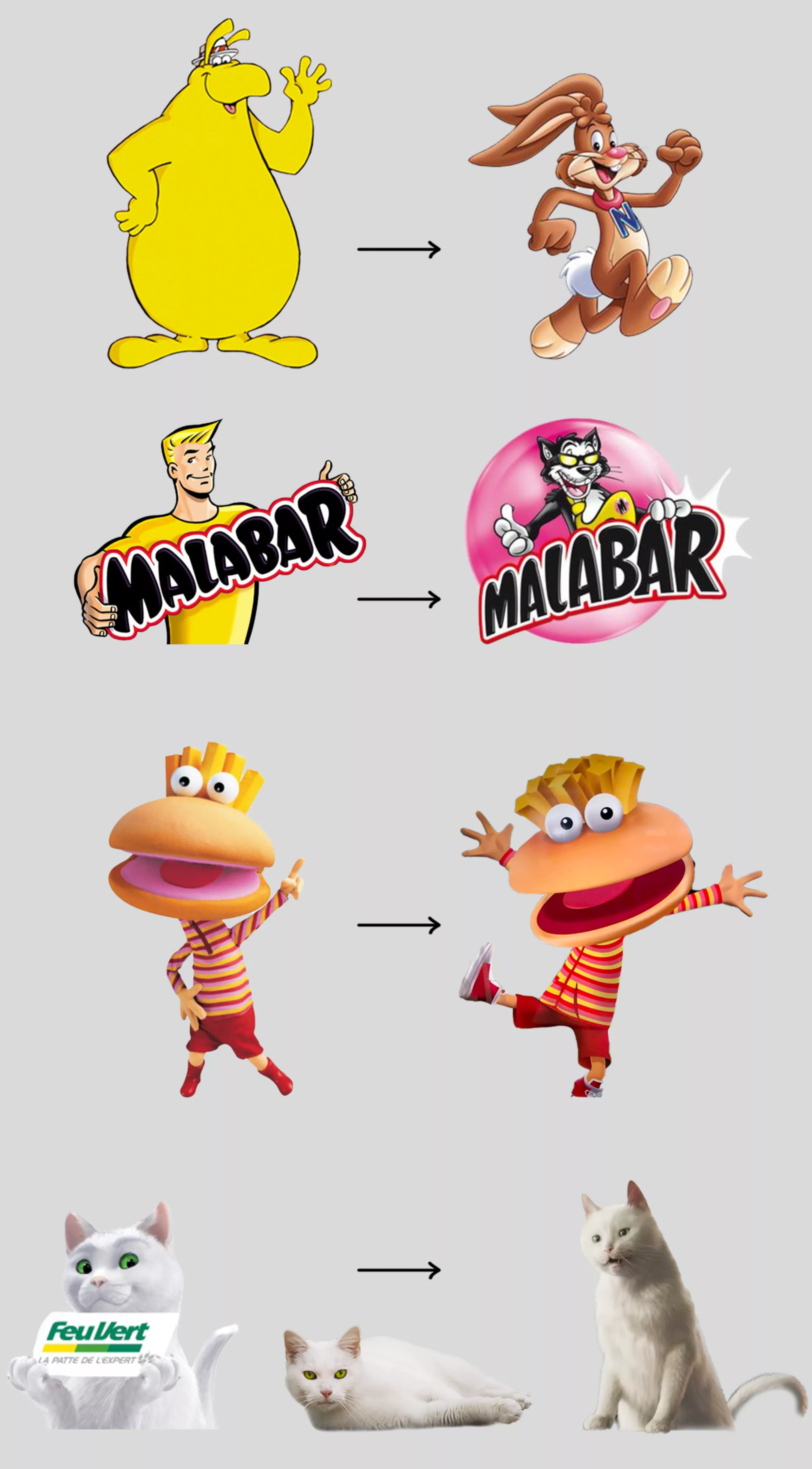 On a vu pourtant disparaître l’écureuil de la caisse d’épargne, depuis 2011, et Malabar se changer en Mabulle le chat noir en faisant un tollé monumental auprès des clients la même année. Groquik, trop gros, a quant à lui été remplacé par un lapin rapide (encore un lapin), et Quickos, la marionnette bizarre des burgers Quick, n’a pas survécu à la 3D. Le bonhomme de Cetelem et Bibendum n’interviennent aujourd’hui anecdotiquement qu’en fin de spot. Quant à Ramsès, le chat de Feu Vert –numérisé dès 2007 pour une raison de coûts, puis à nouveau vrai chat 10 ans après, avant de repasser en 3D– il avait annoncé son départ après 15 ans de loyaux services pour un “congé chabbatique” en 2021, l’occasion de créer un coup de com autour de la refonte du logo Feu Vert.