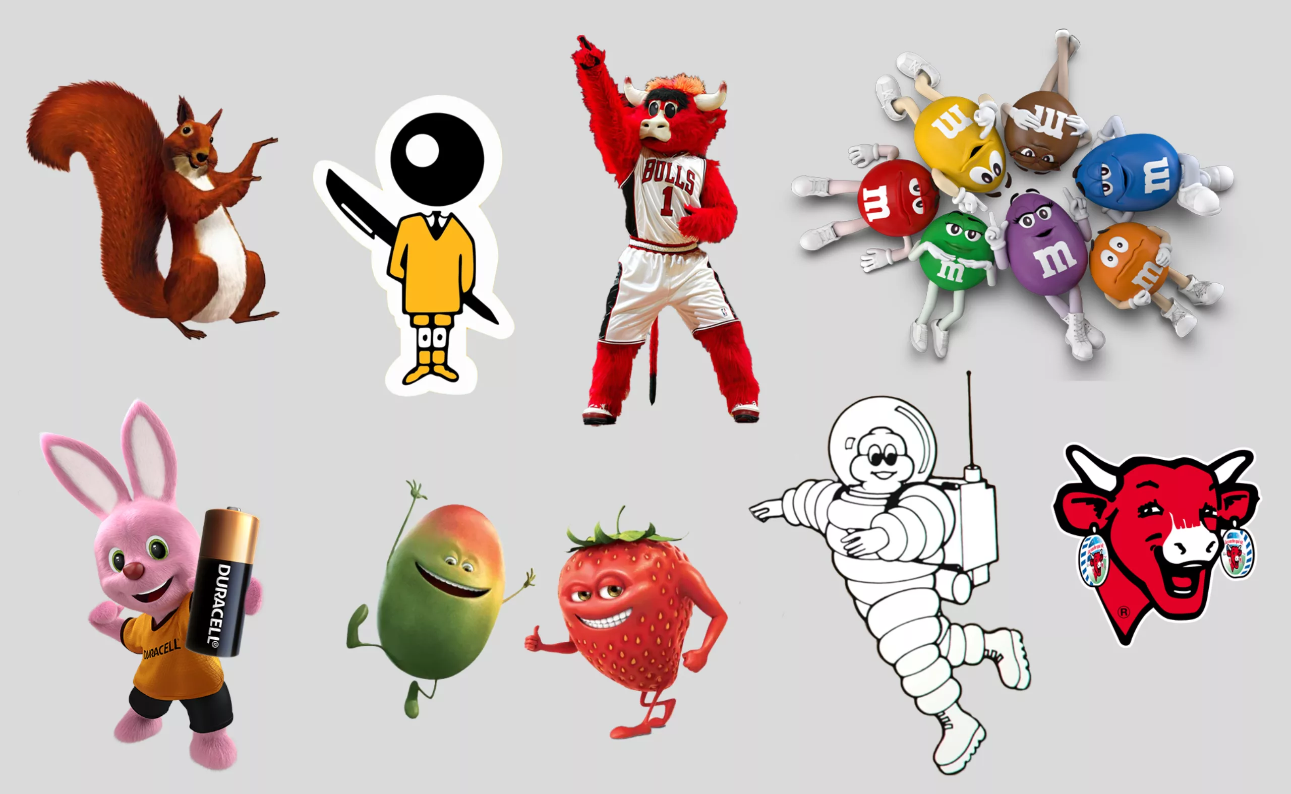 On pense par exemple à l’homme-pneu Bibendum de Michelin, à l’écolier de Bic, à l’écureuil de la Caisse d’Épargne qui fait des réserves, au bonhomme blond costaud et flexible de Malabar, à la vache qui rit comme son nom l’indique, au lapin rose surexcité des piles Duracell (et à tous ses copains), à Benny the Bull, le taureau des Chicago Bulls (taureaux de Chicago, en anglais), aux M&M’s, ou aux fruits des boissons Oasis. Et quid de Ramsès le chat blanc de Feu Vert, qui ne semble avoir aucun rapport avec la marque ? mystère, à part ses yeux verts qui rappellent les couleurs de l’entreprise… où alors serait-ce un gri-gri pour contrer la mauvaise augure du chat noir ?