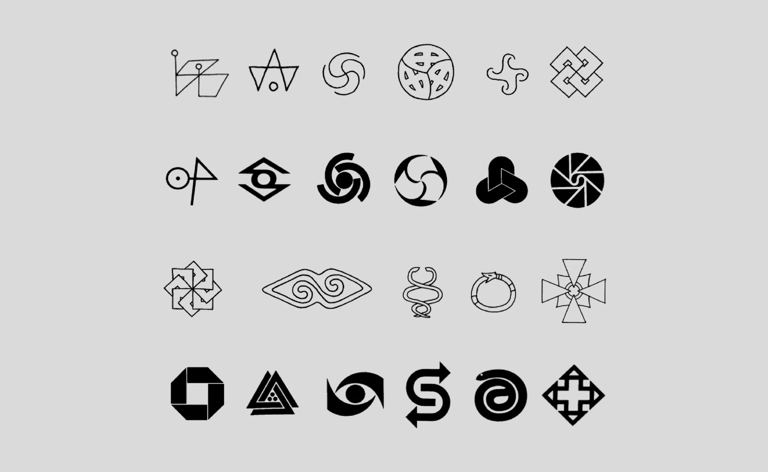 Si l’on ajoute à ça le fait que le logo d’une marque, dérivé du seau, est lui aussi à l’origine un symbole magique, une sorte d’incantation protectrice, on comprend mieux pourquoi les marques ont voulu ainsi doublement sceller le mauvais sort. En latin les mots “sceau”, “symbole” ou “signature” tiennent en un mot : charactere, un idéogramme impossible à prononcer mais qui est compris et utilisé pour communiquer, et qui contient ou confère un certain pouvoir à celui qui le possède et l’applique (Sébastien Hayez, Étapes magazine #272). À condition d’y être initié.e, la marque dégage ainsi un certain prestige, qu’elle peut accentuer avec une bonne mascotte. On voit sur cette illustration quelques symboles issus de différentes pratiques ou cultures du monde (traits fins), et des logos modernes qui leur font écho (en gras), tous tirés du livre d’Adrian Frutiger “l’homme et ses signes”.