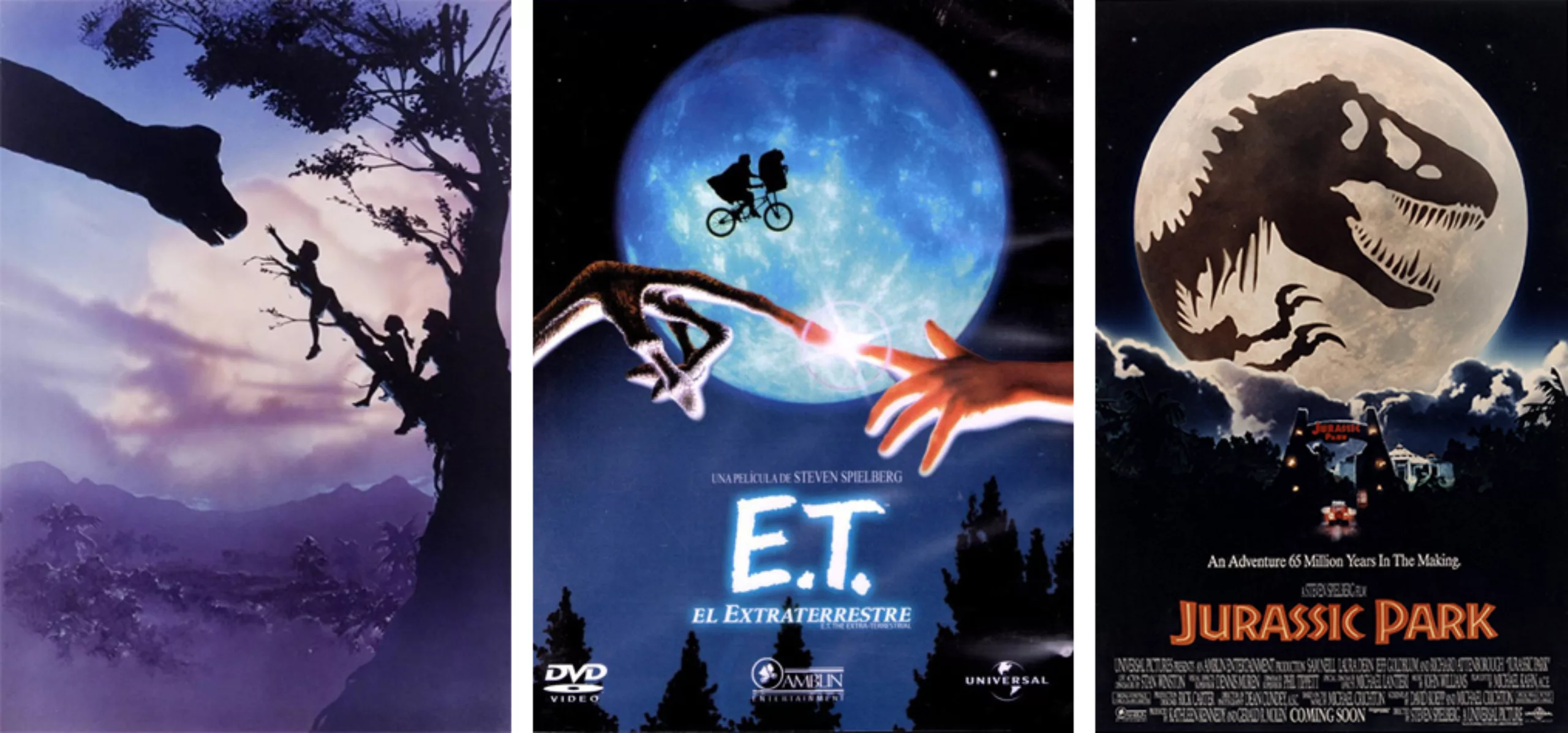 Une fois le logo finalisé il l’intègre et compose avec tous les éléments clefs du film : il pond un combo T-rex fossilisé + parc, sur fond de planète. Cette sphère ronde, probablement extraite du logo, semble lui monter à la tête. Il bascule étrangement sur des compositions de E.T. à la sauce dinosaure, sûrement pour faire plaisir à Spielberg ? On voit sur ces deux recherches d’affiches pour Jurassic Park (à droite et à gauche) la ressemblance frappante avec l’affiche d’E.T., au milieu. La rencontre des créatures, la lune, la composition, les couleurs…