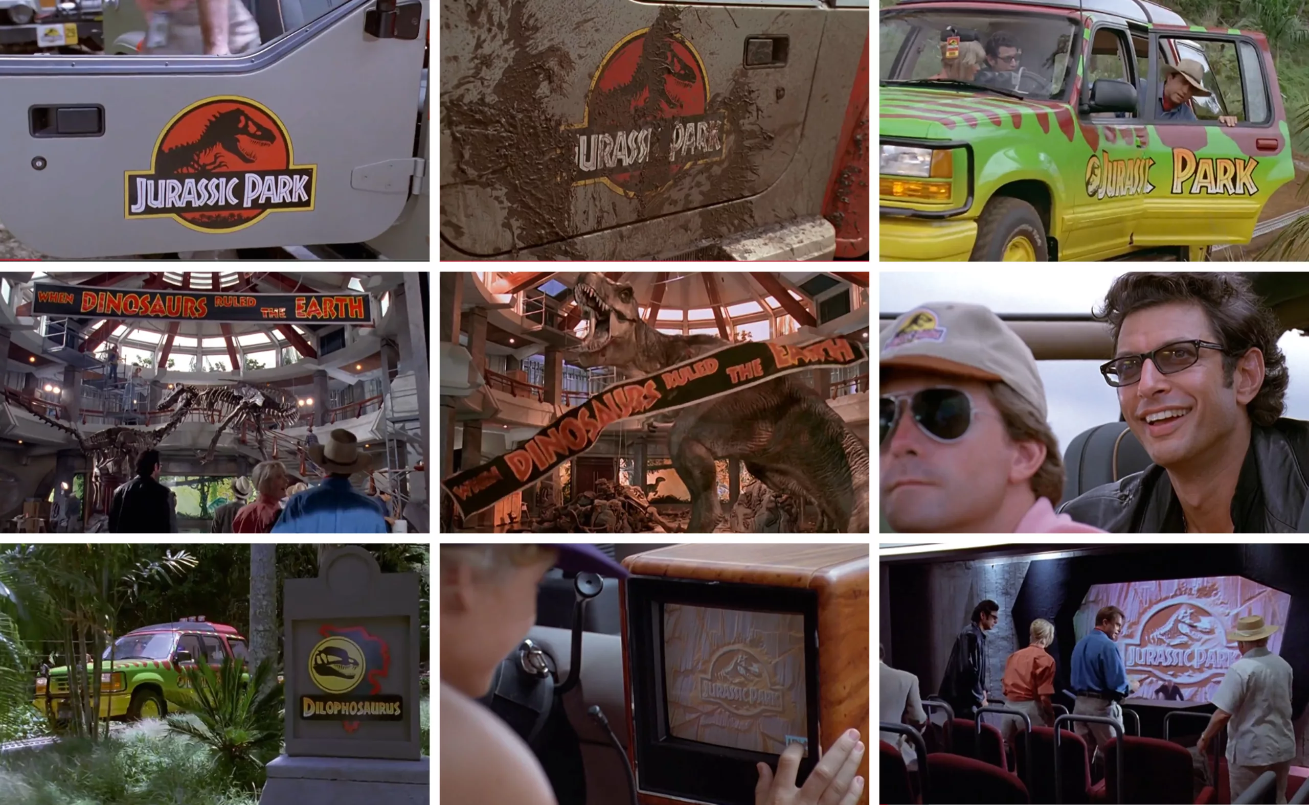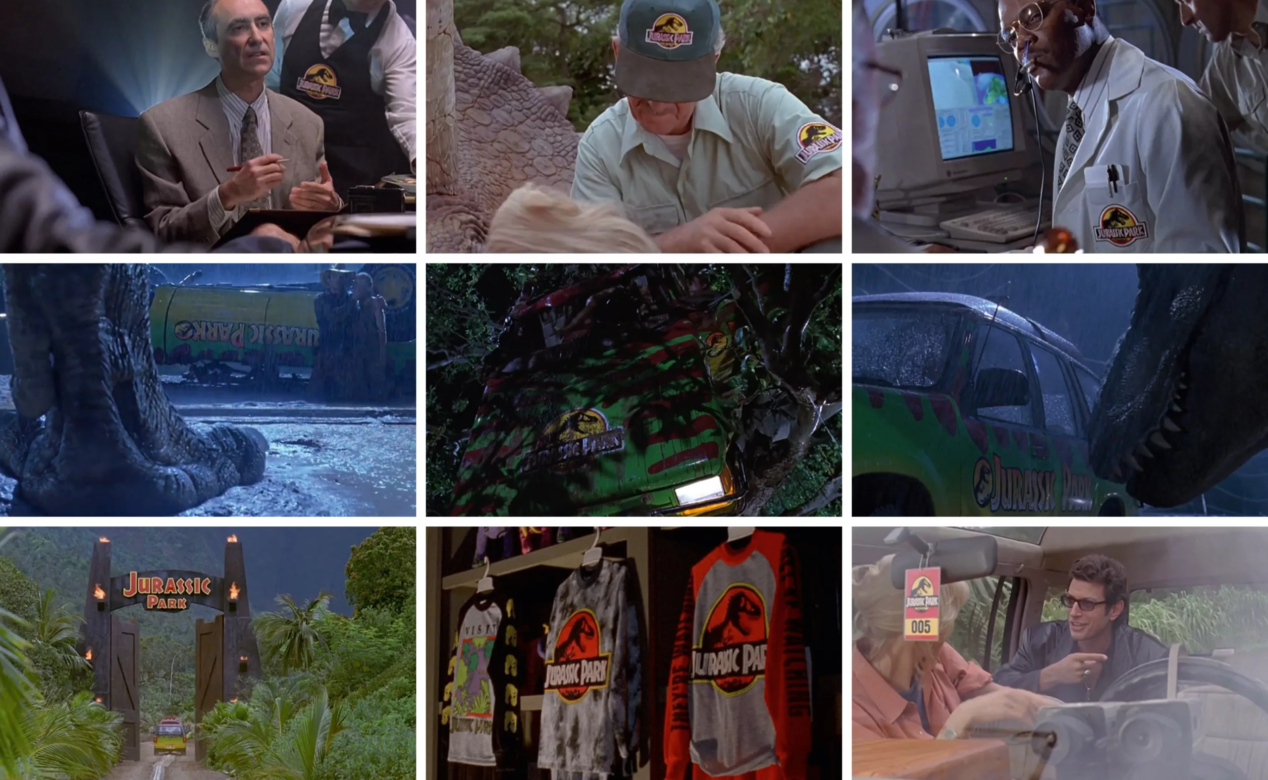 Une fois intégré au film, il sera alors possible de le faire apparaître sur différents supports pour “brander” le parc et lui donner une allure plus réaliste, comme une véritable marque. On le verra sur les portières, les uniformes, les tabliers du restaurant, l’architecture ou encore la signalétique. On s’est amusés à répertorier ci-dessous (presque toutes) les apparitions du logo dans le film Jurassic Park (et ça nous a pris 2h) :