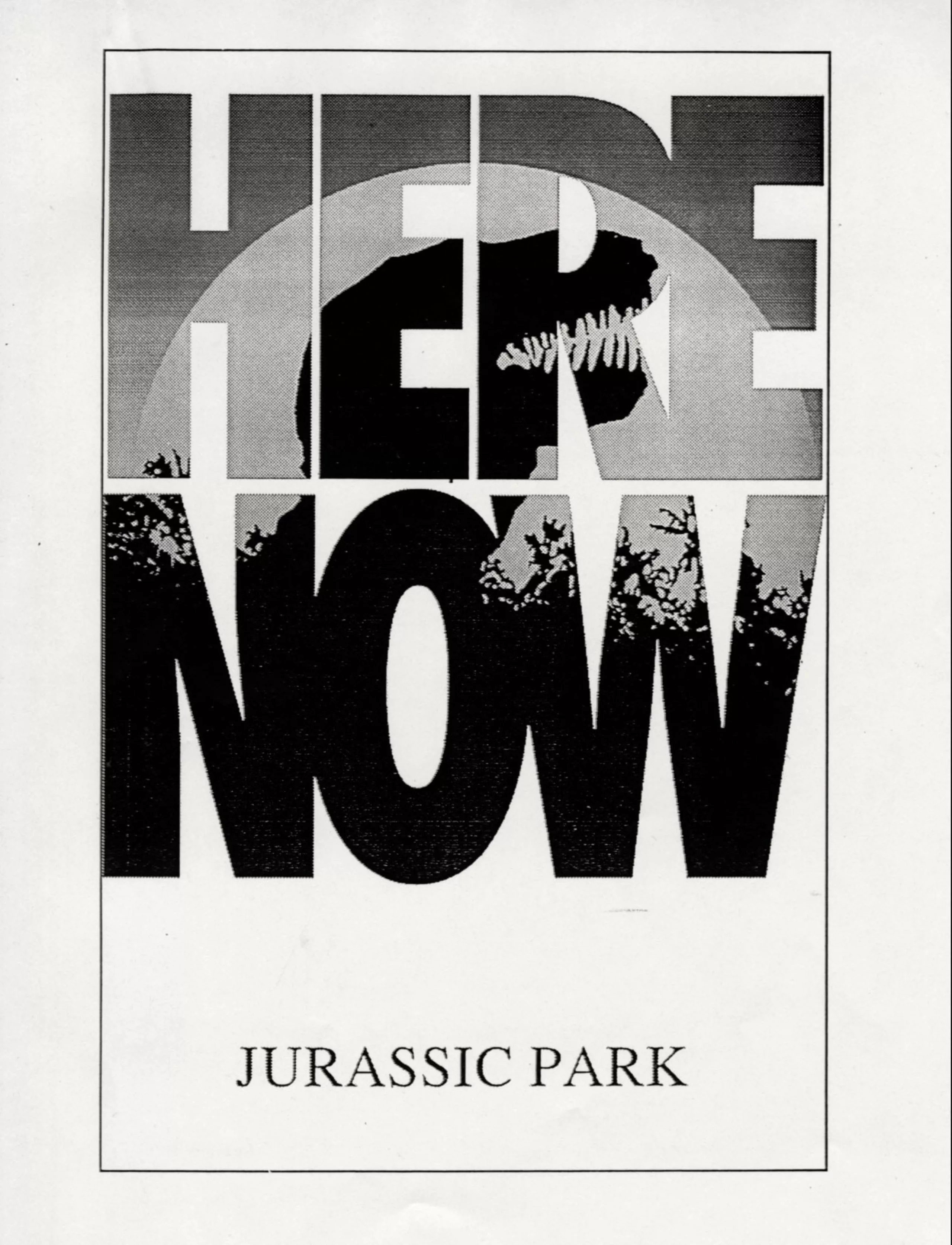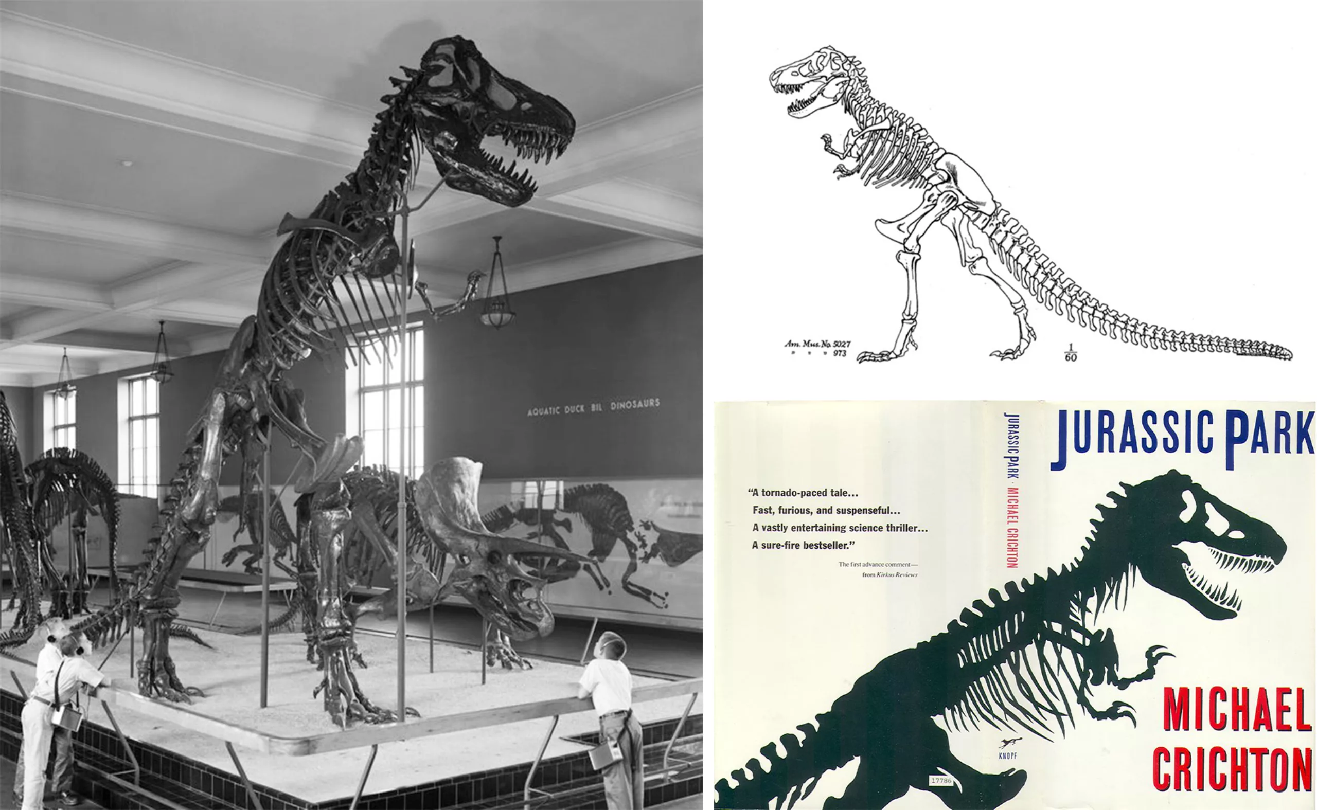L’aventure du T-rex se poursuit en 1990 lorsque l’auteur Michael Crichton publie Jurassic Park, et cherche une couverture à son livre. Avec son éditeur, ils se mettent d’accord pour ne pas faire apparaître de dinosaure en chair et en os. Ils font appel aux compétences de Chip Kidd, un designer de couvertures de livres qui débute alors tout juste sa carrière. Celui-ci tente plusieurs options pour représenter la bête sous cette contrainte : ombres, gros plans sur la peau ou les yeux, empreintes… mais rien ne semble fonctionner. L’éditeur ne veut pas qu’il exploite la piste du squelette car il faut que le dinosaure semble vivant.