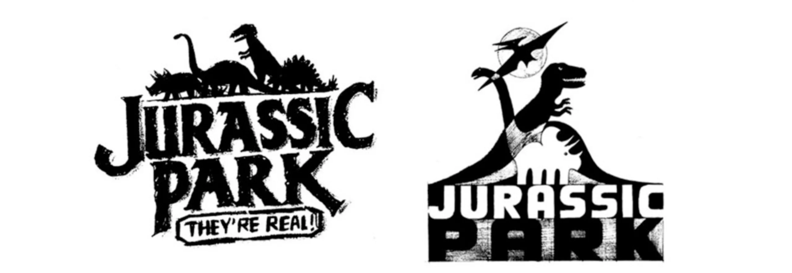 Mike travaille lui-même alors avec d’autres artistes (comme Terry Lamb) pour trouver un visuel digne de ce nom pour adapter Jurassic Park à l’écran. Avec tout ce beau monde, c’est plus de 100 propositions de logos qui voient le jour… mais tout autant de refus ! En voici quelques propositions de logos de Jurassic Park :