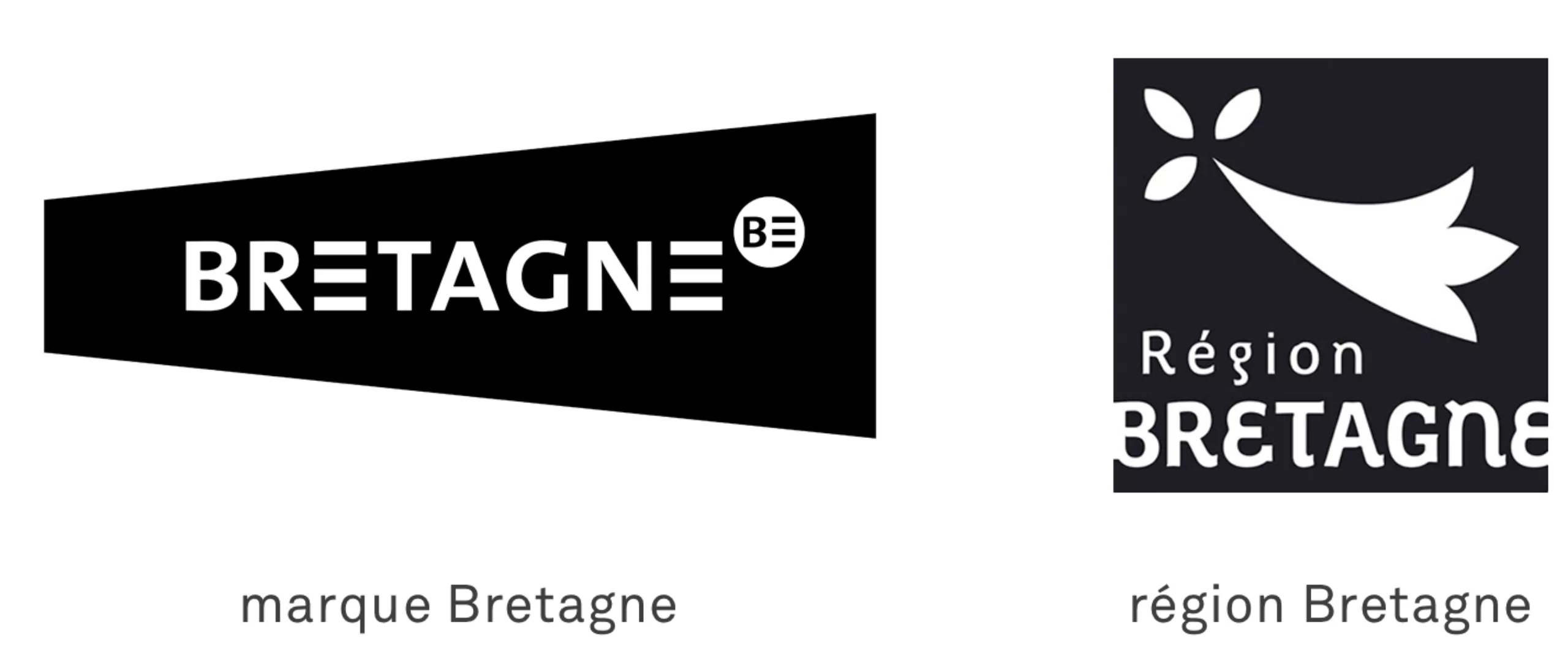On peut également penser à la région Bretagne qui a sa propre identité graphique et son logo, et à la marque Bretagne (ces logos n’ont pas été réalisés par l’agence Graphéine). Toutes deux sont des identités distinctes. L’une vise à la rendre attractive auprès des touristes et investisseurs (Anglicisme, typographie contemporaine et efficace…), la seconde représente la région (Typographie traditionnelle, Hermine dessinant la forme de la région et se terminant à Brest comme une ouverture sur le monde…). Elles visent chacune à mettre en avant des aspects différents et ne sont pas utilisées dans les mêmes contextes. D’où l’intérêt de deux identités différentes, mais compatibles.