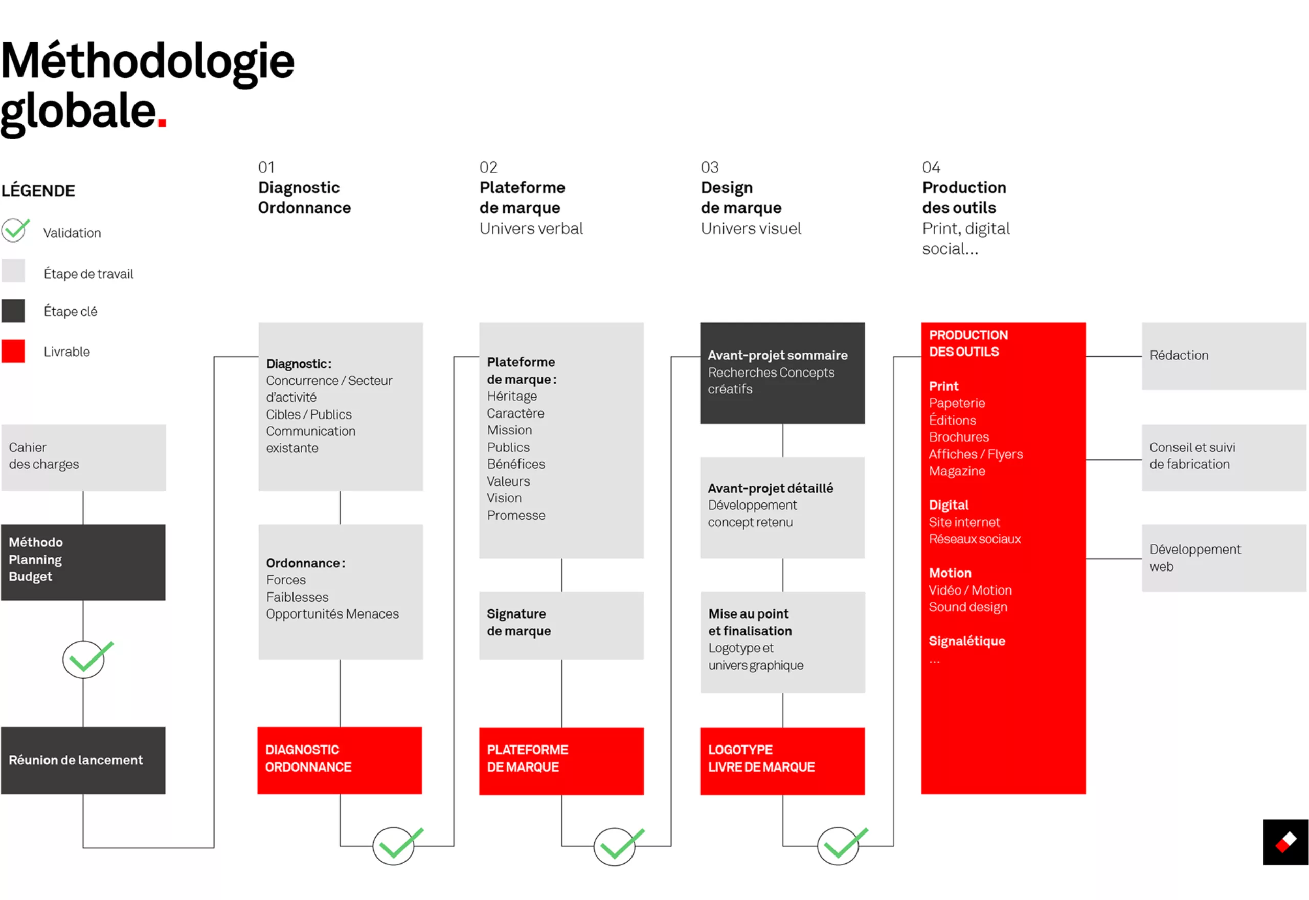 Chez Graphéine, nous suivons une méthodologie bien précise. Ce graphique illustre les étapes cachées de l’iceberg qui sont indispensables à la création d’une identité visuelle. N’hésitez pas à cliquer dessus pour la voir en grand. Les éléments en rouge désignent les livrables proposés au client, les gris et gris foncés sont des étapes faites en interne. Il est important de montrer ce processus pour bien comprendre les dessous de la création d’une identité visuelle globale.