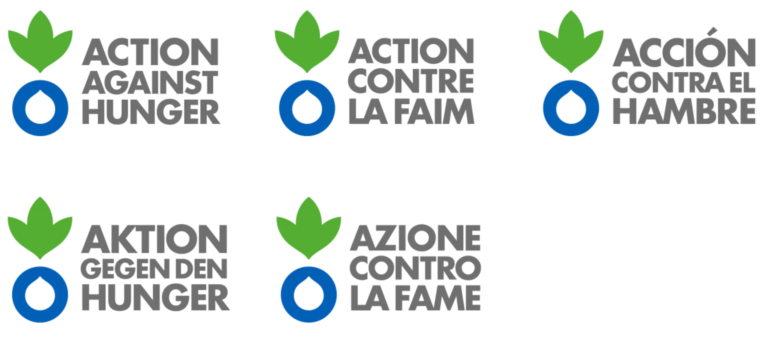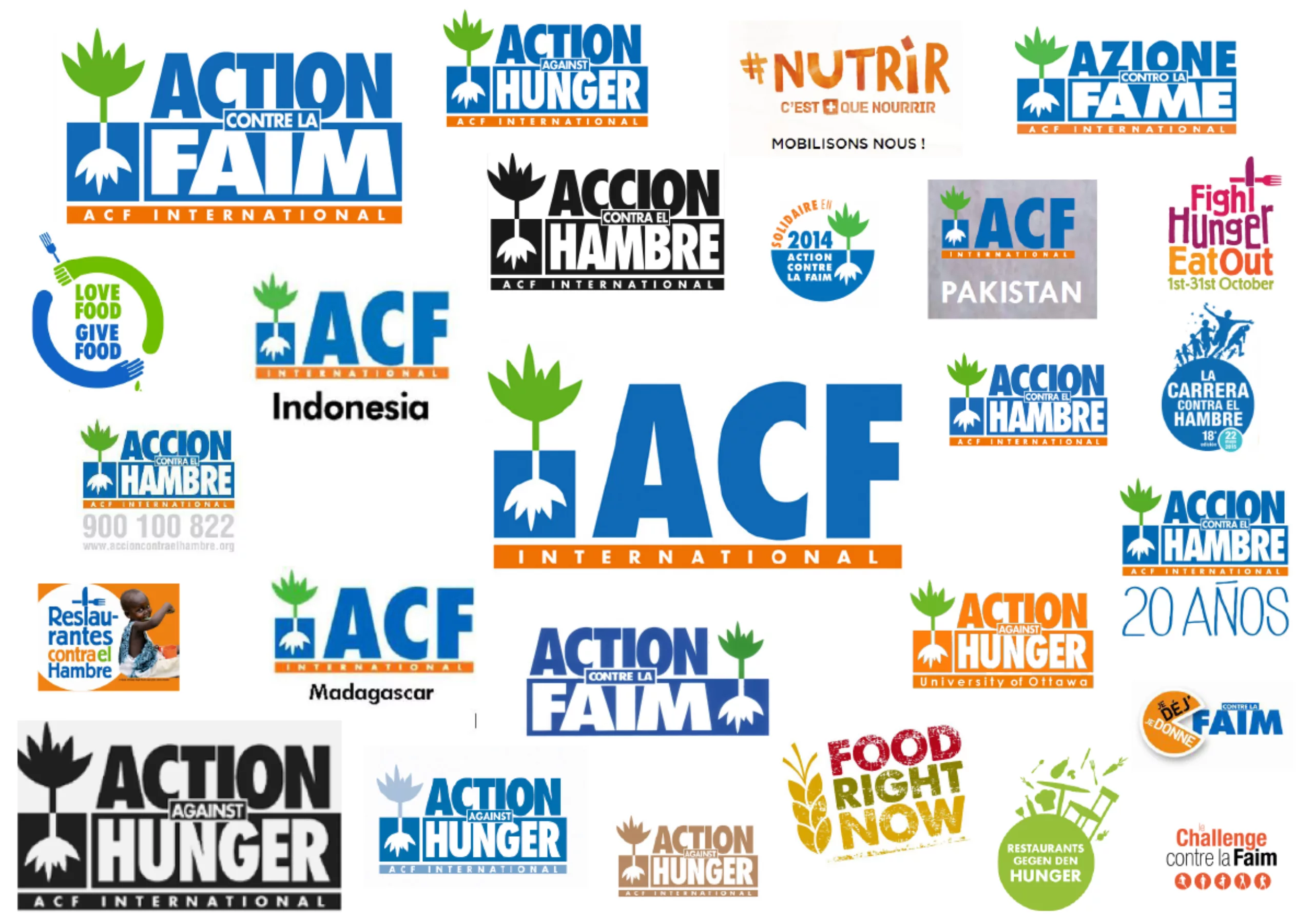 L’un des soucis rencontrés au travers des sondages, c’est que les initiales ACF (pour Action Contre la Faim) étaient utilisées dans plusieurs langues, et ne signifiaient pas grand chose pour les gens qui ne parlaient pas français et qui ne pouvaient décrypter l’acronyme. La question s’est posée d’utiliser soit l’acronyme ACF pour tous les pays, soit la version complète du nom dans la langue locale. C’est finalement la deuxième solution qui est choisie, arguant que le nom complet dans chaque langue serait beaucoup plus clair et compréhensible pour tous.