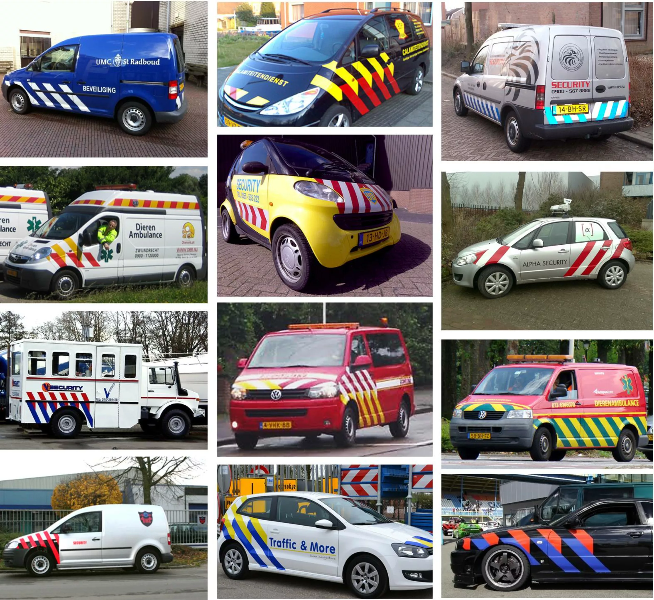 Il s’agit des “rayures BZK”. BZK pour “Ministerie van Binnenlandse Zaken” ( Ministère de l’Intérieur). C’est un projet commandé en 1992 par le ministère pour renforcer la visibilité des véhicules de Police. C’est le fameux Studio Dumbar qui se voit confier cette tache. Très vite, le succès de ce design est au rendez-vous, et l’ensemble des véhicules d’urgences ( pompier, ambulances…) en est aujourd’hui équipé.