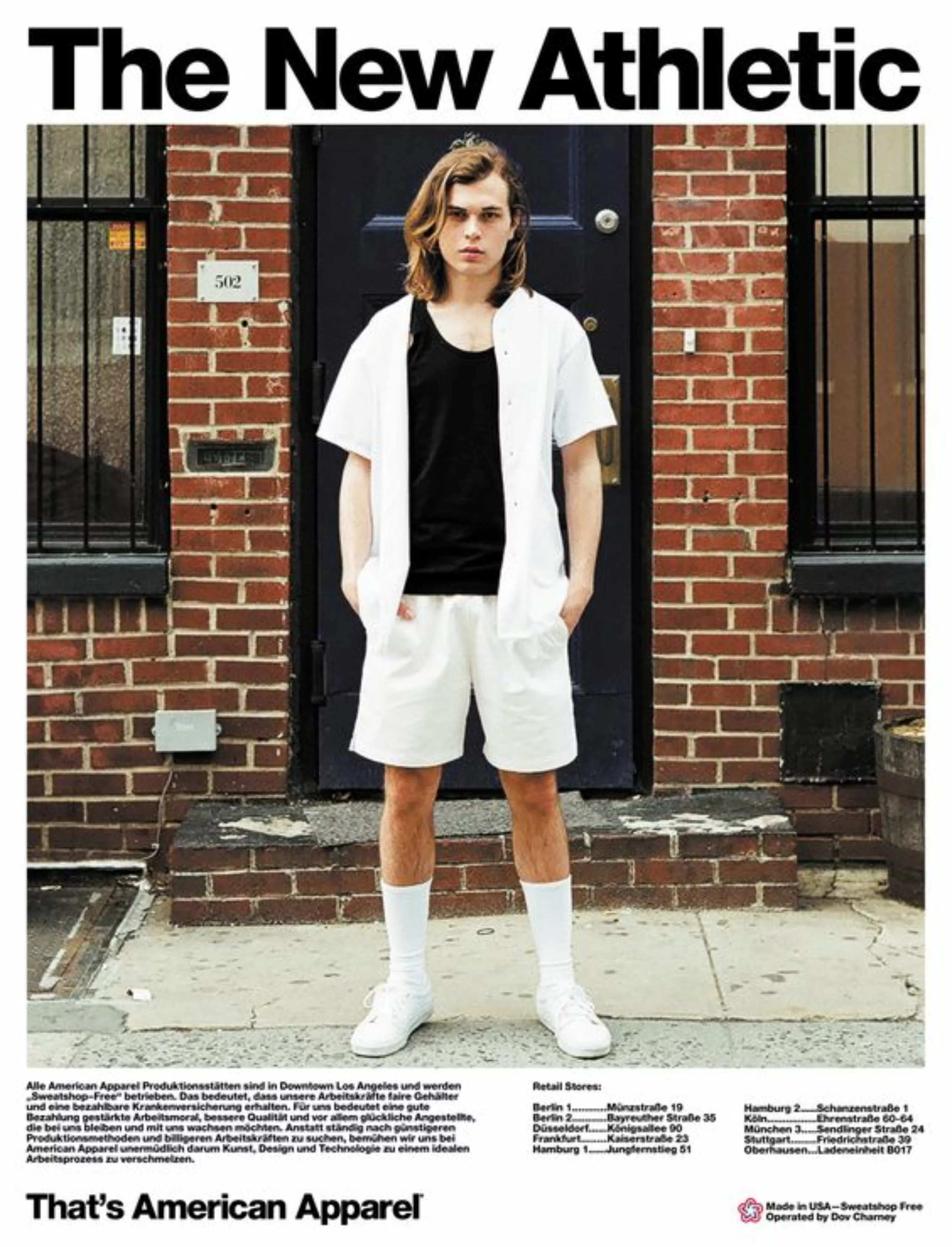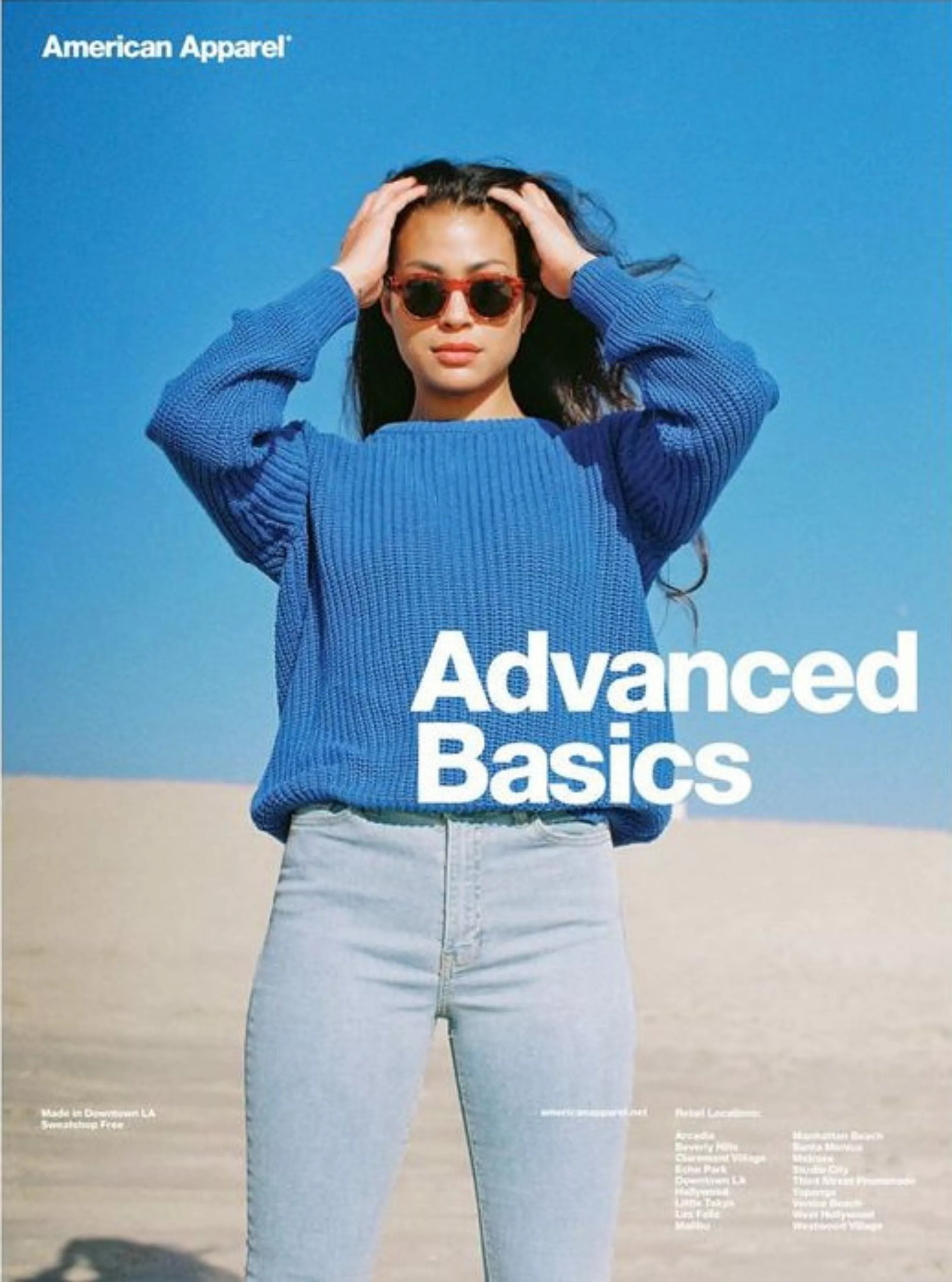 Encore du côté des vêtements mais avec une démarche inversée, American Apparel a su tirer profit de l’Helvetica. Là où Milltag choisissait de mettre en avant la typographie pour glorifier son caractère et sa notoriété, et Helvetica Mountain Pioneers d’utiliser son nom pour revendiquer des racines, la marque américaine utilise l’Helvetica pour célébrer la neutralité.