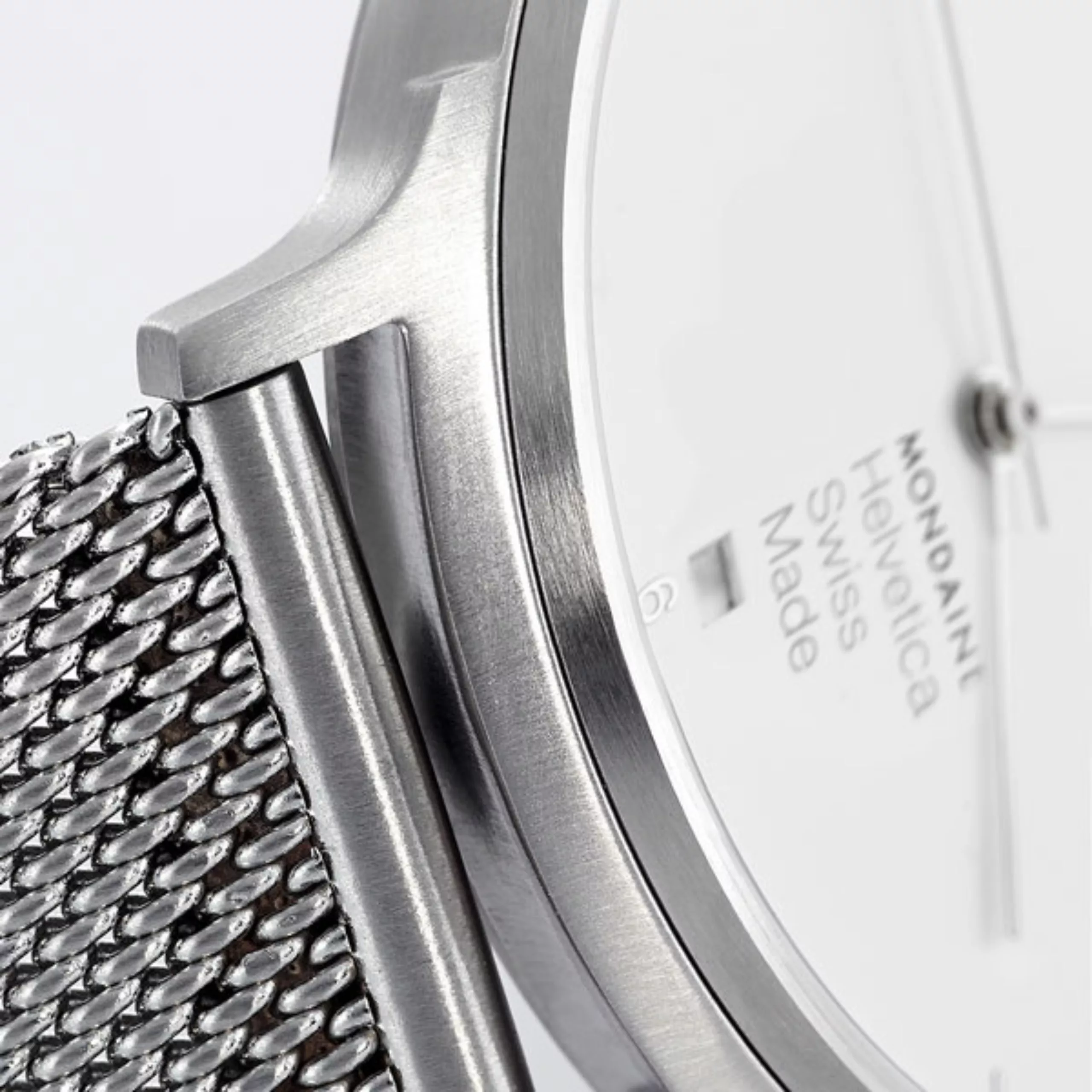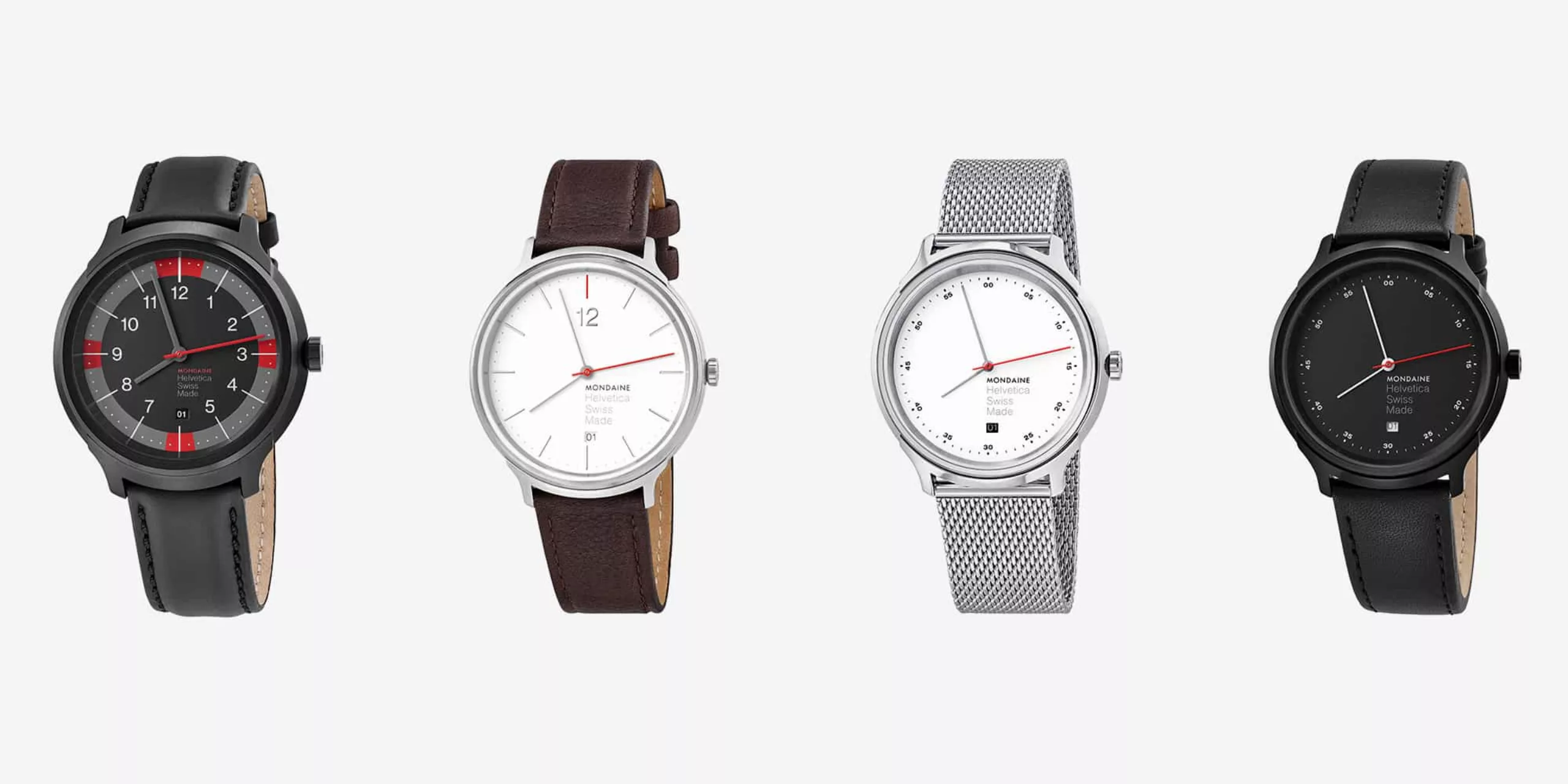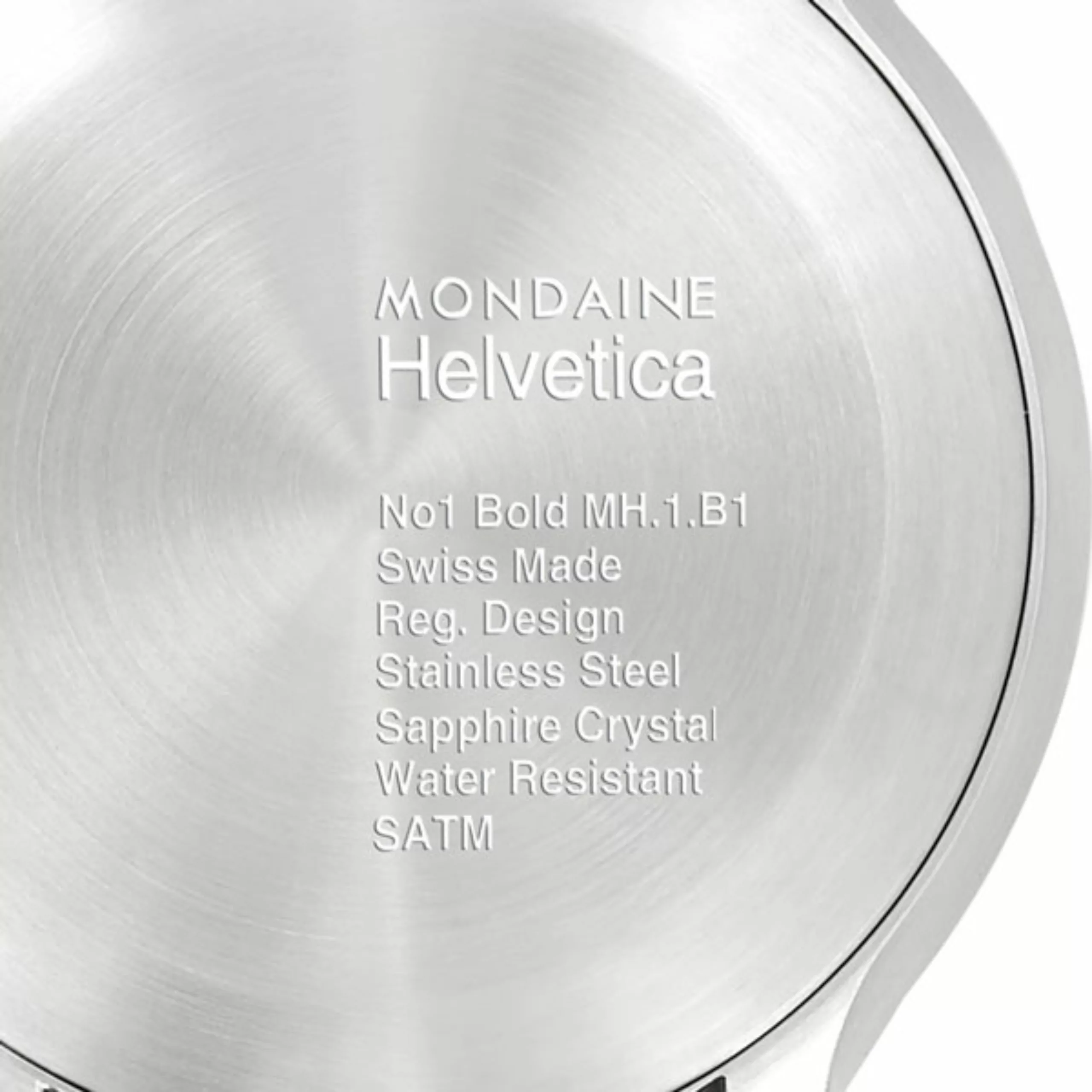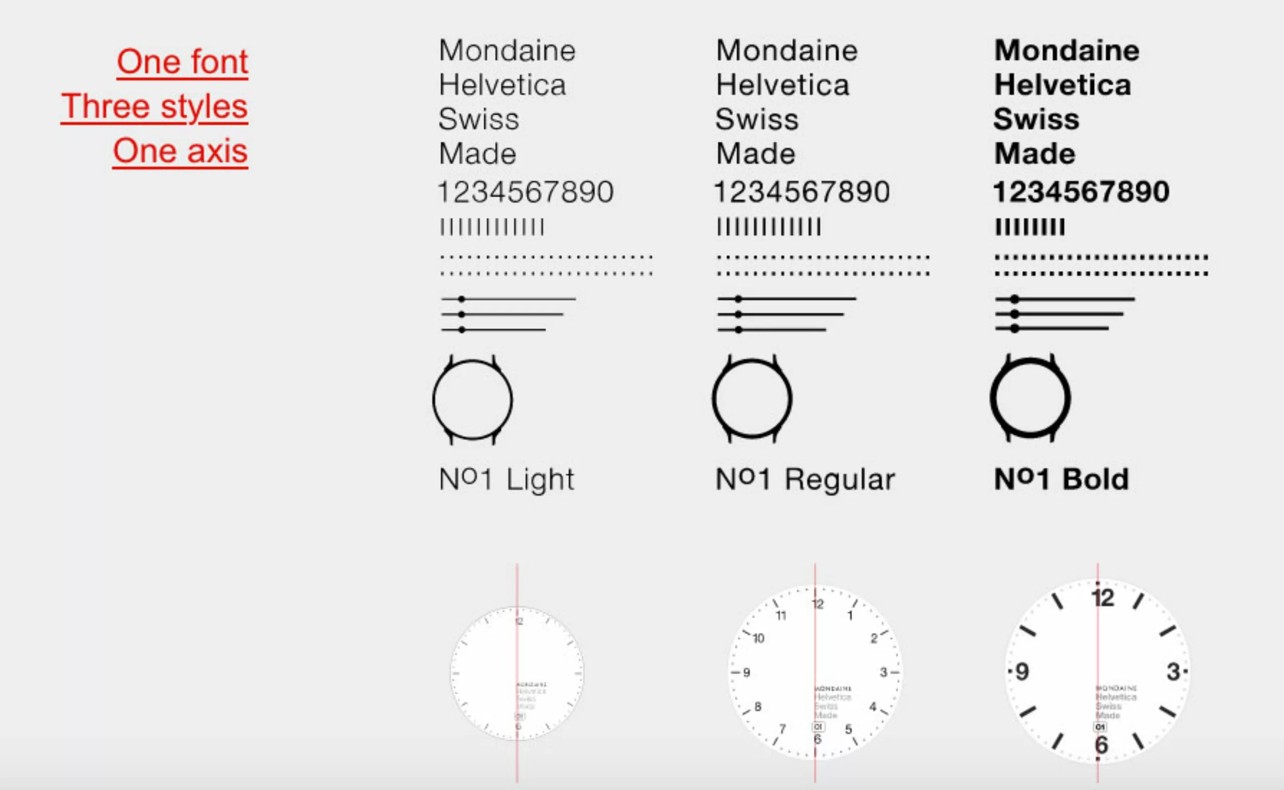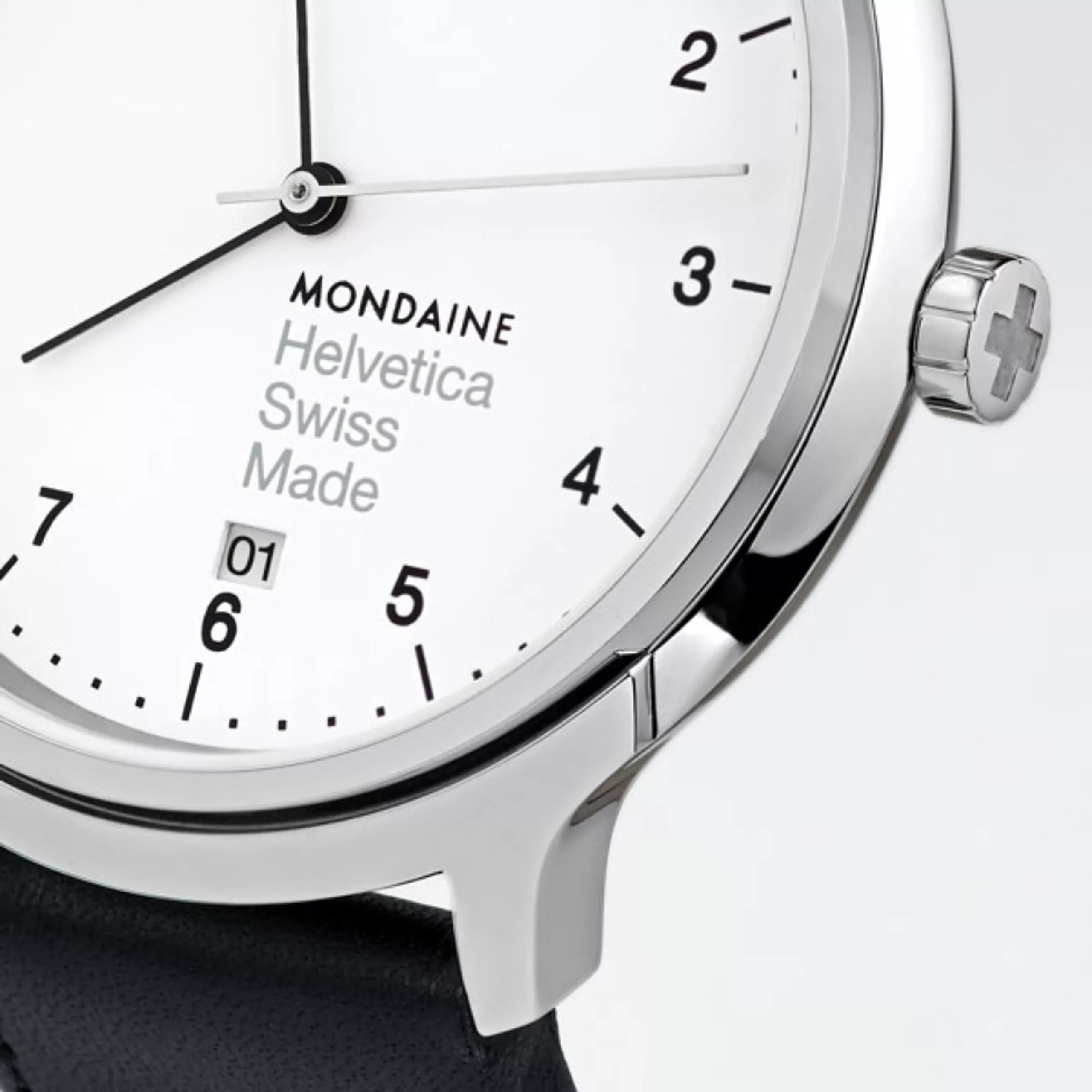 La marque l’écrit en toutes lettres, la typographie et la marque de montres partagent des valeurs communes : “une icône suisse, tradition, intemporalité, facile à lire, connue dans le monde, reconnaissable entre toutes”. On trouve les montres déclinées en 3 modèles : light, regular et bold sur le site mondaine-helvetica. Le chiffre 1 sert de détail d’attache pour le bracelet, pour les fins connaisseurs, et l’inscription des chiffres du cadran change de graisse suivant les modèles.