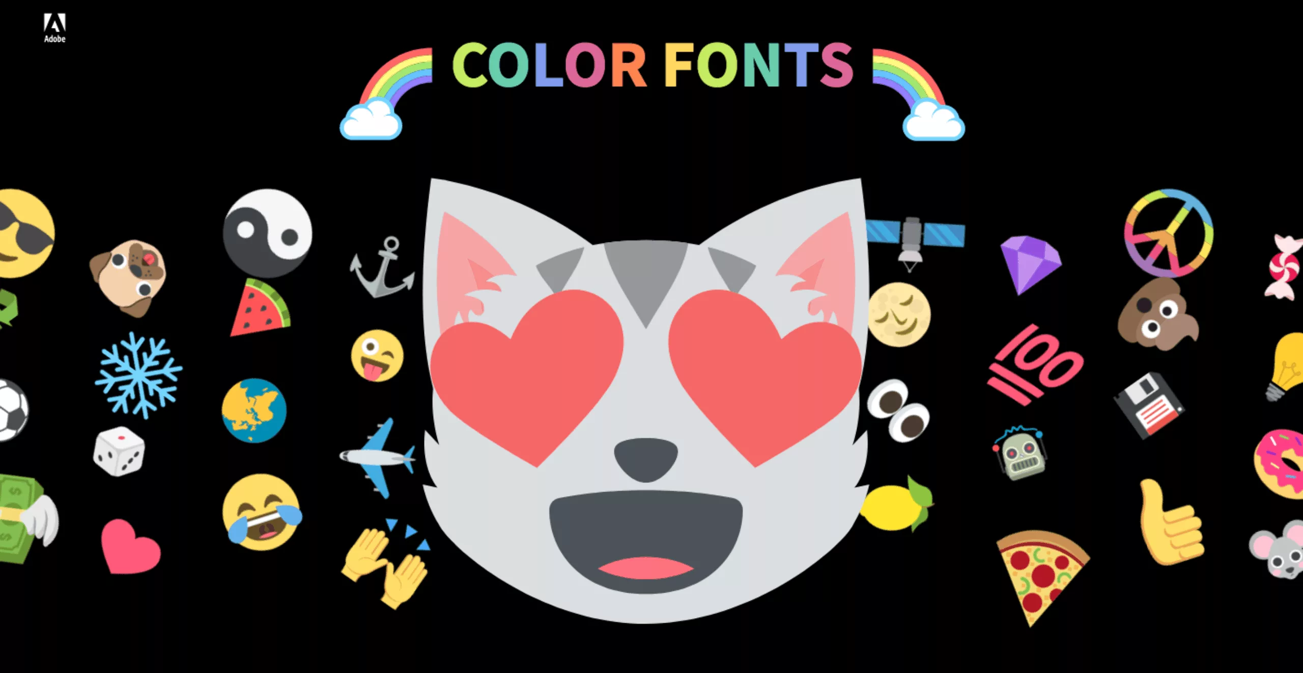 La technologie est censée fonctionner sur n’importe quel support. Elle est pour l’instant utilisable aussi sur Photoshop et Illustrator, mais pas encore InDesign ni sur tous les supports web. Elle permet aussi l’utilisation des émoticones directement dans la suite Adobe via colorfont. Si ça vous botte, Adobe vous explique comment installer les caractéristiques OpenType sur votre ordi.