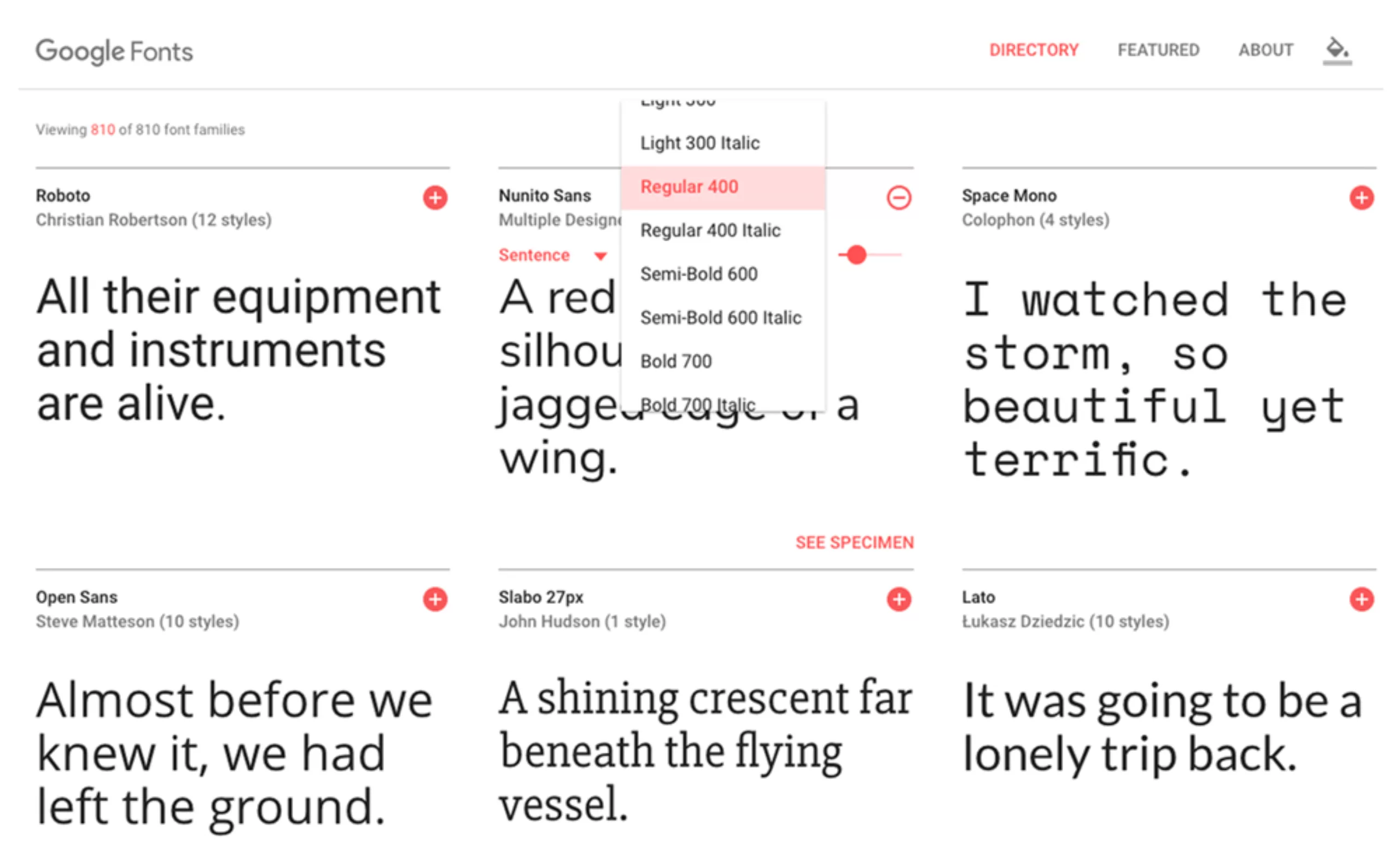 Aujourd’hui, les dossiers de typographies sont compartimentés en familles avec des sous-fichiers pour chaque type de graisse ou d’inclinaison. Classic, black, bold, medium, thin, extra light… bref, les dénominations ne manquent pas. Sur Google Fonts, dans la famille NunitoSans, je voudrais la Regular 400.