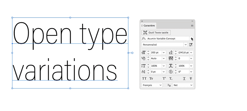 Dans illustrator, en cherchant une typographie, vous allez découvrir une petite icone “O var” comme Open Type Variation. Ensuite, vous pourrez voir un petit menu “T” apparaitre. En cliquant dessus vous pourrez alors piloter les différentes variations disponibles dans la typographie.