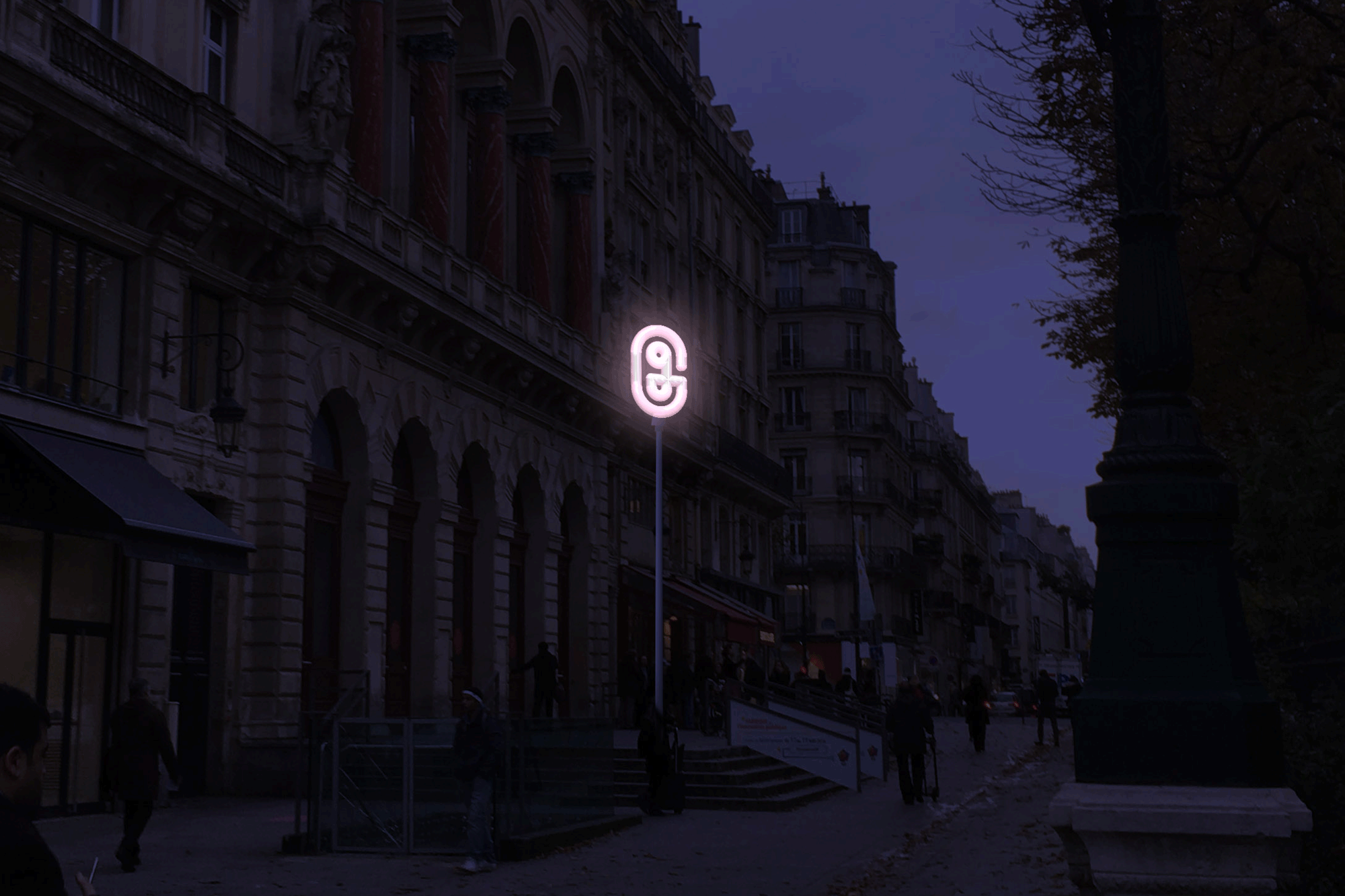 Un des objectifs de Yorgo pour le nouveau système visuel était de créer un signe adapté aux problématiques de repérage dans l’espace urbain pour permettre au public de mieux localiser la Gaité Lyrique dans Paris. La proposition s’accompagne donc d’une esquisse de totem au bout duquel est juché l’emblème dans une version lumineuse.