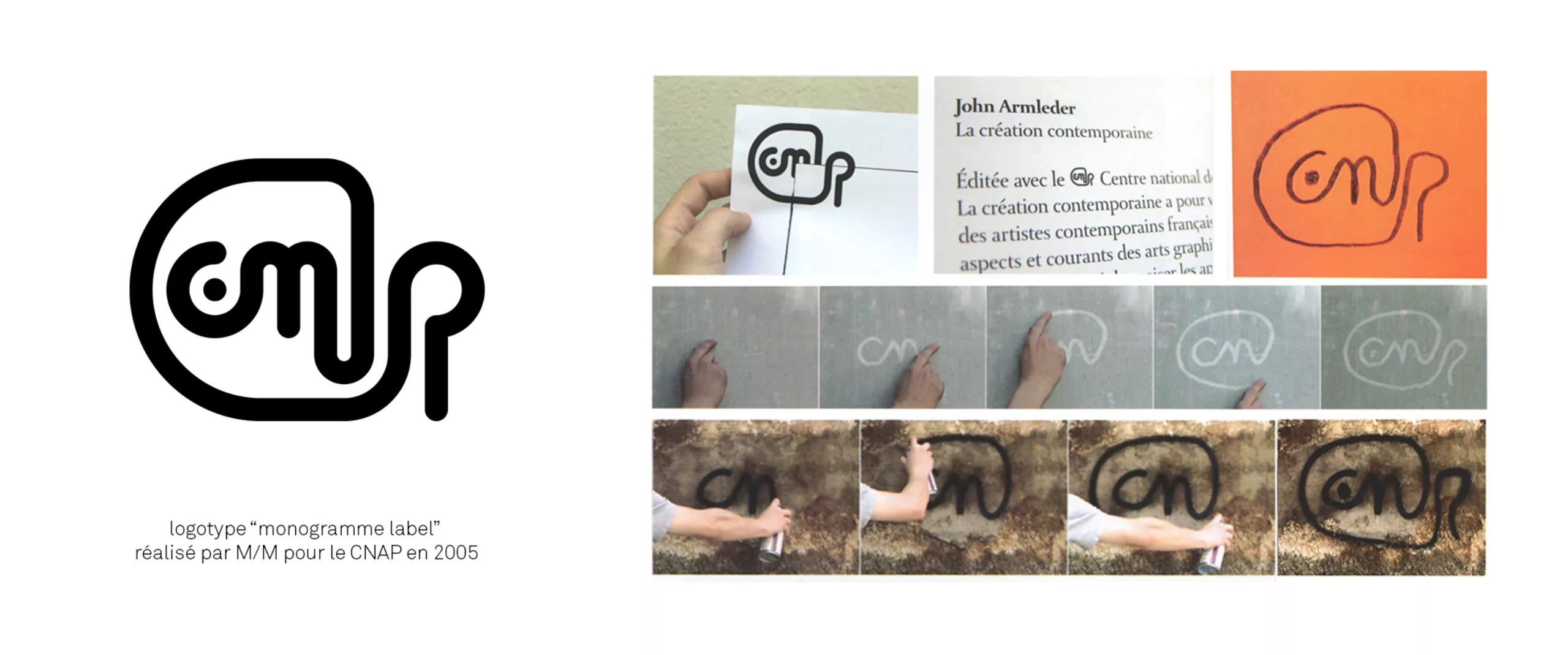 Un petit g dans un grand G, cela rappelle forcément le petit p dans le grand P du logotype du petit Palais par Apeloig. Mais dans une version tellement ronde et molle qu’on dirait le résultat d’une accouplement avec un logo du duo M/M. Le traitement rond et baroque de l’emblème rappelle beaucoup le style de M/M, notamment le très alambiqué logotype du CNAP réalisé en 2005. Dessiné en spirale, ce logo semble lui aussi avoir été inspiré par le graphisme concentrique d’une arobase.