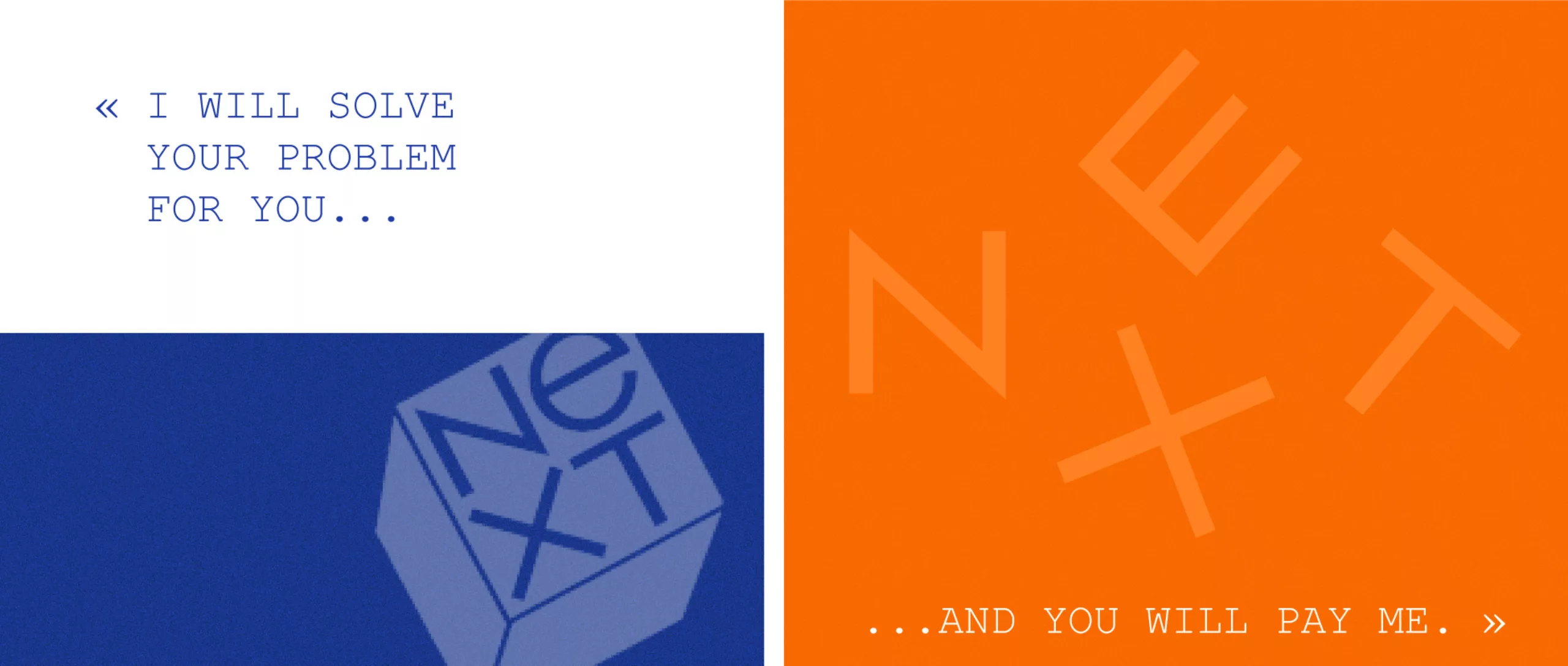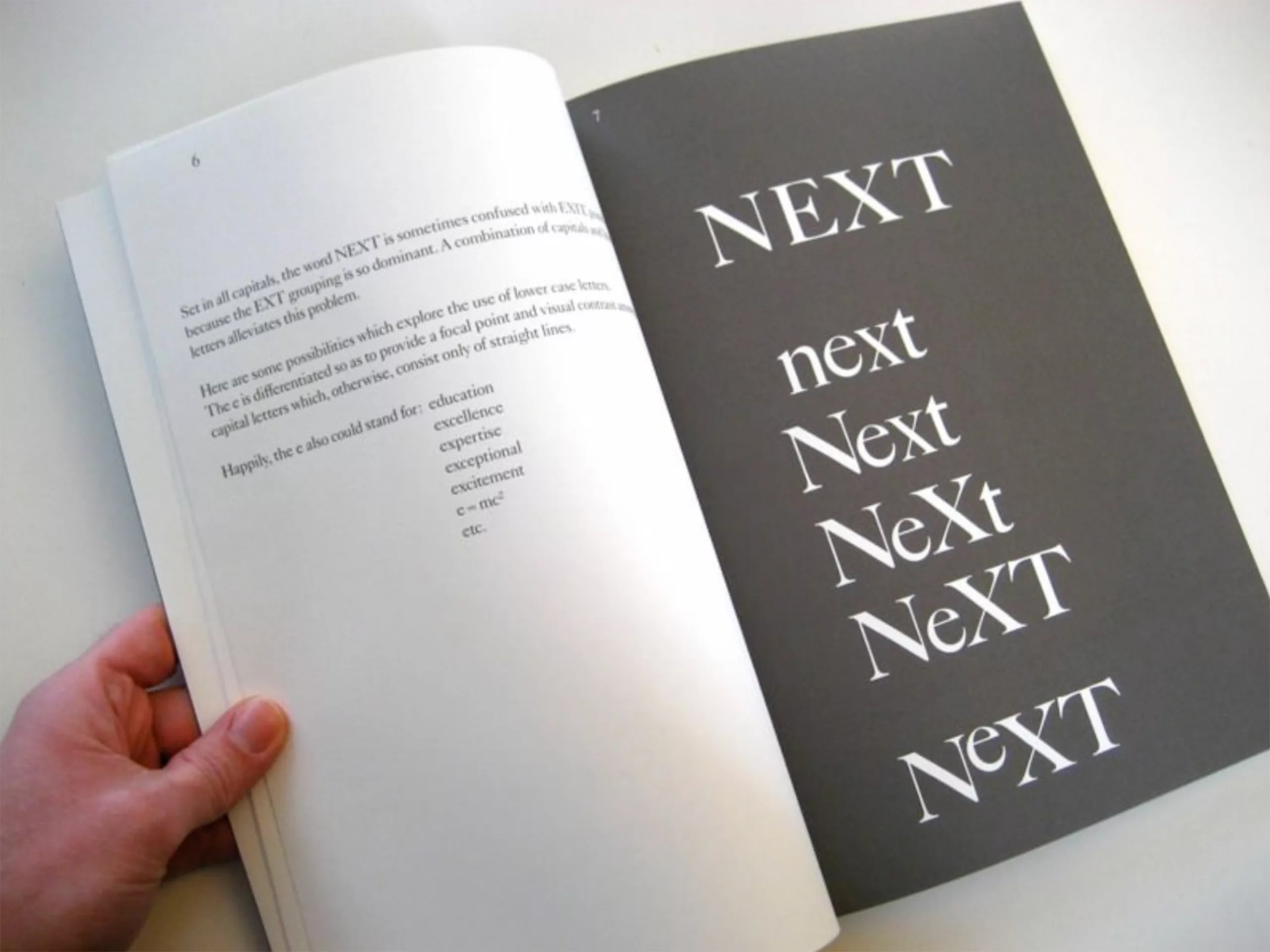 Dans son guide explicatif à destination du client, Paul Rand explique l’origine du choix qui a modifié Next en NeXT : la proximité du mot avec « Exit ». En incluant un « e » en bas de casse, qui avoisine des caractères en majuscules, le mot gagne un rythme nouveau et demande une autre forme de concentration du lecteur, qui lit alors le mot tel qu’il est vraiment écrit. À noter qu’aujourd’hui encore, on écrit NeXT dans du texte courant, comme s’il s’agissait s’un acronyme : le concept de Rand a dépassé le graphisme.