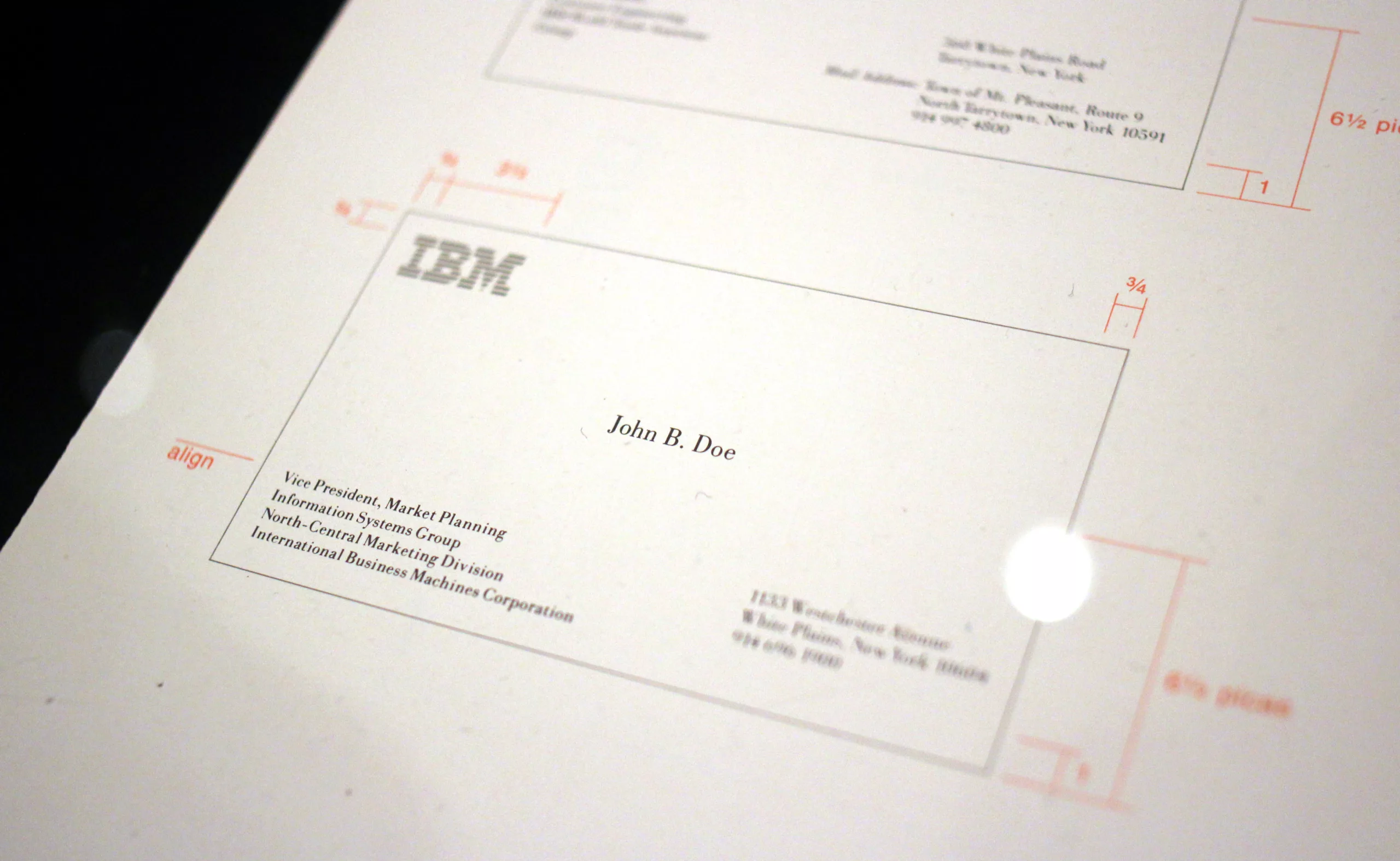 La mission de refonte d’IBM — soutenue par Thomas Watson Jr., le fils du fondateur de la société — transforme visuellement chaque aspect de l’entreprise, des machines à écrire électriques aux ordinateurs, en passant par la publicité et l’architecture. L’objectif est de casser avec une image conservatrice et de regarder vers l’avenir, pour illustrer le regain de croissance d’IBM. C’est parfaitement nouveau à l’époque. Watson fait appel à Eliot Noyes, un ancien collègue et architecte qui a entre autres travaillé sur la conception graphique du MoMa, qui met sur pied une équipe composée de Paul Rand (pour le graphisme), Eero Saarinen (architecture) et Charles et Ray Eames (scénographie, publications, vidéos).