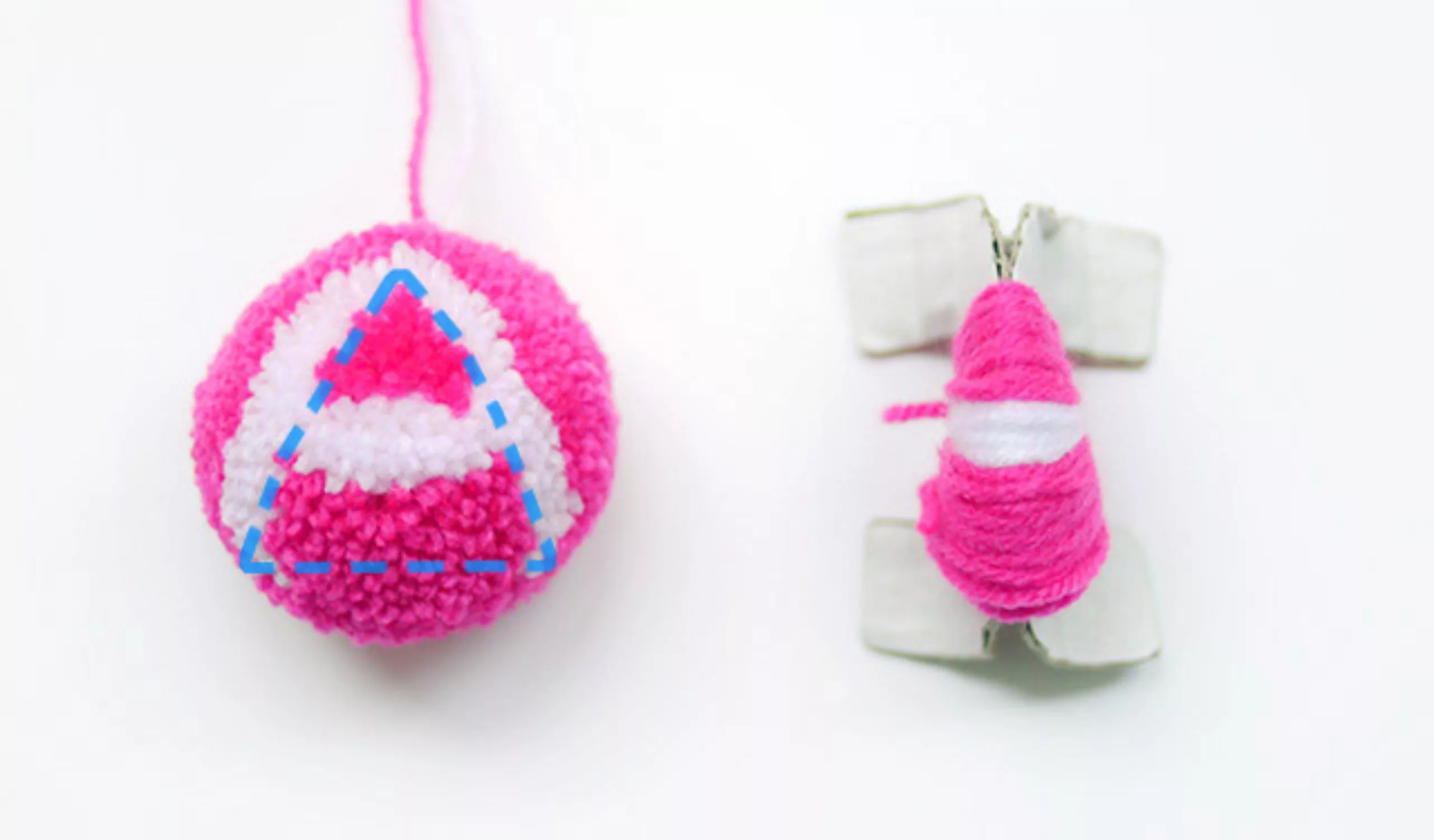 Ensuite, pour les barres latérales, on va enrouler 3 ou 4 couches de fil blanc, et terminer avec la couleur du fond pour terminer de donner de l’épaisseur au pompon.