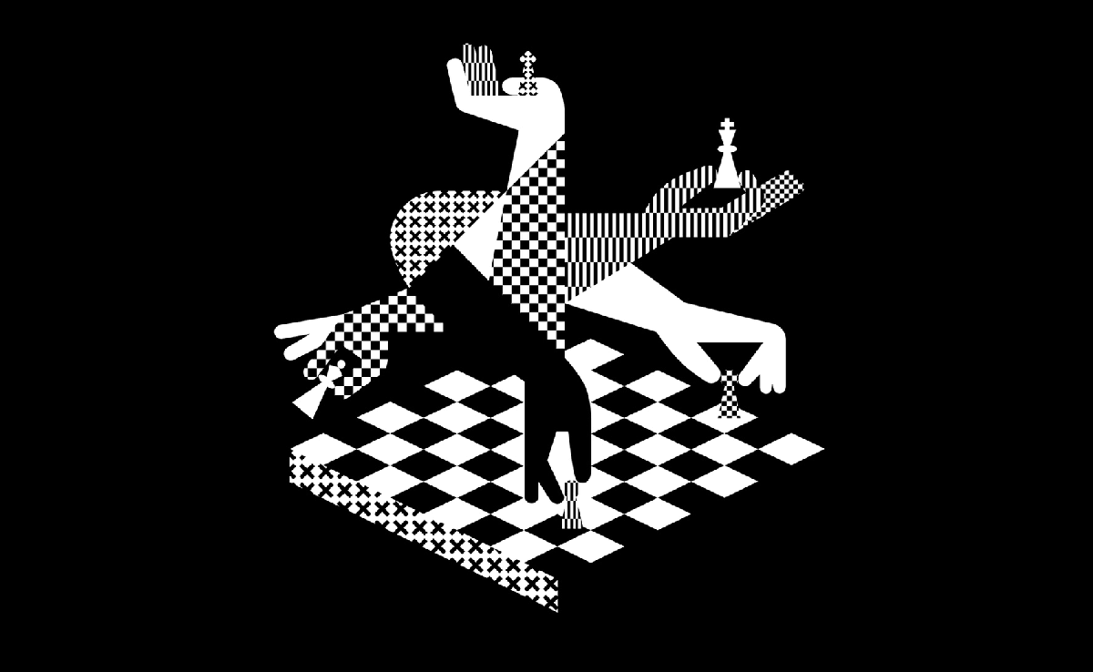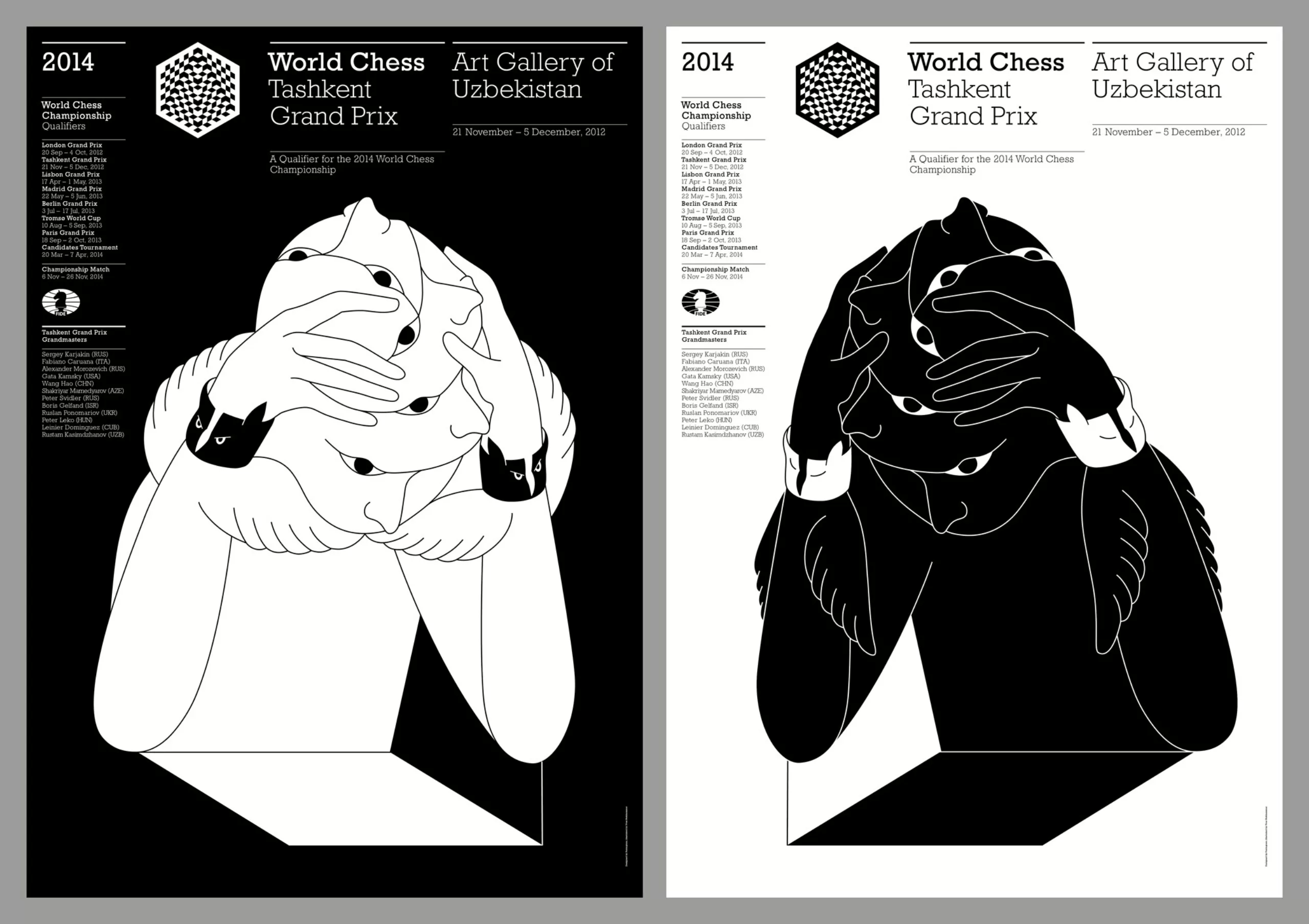 Ce visuel “controversé et branché” comme la ville hôte, représente deux joueurs d’échecs emmêlés qui font des pieds et des mains pour placer leurs pions. Minimaliste et en noir et blanc, l’affiche a déjà fait couler beaucoup d’encre, surtout sur les réseaux sociaux où l’on l’a qualifiée de “pawnographic” (pawn signifiant pion en anglais). Illustrée et conçue par Koltsov, DA et illustrateur de l’agence Shuka, elle pourrait aussi bien être un clin d’oeil à la page du crocodile du Codex Seraphinianus qu’aux tableaux de Vasarely.