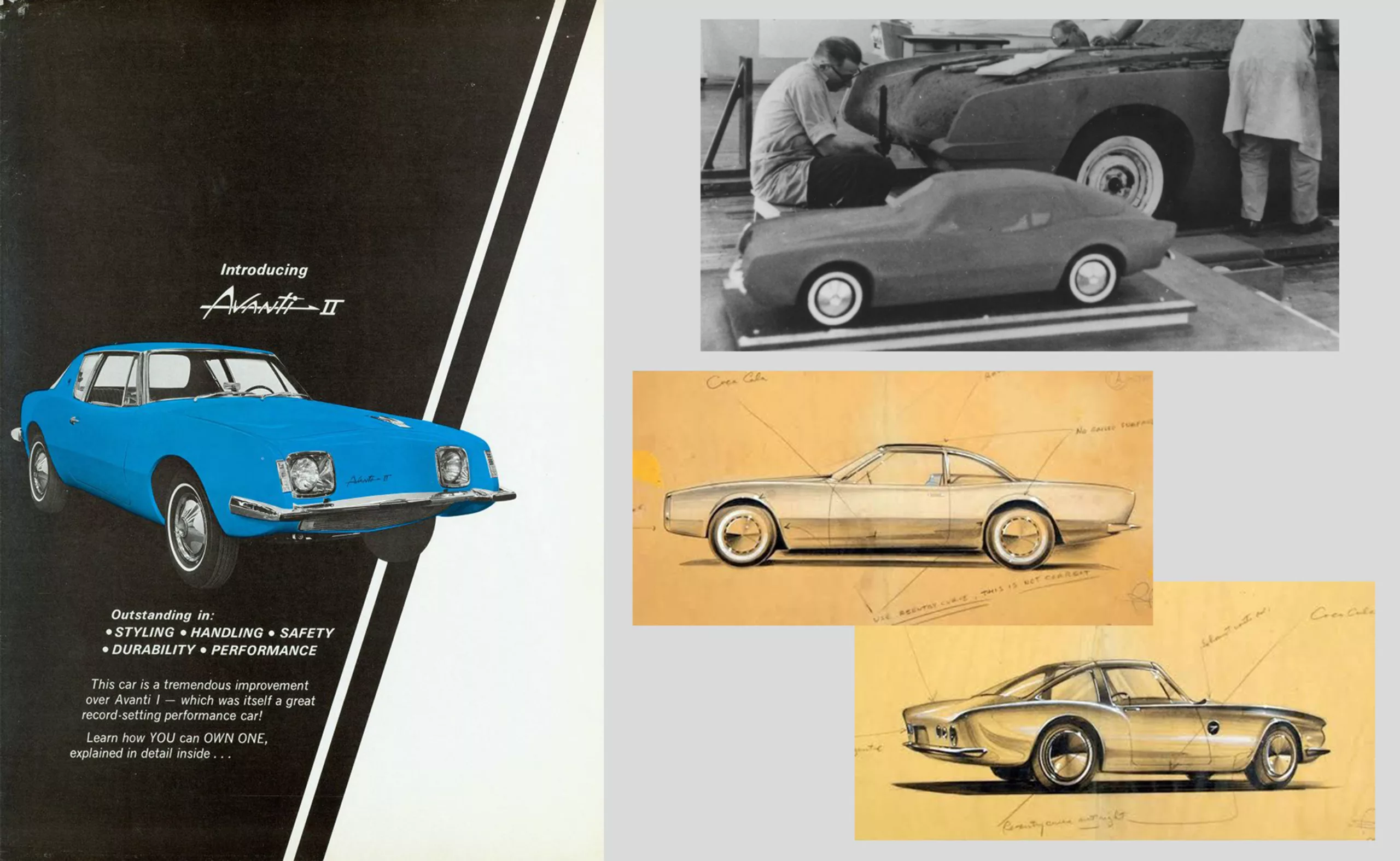 Croquis, modèle en glaise et publicité de la Studebaker Avanti II
