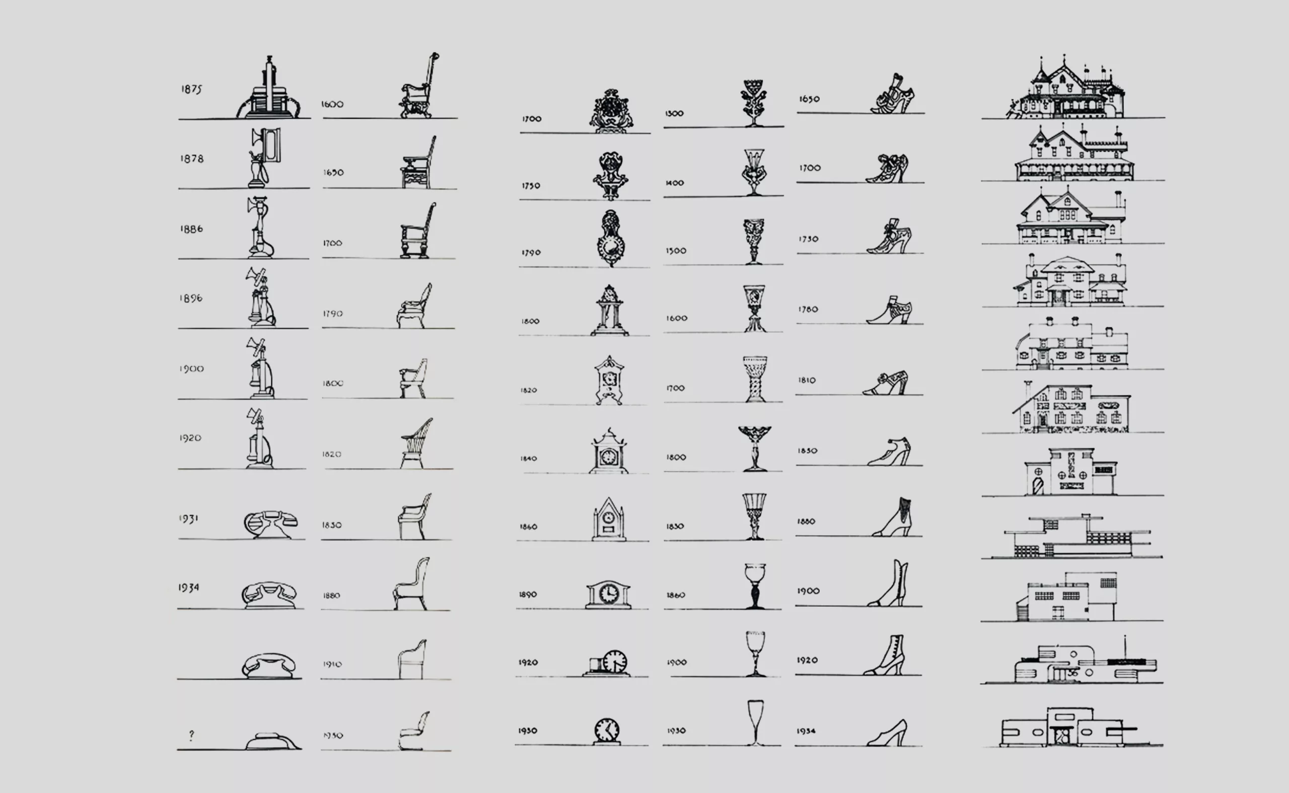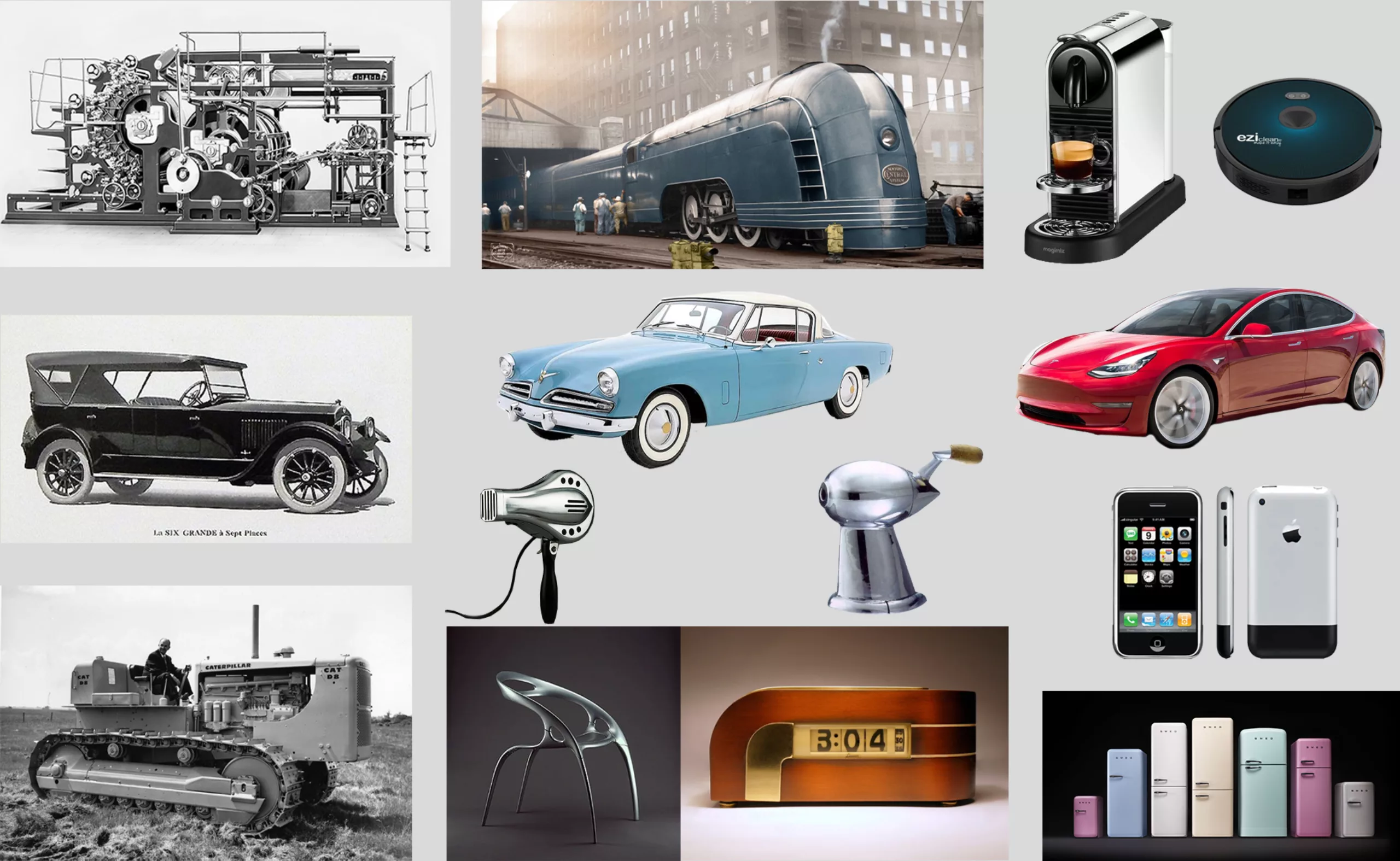 Design industriel post 1925, à gauche — design streamline 1930-1970, au milieu — design connecté “smart” d’aujourd’hui, à droite