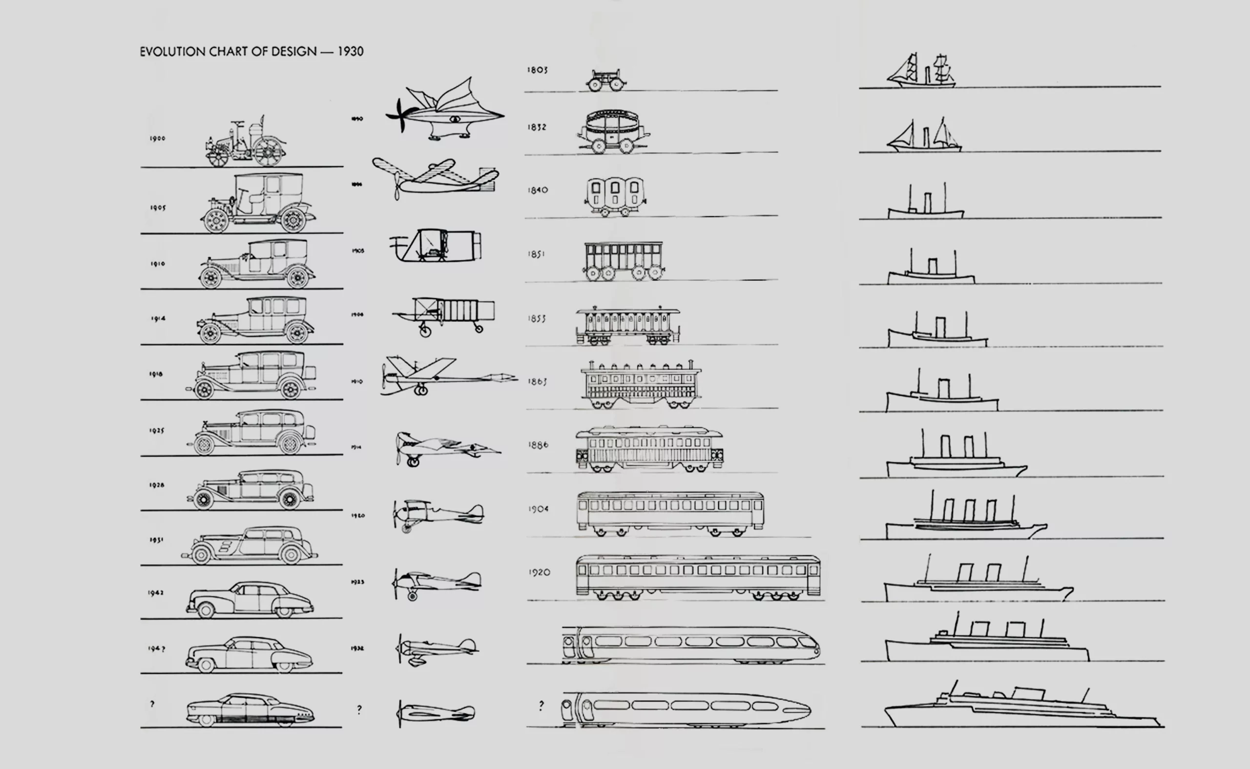 Dans son livre Industrial Design, Loewy s’était d’ailleurs amusé à penser l’évolution des objets et transports du quotidien, en allant vers un avenir de plus en plus simplifié et minimaliste, en se positionnant comme un acteur majeur de cette évolution :
