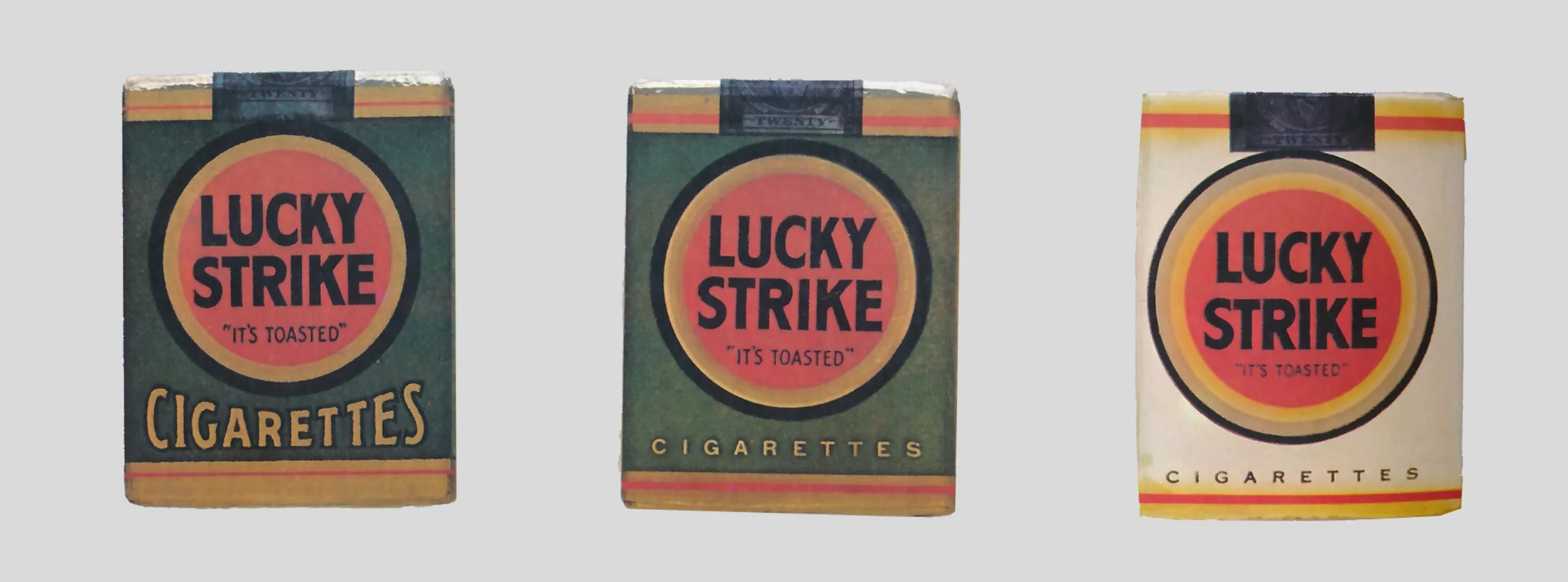 Autre coup de maître pour les cigarettes Lucky Strike : il ne change pas vraiment le logo (mais troque le vert pour un blanc plus pur) mais le fait apparaître sur les deux faces, qui sont ainsi visibles à coup sûr sur une table. Il déplace aussi le texte administratif que personne ne lit sur les tranches du paquet.