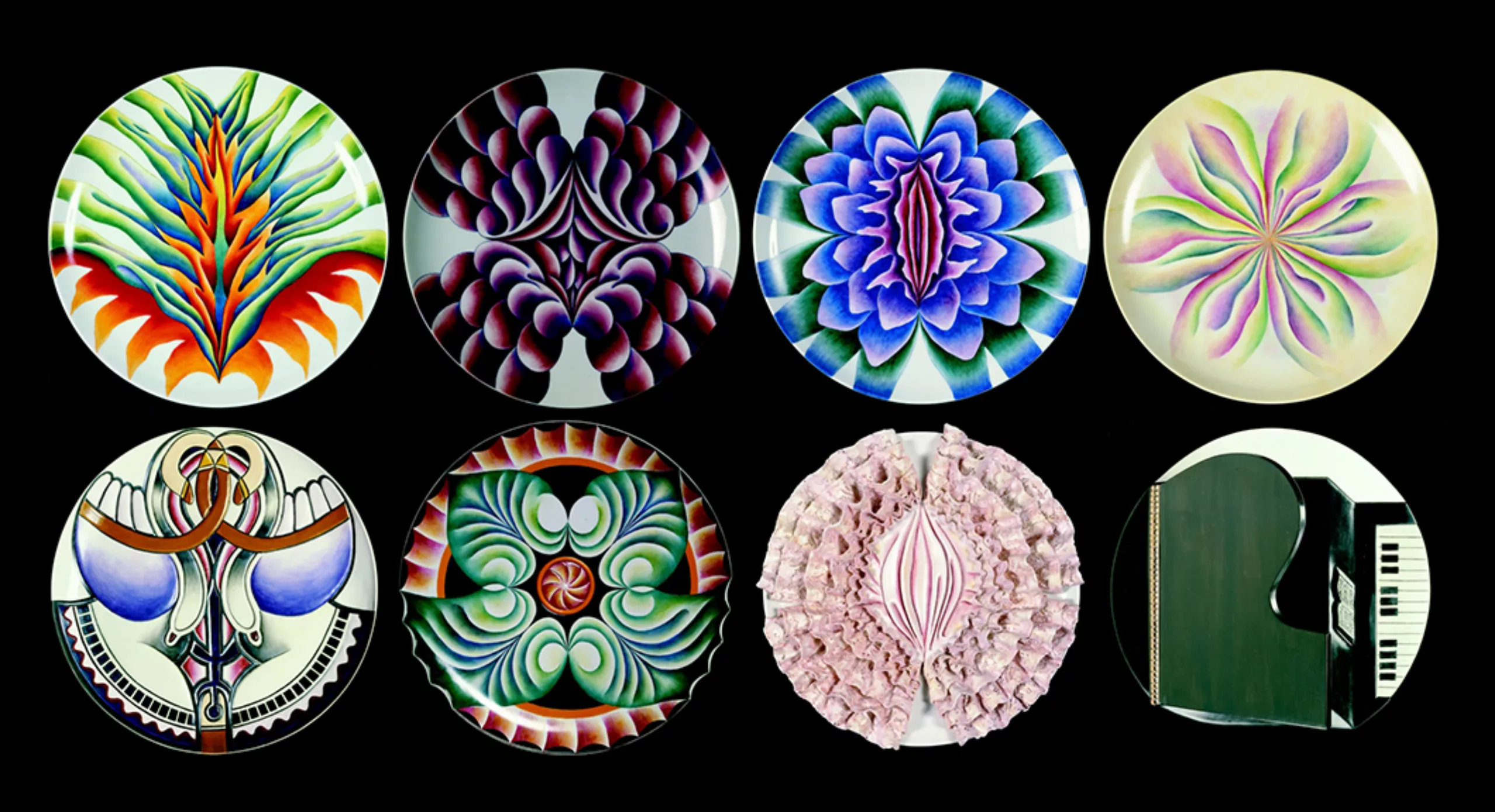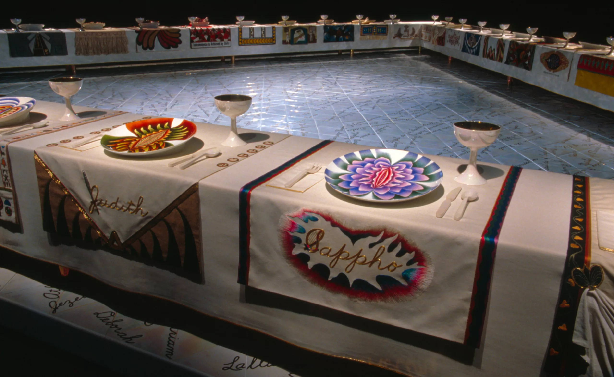 En 1974, n’en déplaise à Freud, une autre femme artiste s’attelle pendant plus de 5 ans à rendre hommage aux figures féminines. The Dinner Party” de Judy Chicago représente un gigantesque banquet triangulaire où président des femmes ayant marqué l’Histoire, de la préhistoire aux révolutions féminines. Dessus, 39 assiettes de porcelaine aux allures de sexe féminin sont disposées, accompagnés de couverts et calices dorés agencés sur des napes brodées aux noms des 39 femmes.