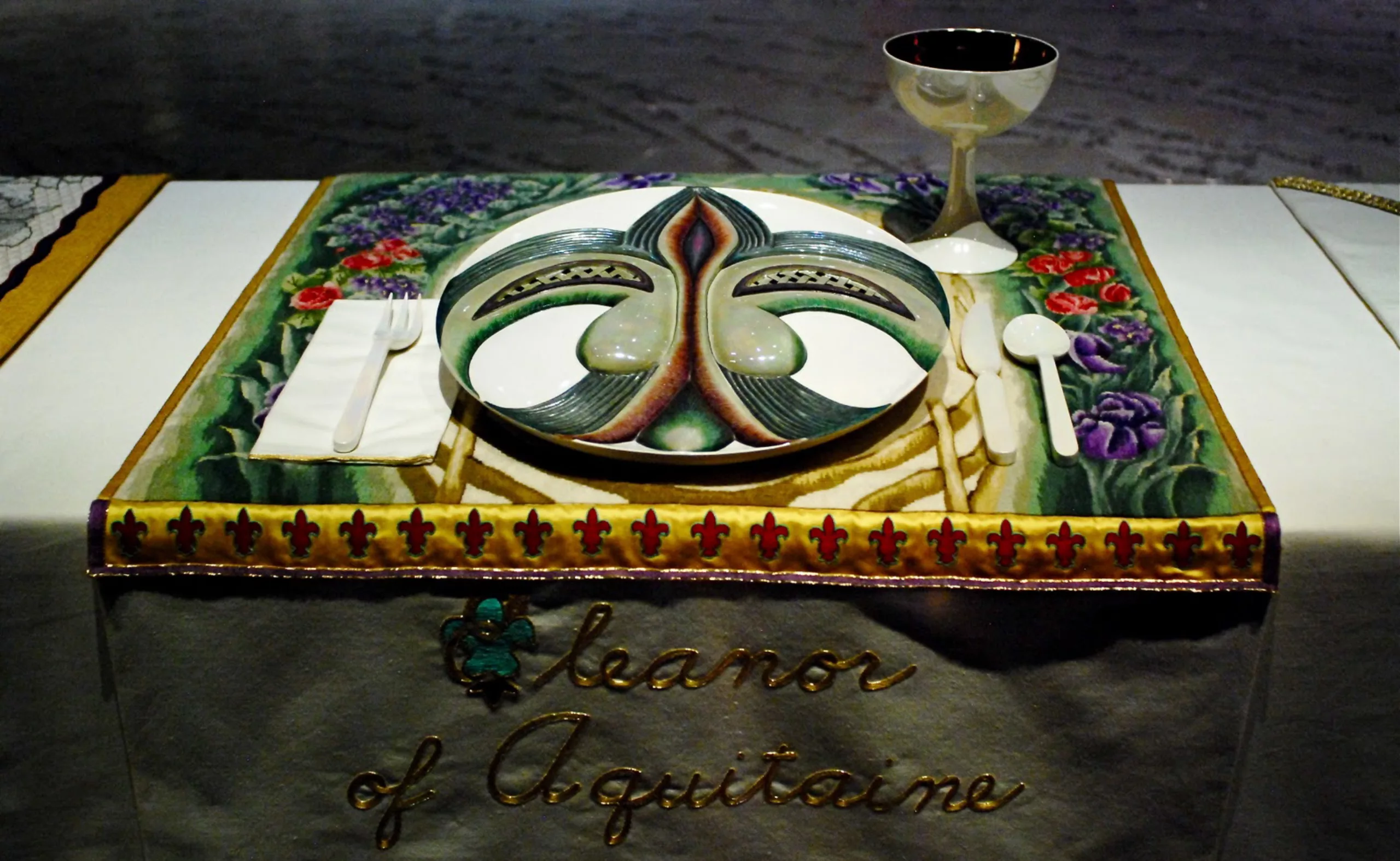 Au total, 1 038 déesses, femmes mythologiques ou historiques sont mises à l’honneur. 999 noms sont inscrits en doré sur le carrelage et accompagnés de panneaux explicatifs, pour faire briller les 39 autres installées à table. Celles qui sont au sol illustrent, d’après l’artiste, “la lutte d’une myriade de femmes pour devenir célèbres ou faire entendre leurs idées -parfois face à des obstacles écrasants- pour que leurs réalisations durement gagnées soient finalement (comme les femmes à table) marginalisées ou effacées“.