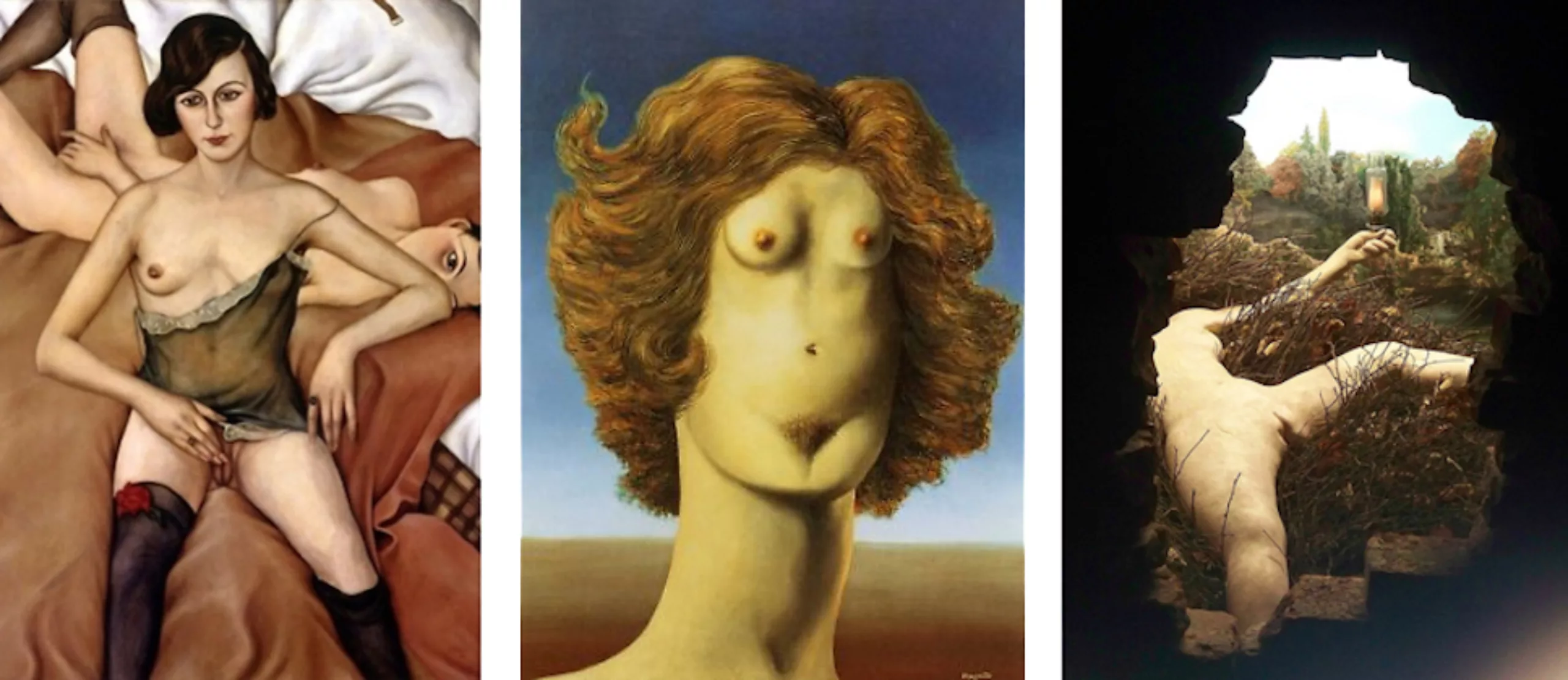 Mais s’il est fantasmé, exutoire ou provocateur, cet art reste encore lié au plaisir… des hommes. Les “Deux filles” de Schad sont en plein acte, sous les yeux d’un homme discret dont seul le bracelet de montre apparaît en haut du tableau. La figure du “Viol” de Magritte est rousse -symbole de la tentation ou de l’impureté- et nous transforme malgré nous en voyeurs-violeurs. Quant à “Étant donnés” de Duchamp, l’oeuvre ne peut être vue qu’a travers la fente d’un judas de porte, comme une mise en abyme des mystères insondables du sexe féminin.