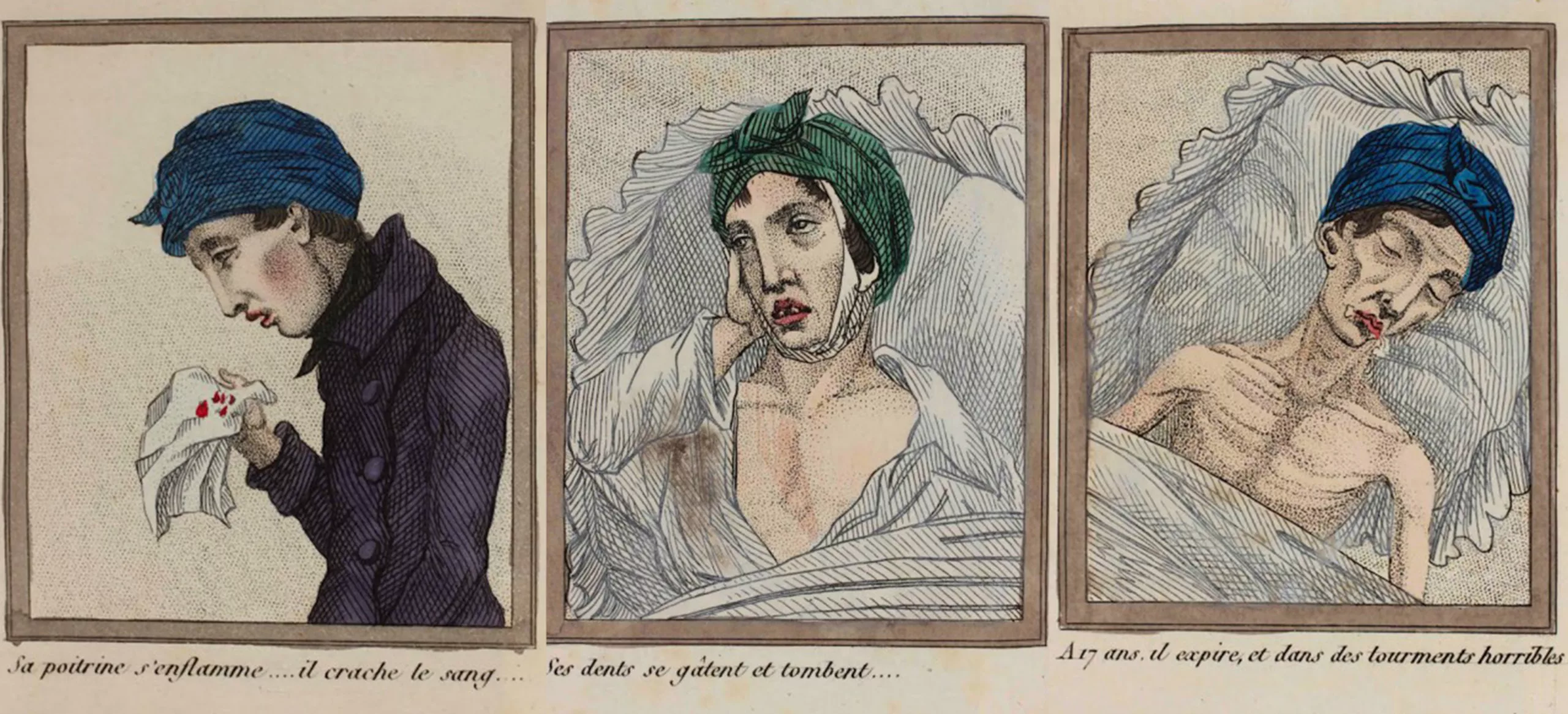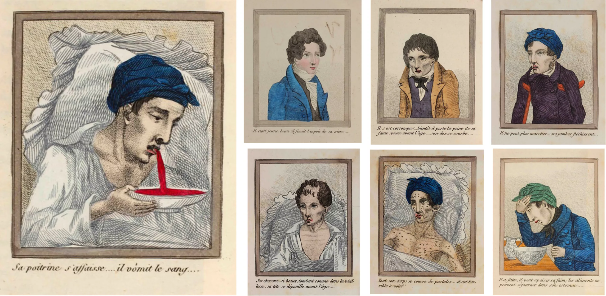 Les illustrations ci-dessous sont tirées du Livre sans Titre (sur un sujet dont-on-ne-doit-pas-prononcer-le-nom, un peu comme Voldemort) dans lequel on voit un homme “jeune et beau qui faisait de l’espoir à sa mère” vomir le sang, perdre ses dents et se couvrir de pustules pour finalement mourir “dans des tourments horribles.
